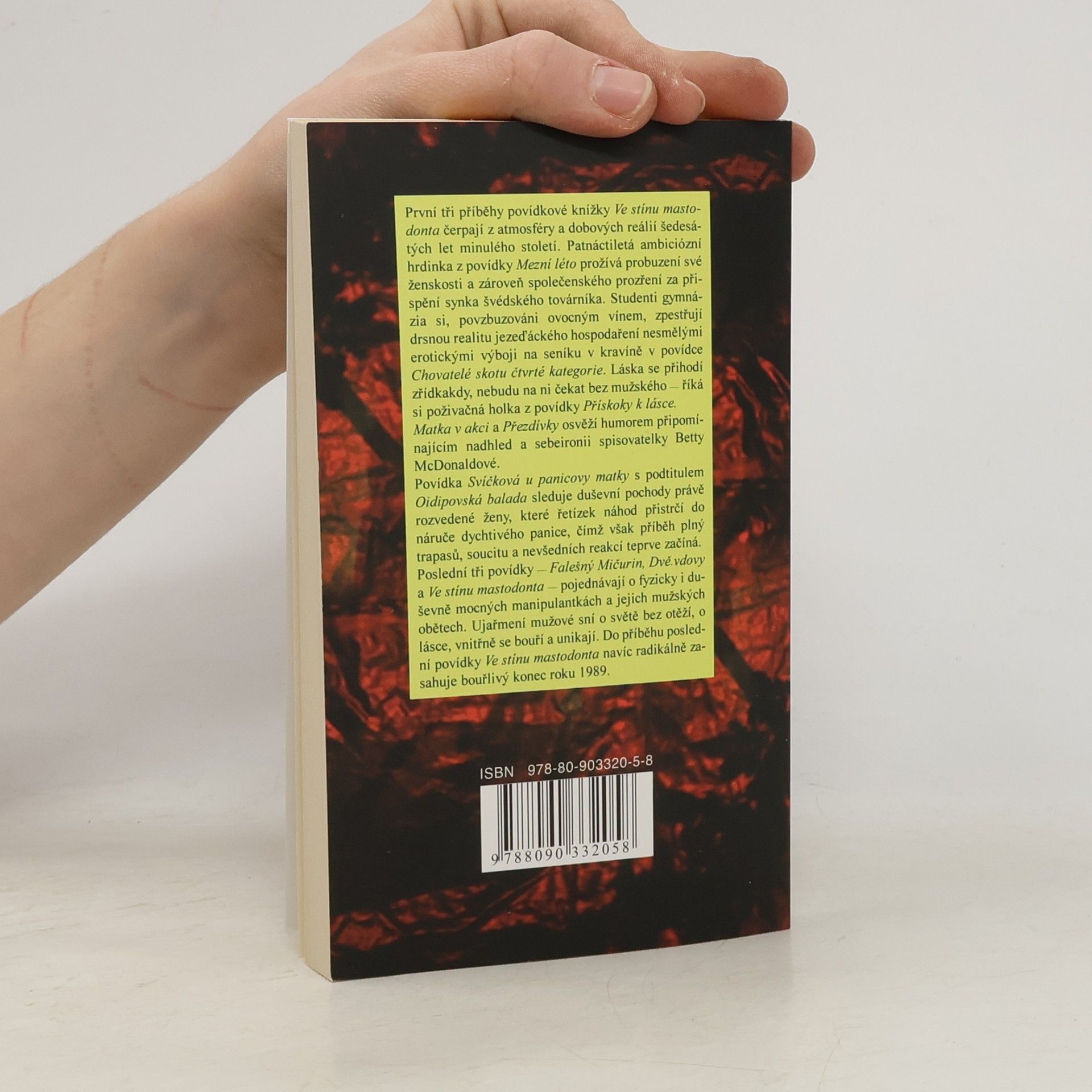Kniha povídek autorky bestselleru "Bereme, co je". První tři příběhy povídkové knížky Ve stínu mastodonta čerpají z atmosféry a dobových reálií šedesátých let minulého století. Patnáctiletá ambiciózní hrdinka z povídky Mezní léto prožívá probuzení své ženskosti a zároveň společenského prozření za přispění synka švédského továrníka. Studenti gymnázia si, povzbuzováni ovocným vínem, zpestřují drsnou realitu jezeďáckého hospodaření nesmělými erotickými výboji na seníku v kravíně v povídce Chovatelé skotu čtvrté kategorie. Láska se přihodí zřídkakdy, nebudu na ni čekat bez mužského — říká si poživačná holka z povídky Přískoky k lásce. Matka v akci a Přezdívky osvěží humorem připomínajícím nadhled a sebeironii spisovatelky Betty McDonaldové. Povídka Svíčková u panicovy matky s podtitulem Oidipovská balada sleduje duševní pochody právě rozvedené ženy, které řetízek náhod přistrčí do náruče dychtivého panice, čímž však příběh plný trapasů, soucitu a nevšedních reakcí teprve začíná. Poslední tři povídky — Falešný Mičurin, Dvě vdovy a Ve stínu mastodonta — pojednávají o fyzicky i duševně mocných manipulantkách a jejich mužských obětech. Ujařmení mužové sní o světě bez otěží, o lásce, vnitřně se bouří a unikají. Do příběhu poslední povídky Ve stínu mastodonta navíc radikálně zasahuje bouřlivý konec roku 1989.