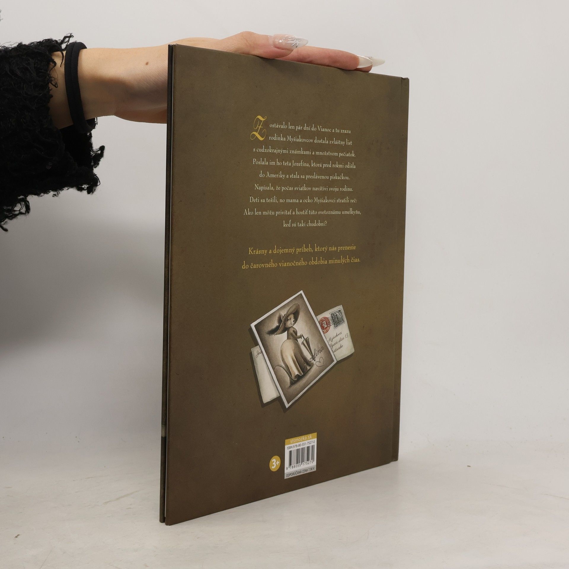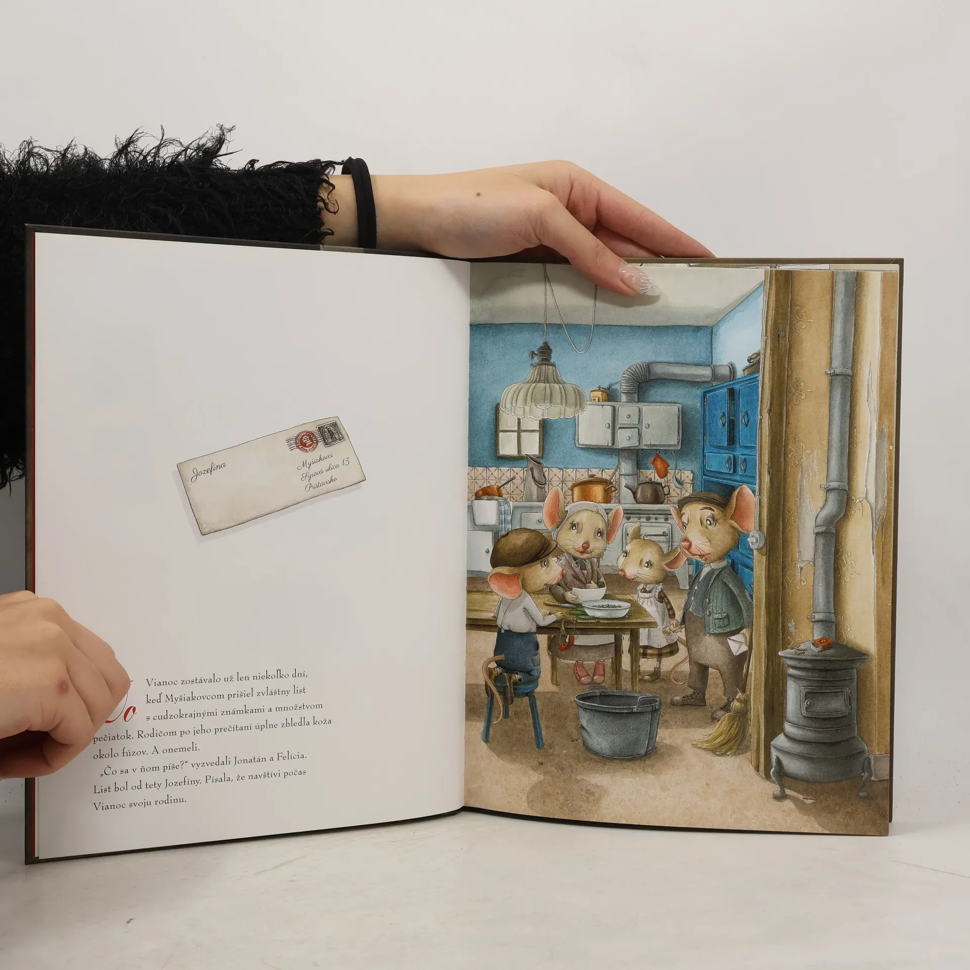 Krásny a dojemný rozprávkový príbeh, ktorý nás prenesie do čarovného vianočného obdobia minulých čias. Zostávalo len pár dní do Vianoc a tu zrazu rodinka Myšiakovcov dostala zvláštny list s cudzokrajnými známkami a množstvom pečiatok. Poslala im ho teta Jozefína, ktorá pred rokmi odišla do Ameriky a stala sa preslávenou pískačkou. Napísala, že počas sviatkov navštívi svoju rodinu. Deti sa tešili, no mama a ocko Myšiakovci stratili reč: Ako len môžu privítať a hostiť túto svetoznámu umelkyňu, keď sú takí chudobní? Pôvabné obrázky na obálke aj vnútri knižky pohladia dušu malým aj veľkým. Akoby mávnutím prútika sa ocitneme v časoch, ktoré si zo svojho detstva pamätajú naši starí či prastarí rodičia. Oblečenie myšiek, zariadenie domácnosti alebo myšacích obchodíkov, všetko je verne zobrazené, ako to bolo kedysi. A zo všetkého dýcha nežná nostalgia a láskavosť. Pre čitateľov od 3 rokov