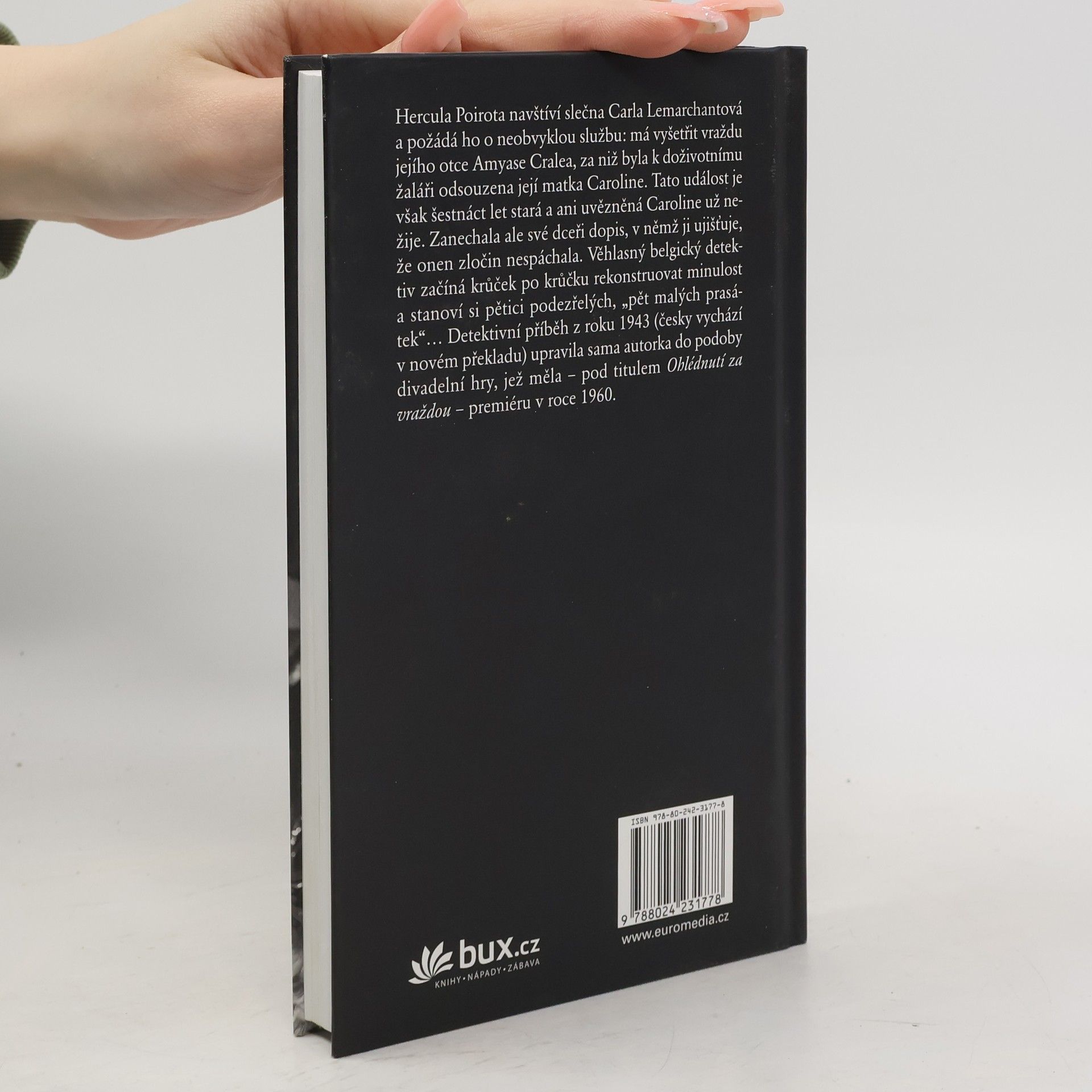 Hercula Poirota navštíví slečna Carla Lemarchantová a požádá ho o neobvyklou službu – má vyšetřit vraždu jejího otce Amyase Cralea, za niž byla k doživotnímu žaláři odsouzena její matka Caroline. Tato událost je však šestnáct let stará a ani uvězněná Caroline už nežije. Zanechala ale své dceři dopis, v němž ji ujišťuje, že onen zločin nespáchala. Poirot krůček po krůčku rekonstruuje minulost a stanoví si pětici podezřelých, „pět malých prasátek“. Detektivní příběh z roku 1943 (česky vychází v novém překladu) upravila sama autorka do podoby divadelní hry, jež měla – pod titulem Ohlédnutí za vraždou – premiéru v roce 1960.
