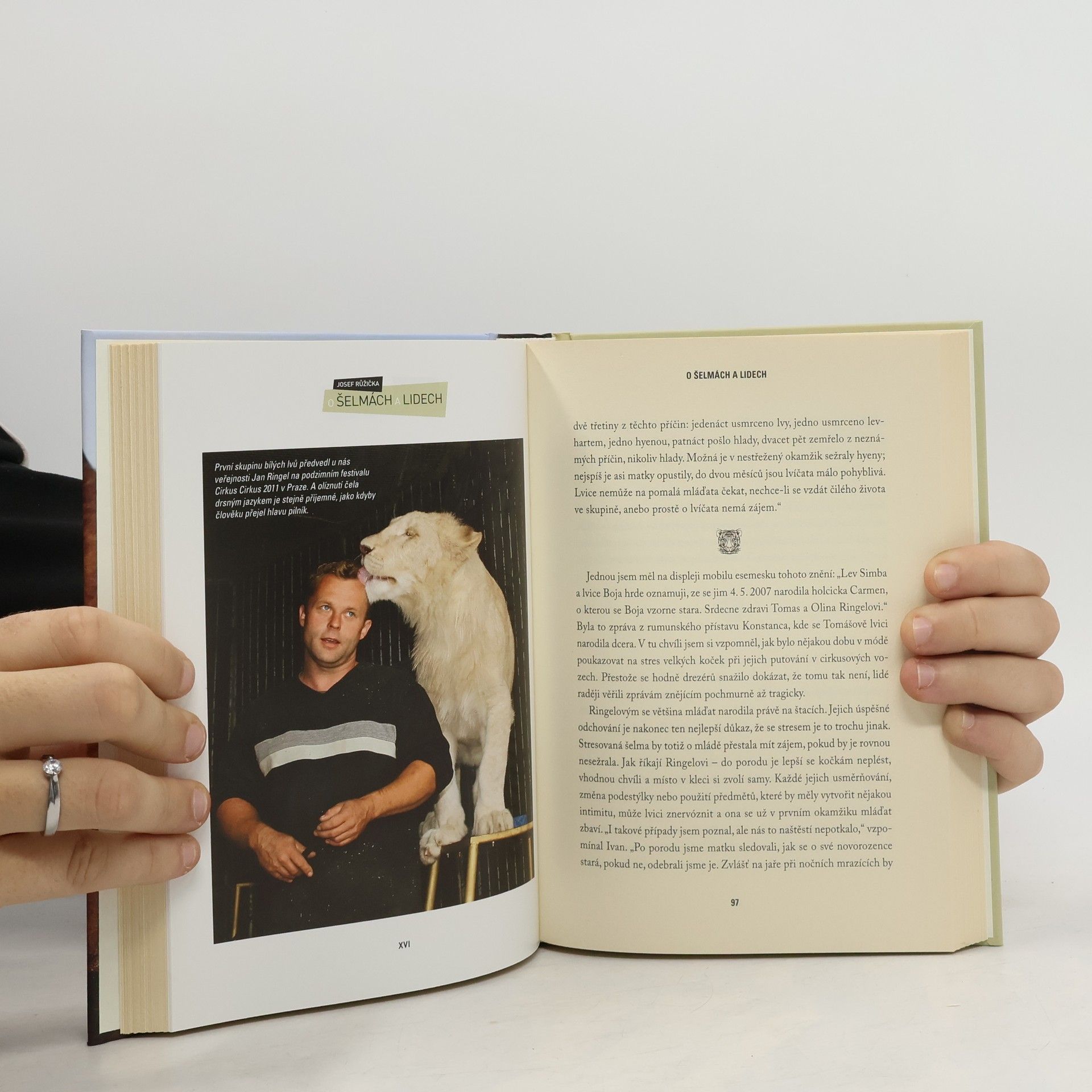 Autor provází čtenáře světem velkých šelem, především tygrů a lvů, a zabývá se jejich vztahem k člověku. Představuje šelmy v jejich domovině, v zoologických zahradách i v péči drezérů. Nepopírá, že mohutní predátoři mají v genech schopnost zabíjet, a píše i o případech, kdy setkání se šelmou skončilo tragicky. Ale na druhé straně – i velmi nebezpečné zvíře dokáže člověku vyjít vstříc, když to s ním někdo umí. Autor proto ukazuje na osudech proslulé drezérské rodiny Ringelů, jak lze najít kontakt se šelmou, jak získat její důvěru a nabídnout jí vzrušující život. A nemusí jít jen o kontakt se lvem nebo tygrem, vždyť Ringelovi vycvičili třeba i hrocha, nejnebezpečnější zvíře Afriky. Na stránkách knihy líčí své zážitky s medvědy i Jiří Kludský z legendárního rodu cirkusových podnikatelů, autorovo vyprávění nás zavede na francouzské cirkusové festivaly i do savany s lovícími lvy a zajímavost knížky je podtržena faktem, že podobné tituly vycházejí u nás jen zřídka.
