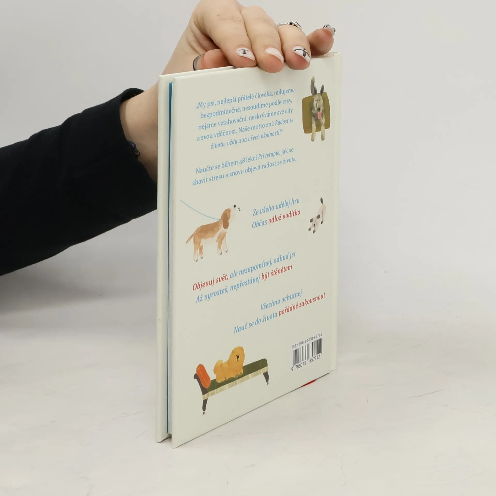 „My psi milujeme bezpodmínečně, nesoudíme podle rasy, nejsme vztahovační, neskrýváme své city a svou vděčnost, neobrňujeme se žádným z oněch krunýřů, které často brání lidem, aby spolu mohli otevřeně komunikovat. Naše motto zní: ‘Radost ze života, vždy a za všech okolností!’ Cožpak my psi nejsme nejlepšími přáteli člověka? A právě proto vám v této knize odhalíme některá z našich tajemství a nezapomeneme přitom na dvě zásadní věci: na hru, neboť hra je – jak říkával Lao-c´ – tím nejlepším lékem; a na sounáležitost, neboť když jsme šťastní, naše štěstí má být sdíleno. Jen tak se život naplní radostí. Psí slovo na to.“ Čtyřicet osm lekcí psí terapie, které nám pomohou zbavit se stresu a naučí nás, jak znovu objevit radost ze života, abychom si jej mohli v každičkém okamžiku pořádně vychutnat.