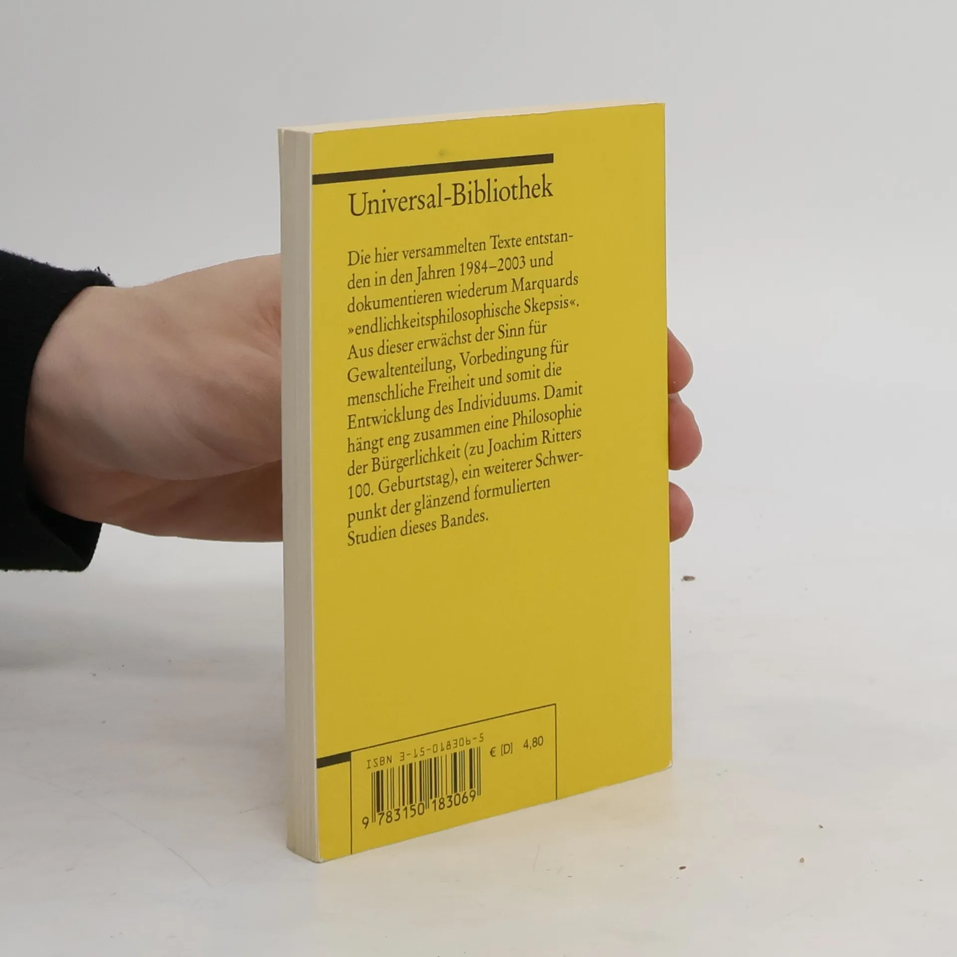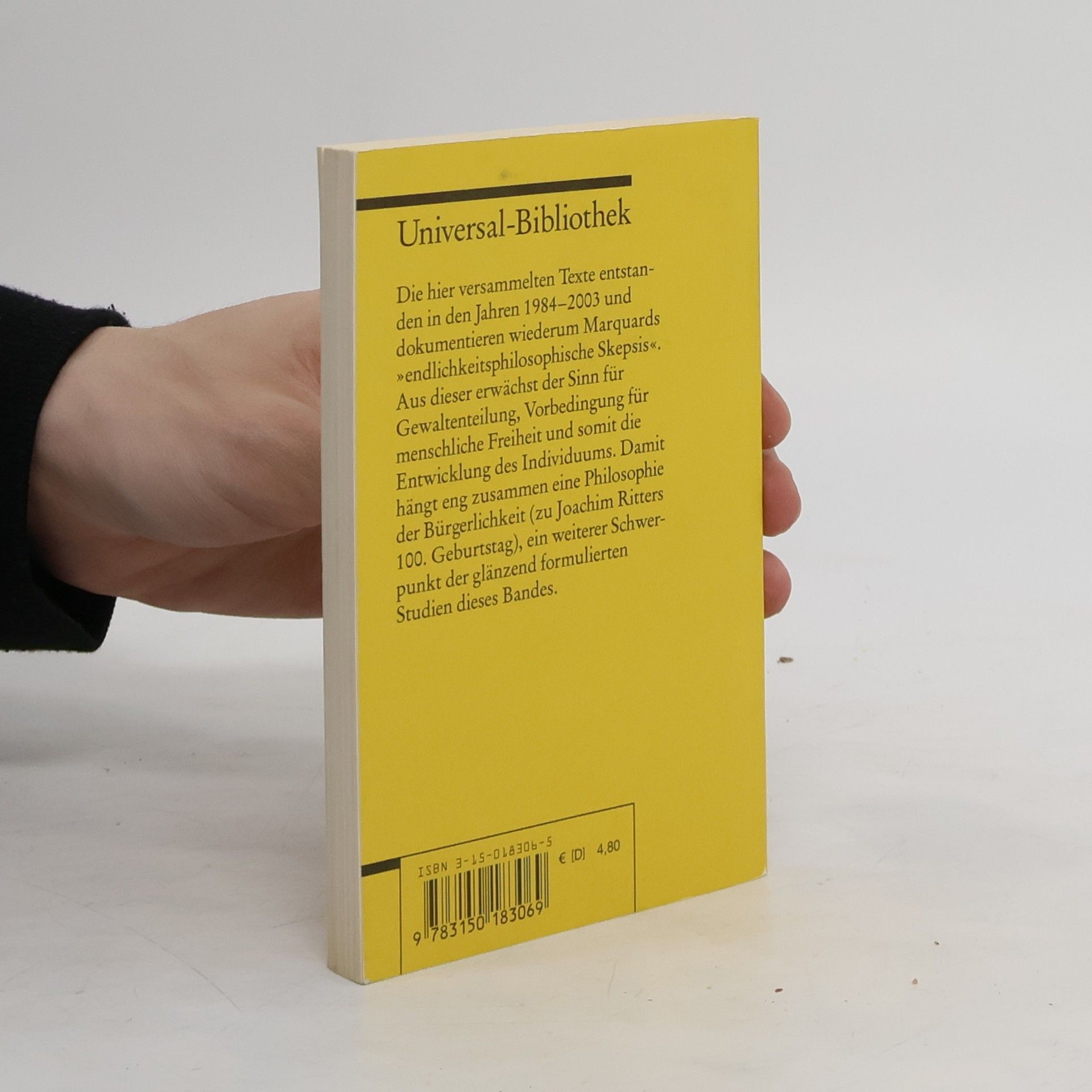 Marquards zwischen 1984 und 2003 entstandene Texte dokumentieren wiederum seine „endlichkeitsphilosophische Skepsis“: Kleine Anthropologie der Zeit - Skepsis als Philosophie der Endlichkeit - Das Über-Wir - Sola divisione individuum - Mut zur Bürgerlichkeit - Die Denkformen und die Gewaltenteilung - Einheitswissenschaft oder Wissenschaftspluralismus? - Musik in der Philosophie u. a. m.