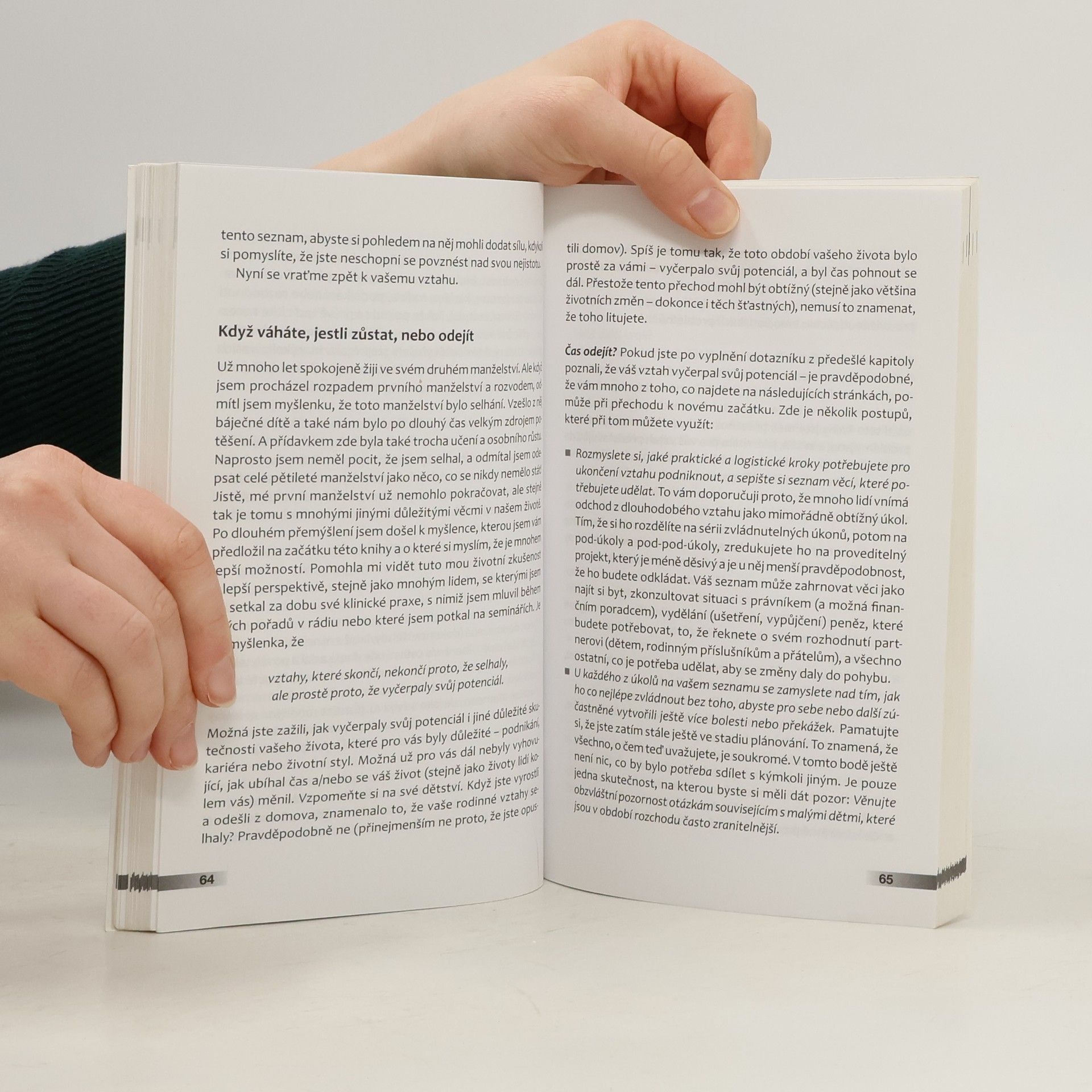 Průvodce partnerskou krizí. Partneři v nešťastném vztahu často nejsou s to sami rozhodnout, zda mají spolu zůstat, nebo se rozejít. Kniha se zabývá touto bolestnou ambivalencí. Pomáhá na jedné straně najít stránky vztahu, na kterých lze dále stavět a usilovat o jeho záchranu. Na druhé straně pomáhá rozpoznat, zda vztah ukončit a jak pracovat na rozchodu bez vzájemného ubližování a pocitů viny. Kniha je určena všem, kteří žijí v obtížném vztahu a rozhodují se, zda v něm zůstat, nebo odejít. Je určena všem, kteří chtějí porozumět tomu, že je od partnera či partnerky dnes odpuzuje právě to, co bylo dříve přitažlivé, a kteří uvažují, zda vyhledat odbornou pomoc a co od ní očekávat. Publikaci ocení čtenáři v manželských či partnerských vztahových obtížích, jejich rodinní blízcí a přátelé.