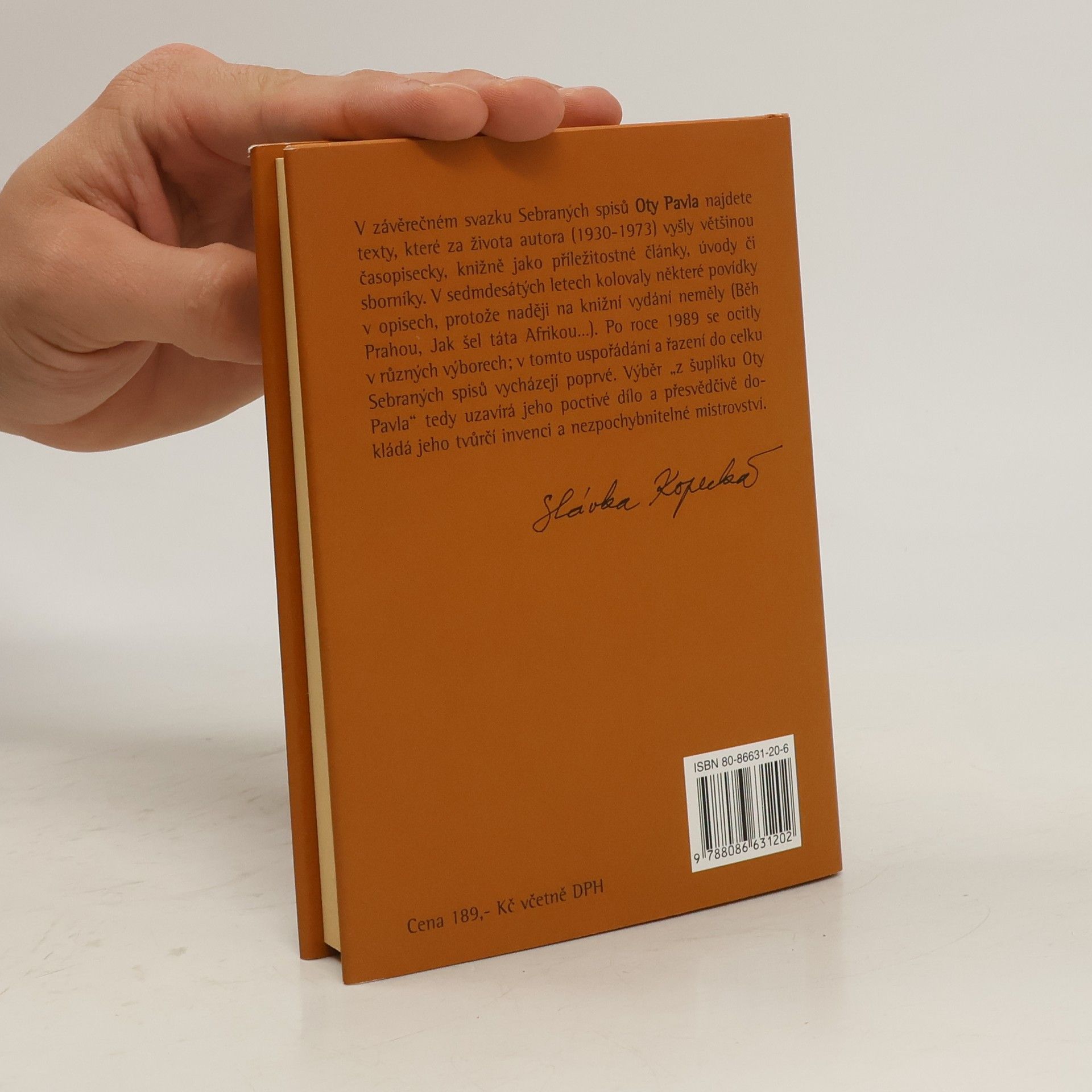V závěrečném svazku Sebraných spisů Oty Pavla najdeme texty, které za života autora vyšly většinou jen časopisecky, knižně jako příležitostné články, úvody či sborníky. V sedmdesátých letech kolovaly některé povídky v opisech, protože naděje na knižní vydání neměly. Dále jsou do publikace zařazeny texty z pozůstalosti, které v sedmdesátých letech kolovaly pouze v opisech a později byly zařazovány do různých povídkových výborů. Knížku, rozdělenou tematicky do pěti částí, uvozuje fragment emotivní rodinné korespondence. Svazek tak z jiného pohledu doplňuje dosud vydané dílo.