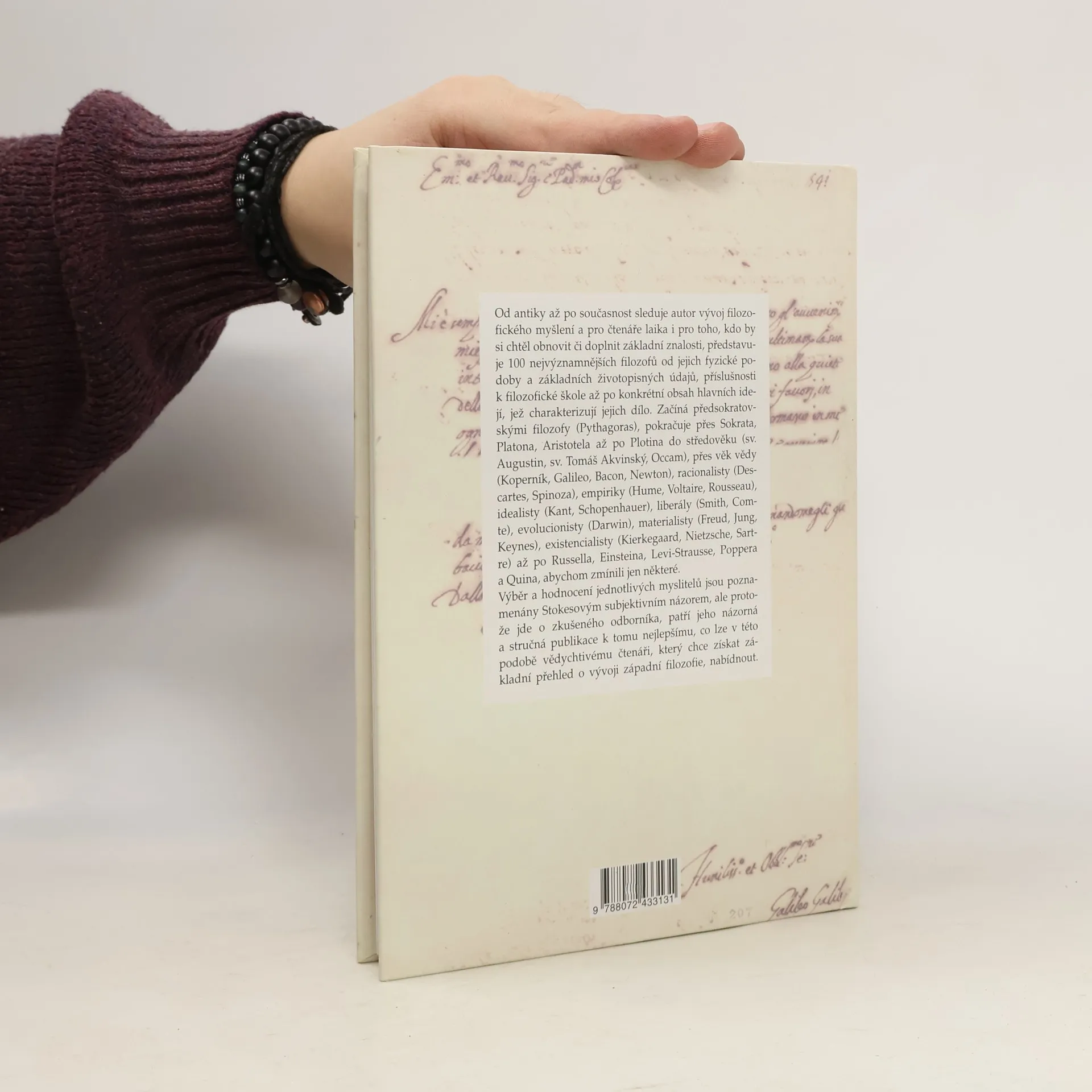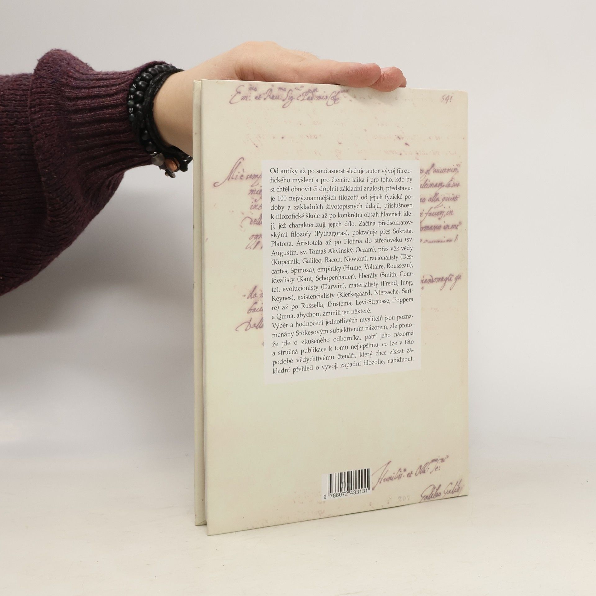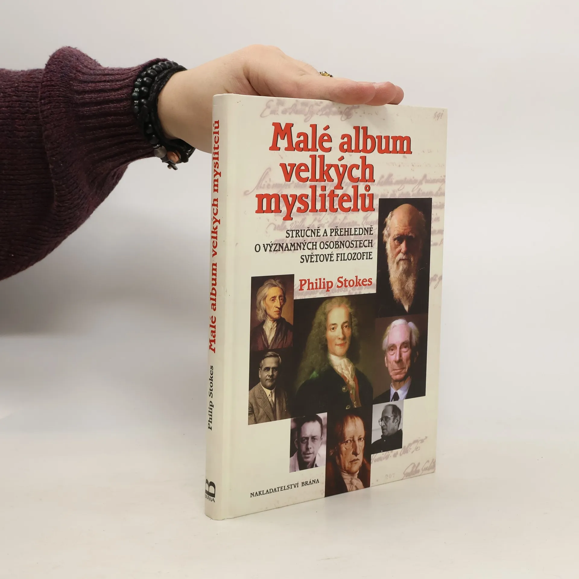 Od antiky až po současnost sleduje autor vývoj filozofického myšlení a pro čtenáře laika i pro toho, kdo by si chtěl obnovit či doplnit základní znalosti, představuje 100 nejvýznamnějších filozofů od jejich fyzické podoby a základních životopisných údajů, příslušnosti k filozofické škole až po konkrétní obsah hlavních idejí, jež charakterizují jejich dílo. Výběr a hodnocení jednotlivých myslitelů jsou poznamenány Stokesovým subjektivním názorem, ale protože jde o zkušeného odborníka, patří jeho názorná a stručná publikace k tomu nejlepšímu, co lze v této podobě vědychtivému čtenáři, který chce získat základní přehled o vývoji západní filozofie, nabídnout.