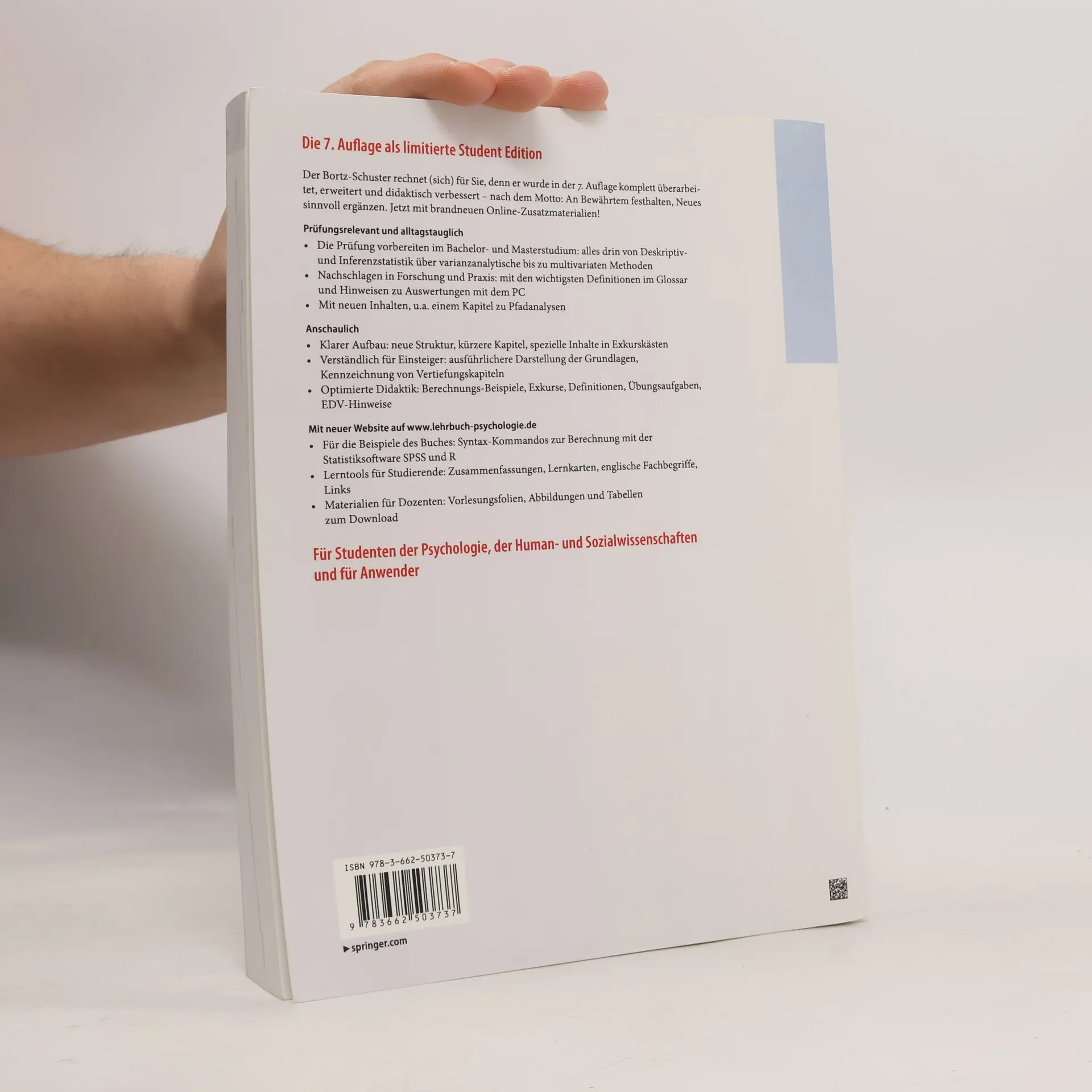 Das Lehrbuch vermittelt umfassend die Grundlagen und Methoden der Statistik. Es enthält zahlreiche anschauliche Beispiele und Übungsaufgaben, auch aus der psychologischen Forschung, sowie eine Formelsammlung und ein Glossar zum schnellen Rechnen und Nachschlagen. In der 7. Auflage wurden die Grundlagen für Einsteiger noch verständlicher formuliert, der Inhalt mit neuen Didaktikelementen noch klarer strukturiert. Neu ist auch eine Website mit SPSS-Anleitungen zu allen Beispielen, mit Lerntools für Studierende und Lehrmaterialien für Dozenten.