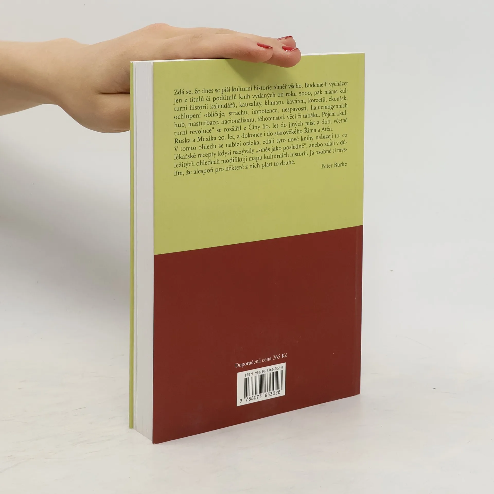 Kniha je stručným a čtivým úvodem do disciplíny zvané kulturní historie. Definuje kulturní historii, seznamuje s jejím předmětem, vznikem, metodami, klíčovými tématy a otázkami, hlavními představiteli a díly, a to v celosvětovém měřítku. Autor, který je emeritním profesorem tohoto oboru na univerzitě v Cambridgi, sleduje vývoj této disciplíny od tzv. klasického období (1800–1950), přes reakci marxistů a následnou renesanci tohoto oboru v 70. letech 20. století (tzv. nová kulturní historie) až do současnosti. Pozornost je věnována také vztahu mezi kulturní historií a příbuznými vědními disciplínami, z nichž některé se z ní vyvinuly a postupně se osamostatnily. Nechybí ani zamyšlení nad budoucností kulturní historie či chronologický přehled stěžejních děl tohoto oboru od počátků a do dnešní doby.