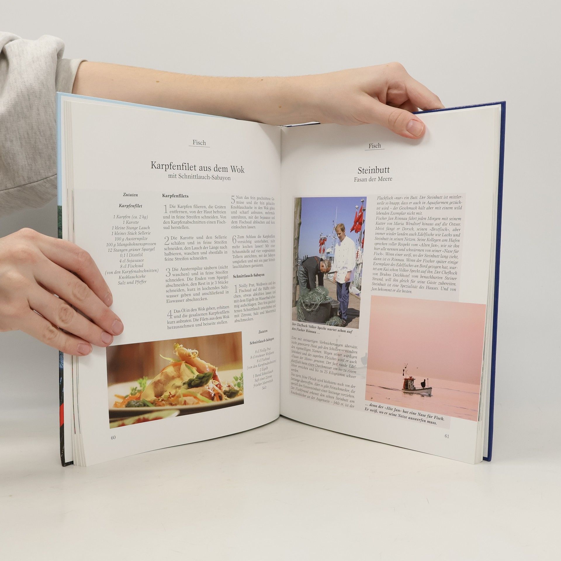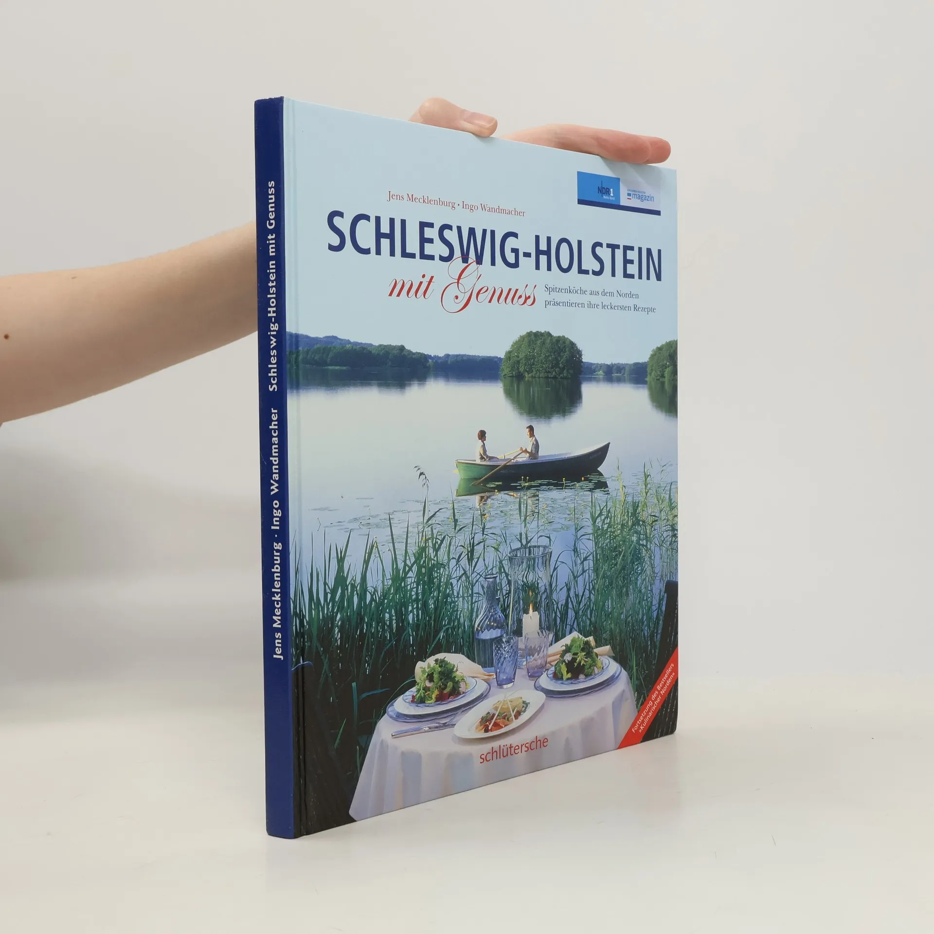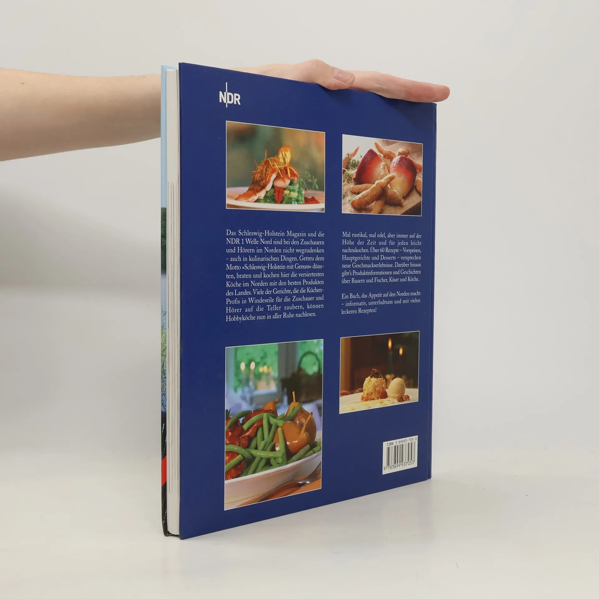 Steckrübenschaumsuppe mit gebackener Sylter Auster. Süppchen von der Quitte. Buttermilchsuppe. Kabeljau auf roten Linsen. Gefüllte Edelmaräne in der Salzkruste mit Meerrettichschaum. Frühlingsrolle von Roter Bete, Sprossen und Poularde. Schweinebraten mit Apfel-Pflaumen-Chutney. Fasanenbrust in Haselnussbutter. Geschmorte Rehhaxe mit Kürbisrösti. Gefüllte Martinsgans. Winterapfel mit Schokolade, Walnüssen und Zimteis. Rotweinmousse mit weisser Schokolade. Nicht wegzudenken sind das Schleswig-Holstein Magazin und NDR 1 Welle Nord bei den Zuschauern und Hörern im Norden – auch in kulinarischen Dingen. Getreu dem Motto „Schleswig-Holstein mit Genuss“ dünsten, braten und kochen hier die versiertesten Köche im Norden mit den besten Produkten des Landes. Mal rustikal, mal edel, aber immer auf der Höhe der Zeit und für jeden leicht nachzukochen. Über 60 Rezepte – Vorspeisen, Hauptgerichte und Desserts – versprechen neue geschmackliche Erlebnisse. Darüber hinaus gibt‘s Produktinformationen und Geschichten über Bauern und Fischer, Käser und Köche. „Schleswig-Holstein mit Genuss“ ist Kochbuch und kulinarisches Lesebuch in einem. „Ein Buch, das Appetit auf den Norden macht – informativ, unterhaltsam und mit vielen leckeren Rezepten und tollen Fotos.“ Lübecker Nachrichten
