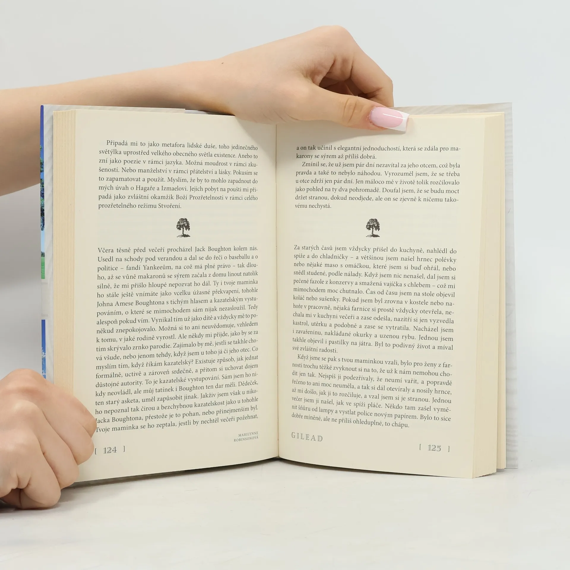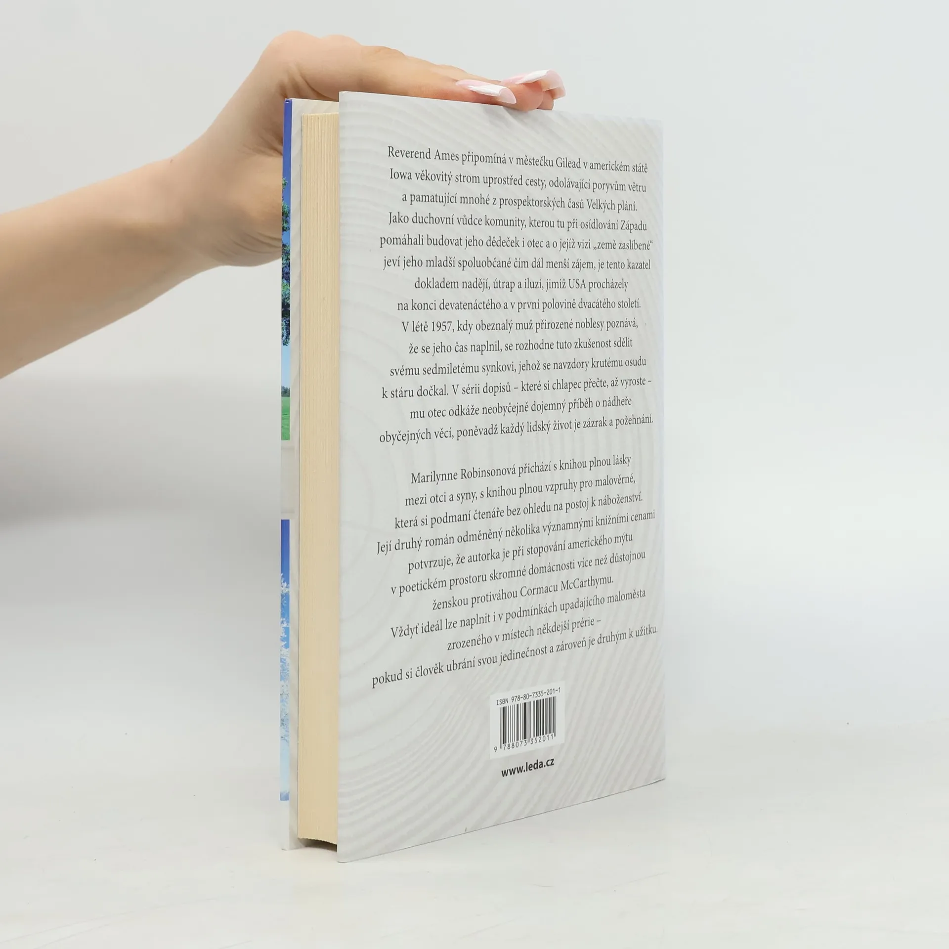 Reverend Ames připomíná v městečku Gilead v americkém státě Iowa věkovitý strom uprostřed cesty, odolávající poryvům větru a pamatující mnohé z prospektorských časů Velkých plání. Jako duchovní vůdce komunity, kterou tu při osídlování Západu pomáhali budovat jeho dědeček i otec a o jejíž vizi „země zaslíbené“ jeví jeho mladší spoluobčané čím dál menší zájem, je tento kazatel dokladem nadějí, útrap a iluzí, jimiž USA procházely na konci devatenáctého a v první polovině dvacátého století. V létě 1957, kdy obeznalý muž přirozené noblesy poznává, že se jeho čas naplnil, se rozhodne tuto zkušenost sdělit svému sedmiletému synkovi, jehož se navzdory krutému osudu k stáru dočkal. V sérii dopisů – které si chlapec přečte, až vyroste – mu otec odkáže neobyčejně dojemný příběh o nádheře obyčejných věcí, poněvadž každý lidský život je zázrak a požehnání. Marilynne Robinsonová přichází s knihou plnou lásky mezi otci a syny, s knihou plnou vzpruhy pro malověrné, která si podmaní čtenáře bez ohledu na postoj k náboženství. Její druhý román odměněný několika významnými knižními cenami potvrzuje, že autorka je při stopování amerického mýtu v poetickém prostoru skromné domácnosti více než důstojnou ženskou protiváhou Cormacu McCarthymu. Vždyť ideál lze naplnit i v podmínkách upadajícího maloměsta zrozeného v místech někdejší prérie – pokud si člověk ubrání svou jedinečnost a zároveň je druhým k užitku.