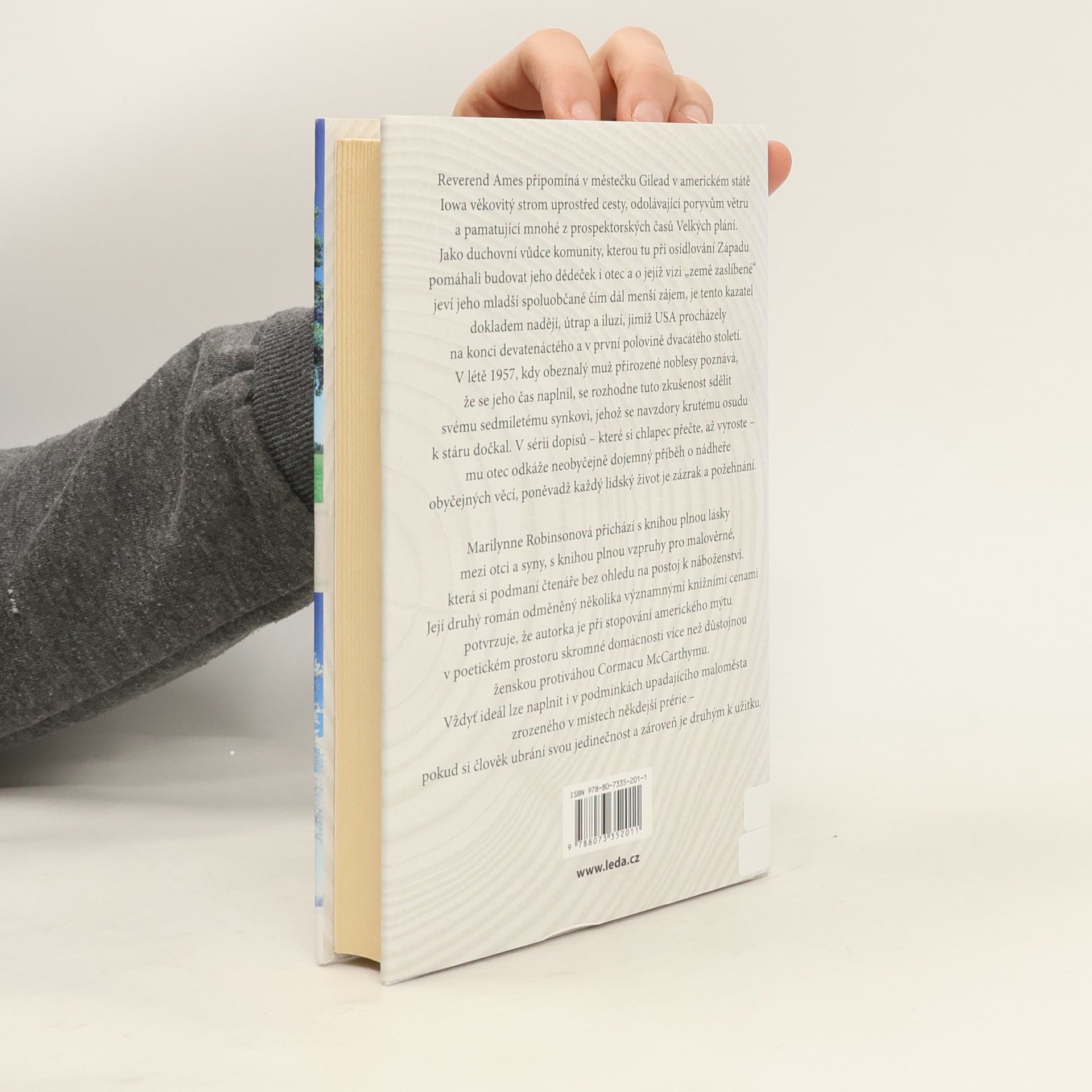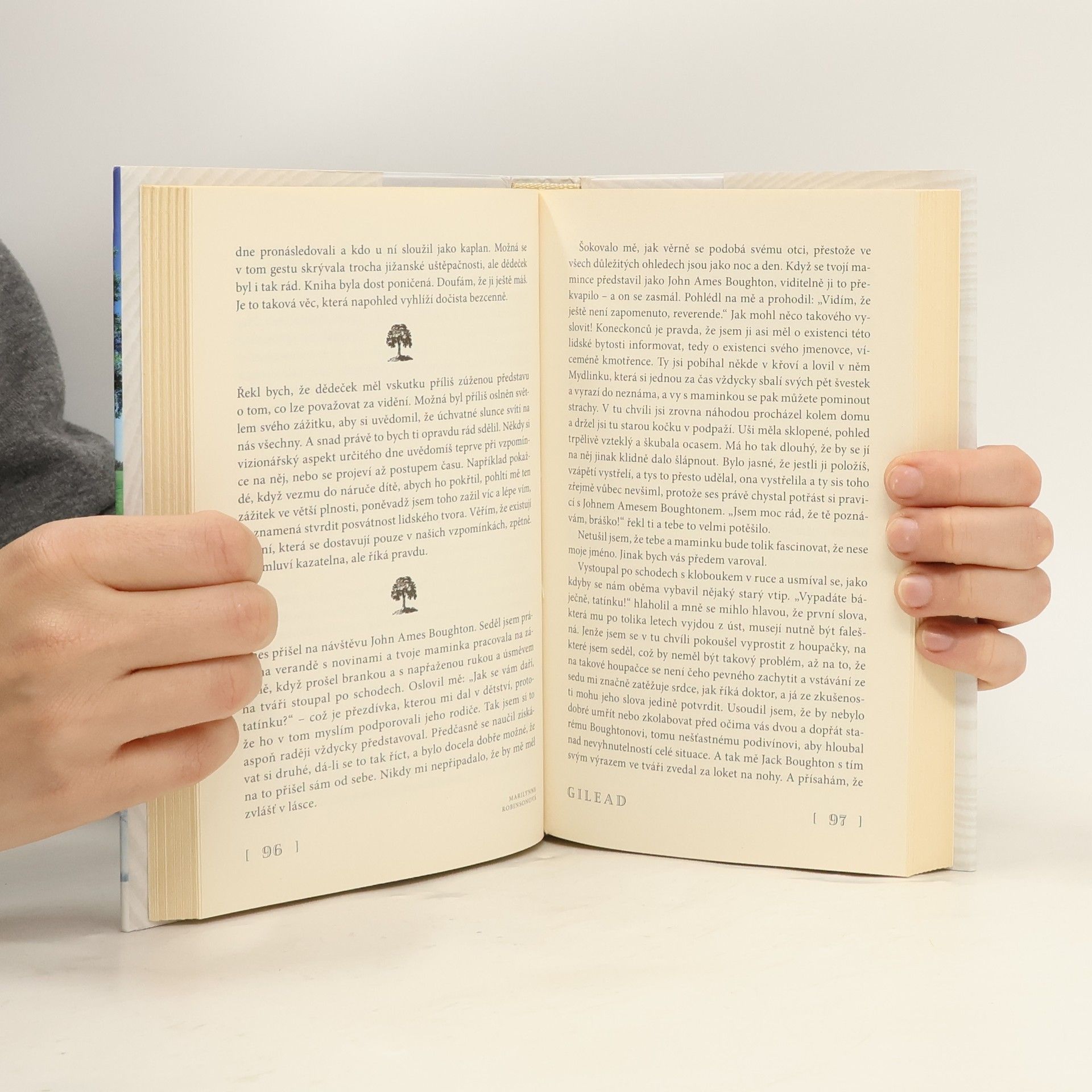 Reverend Ames připomíná v městečku Gilead v americkém státě Iowa věkovitý strom uprostřed cesty, odolávající poryvům větru a pamatující mnohé z prospektorských časů Velkých plání. Jako duchovní vůdce komunity, kterou tu při osídlování Západu pomáhali budovat jeho dědeček i otec a o jejíž vizi „země zaslíbené“ jeví jeho mladší spoluobčané čím dál menší zájem, je tento kazatel dokladem nadějí, útrap a iluzí, jimiž USA procházely na konci devatenáctého a v první polovině dvacátého století. V létě 1957, kdy obeznalý muž přirozené noblesy poznává, že se jeho čas naplnil, se rozhodne tuto zkušenost sdělit svému sedmiletému synkovi, jehož se navzdory krutému osudu k stáru dočkal. V sérii dopisů – které si chlapec přečte, až vyroste – mu otec odkáže neobyčejně dojemný příběh o nádheře obyčejných věcí, poněvadž každý lidský život je zázrak a požehnání. Marilynne Robinsonová přichází s knihou plnou lásky mezi otci a syny, s knihou plnou vzpruhy pro malověrné, která si podmaní čtenáře bez ohledu na postoj k náboženství. Její druhý román odměněný několika významnými knižními cenami potvrzuje, že autorka je při stopování amerického mýtu v poetickém prostoru skromné domácnosti více než důstojnou ženskou protiváhou Cormacu McCarthymu. Vždyť ideál lze naplnit i v podmínkách upadajícího maloměsta zrozeného v místech někdejší prérie – pokud si člověk ubrání svou jedinečnost a zároveň je druhým k užitku.