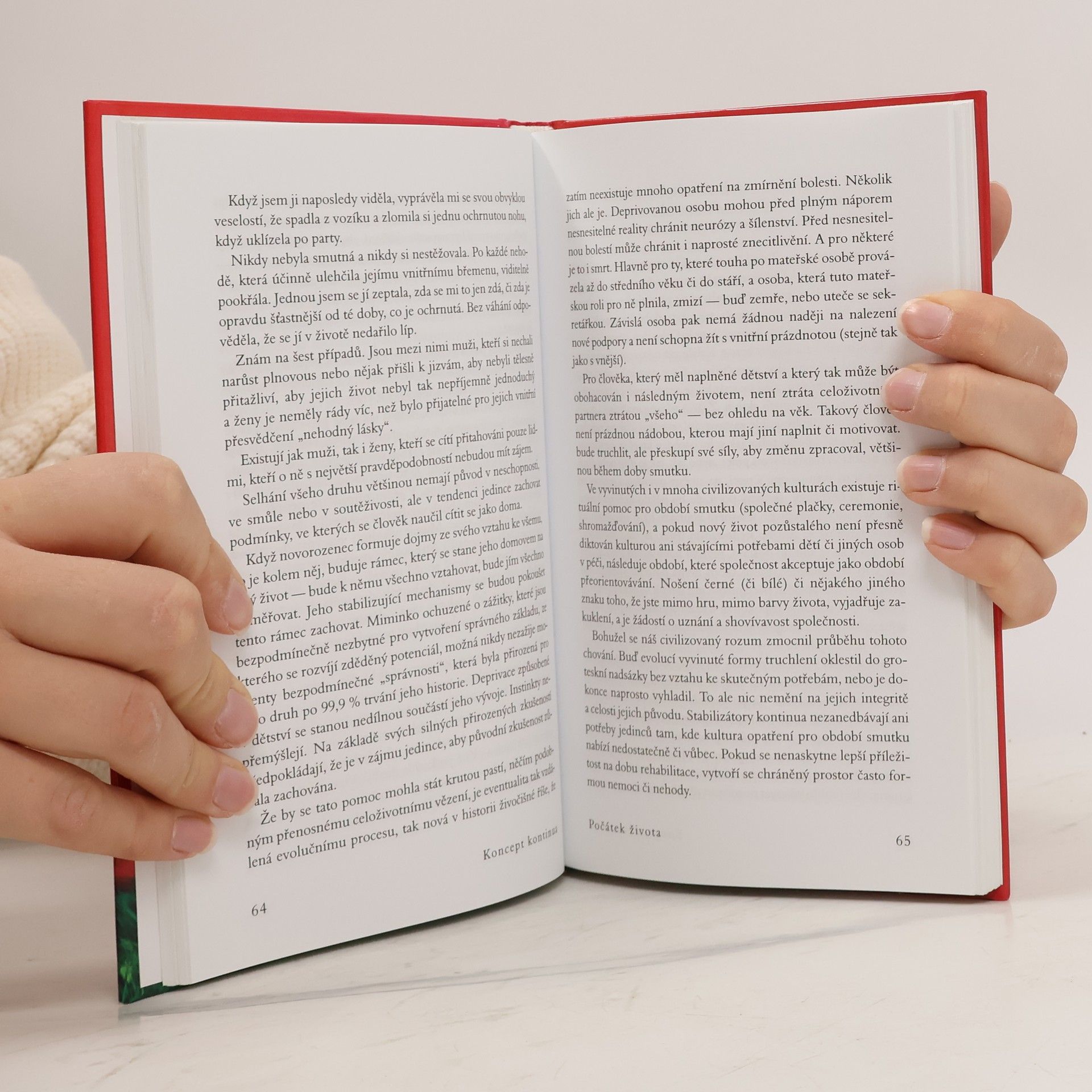 Autorka ve své světově proslulé knize odhaluje, proč jsou lidé žijící na Západě tak nespokojení a často nešťastní. Po několika expedicích mezi jihoamerické indiány rozpoznala, že tyto pocity mohou pramenit z neuspokojených potřeb miminek a malých dětí, které se na Západě snažíme vychovávat podle všemožných teorií, jen ne podle vlastní intuice a evolucí vytvořených jednoduchých pravidel a očekávání. V knize, kterou napsala již v r. 1975, velmi jasně a přesvědčivě vysvětluje, jak je potřeba zacházet s našimi nejmenšími, aby z nich vyrostly spokojené a samostatné děti a posléze dospělí lidé, kteří si nepotřebují „léčit“ své deprivace z dětství všemi možnými způsoby, počínaje drogovou závislostí a konče nezdravými partnerskými vztahy, a jsou schopni vést plnohodnotný život, jenž nebude naplněn věčnou nespokojeností a hledáním „něčeho“, co nalézt nelze. Našemu vlastnímu životu tak dává úplně nový rozměr a pomáhá lidem najít jednoduchou, a přitom málo předvídatelnou odpověď na často kladenou otázku – proč nejsme šťastní.
