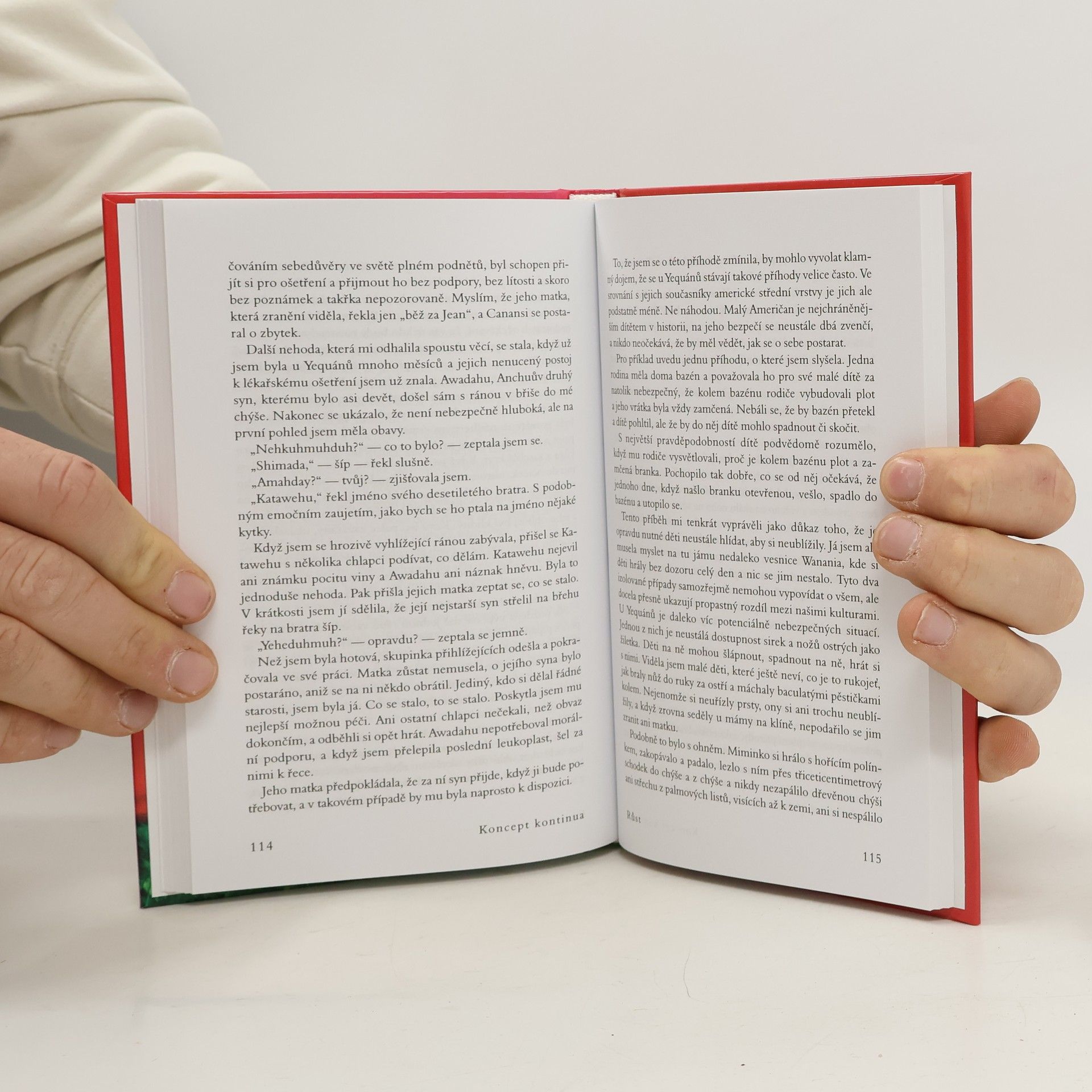 Autorka ve své světově proslulé knize odhaluje, proč jsou lidé žijící na Západě tak nespokojení a často nešťastní. Po několika expedicích mezi jihoamerické indiány rozpoznala, že tyto pocity mohou pramenit z neuspokojených potřeb miminek a malých dětí, které se na Západě snažíme vychovávat podle všemožných teorií, jen ne podle vlastní intuice a evolucí vytvořených jednoduchých pravidel a očekávání. V knize, kterou napsala již v r. 1975, velmi jasně a přesvědčivě vysvětluje, jak je potřeba zacházet s našimi nejmenšími, aby z nich vyrostly spokojené a samostatné děti a posléze dospělí lidé, kteří si nepotřebují „léčit“ své deprivace z dětství všemi možnými způsoby, počínaje drogovou závislostí a konče nezdravými partnerskými vztahy, a jsou schopni vést plnohodnotný život, jenž nebude naplněn věčnou nespokojeností a hledáním „něčeho“, co nalézt nelze. Našemu vlastnímu životu tak dává úplně nový rozměr a pomáhá lidem najít jednoduchou, a přitom málo předvídatelnou odpověď na často kladenou otázku – proč nejsme šťastní.
