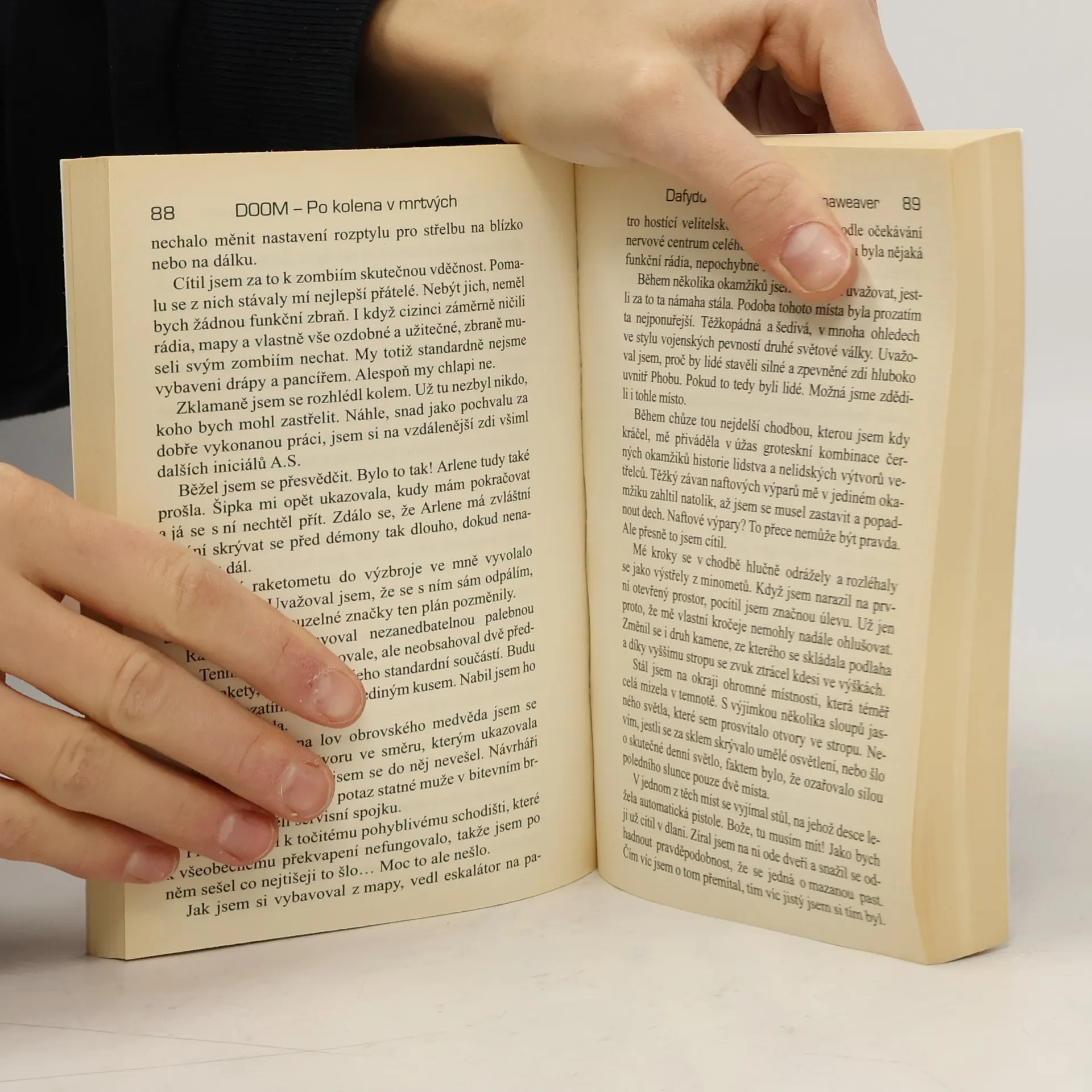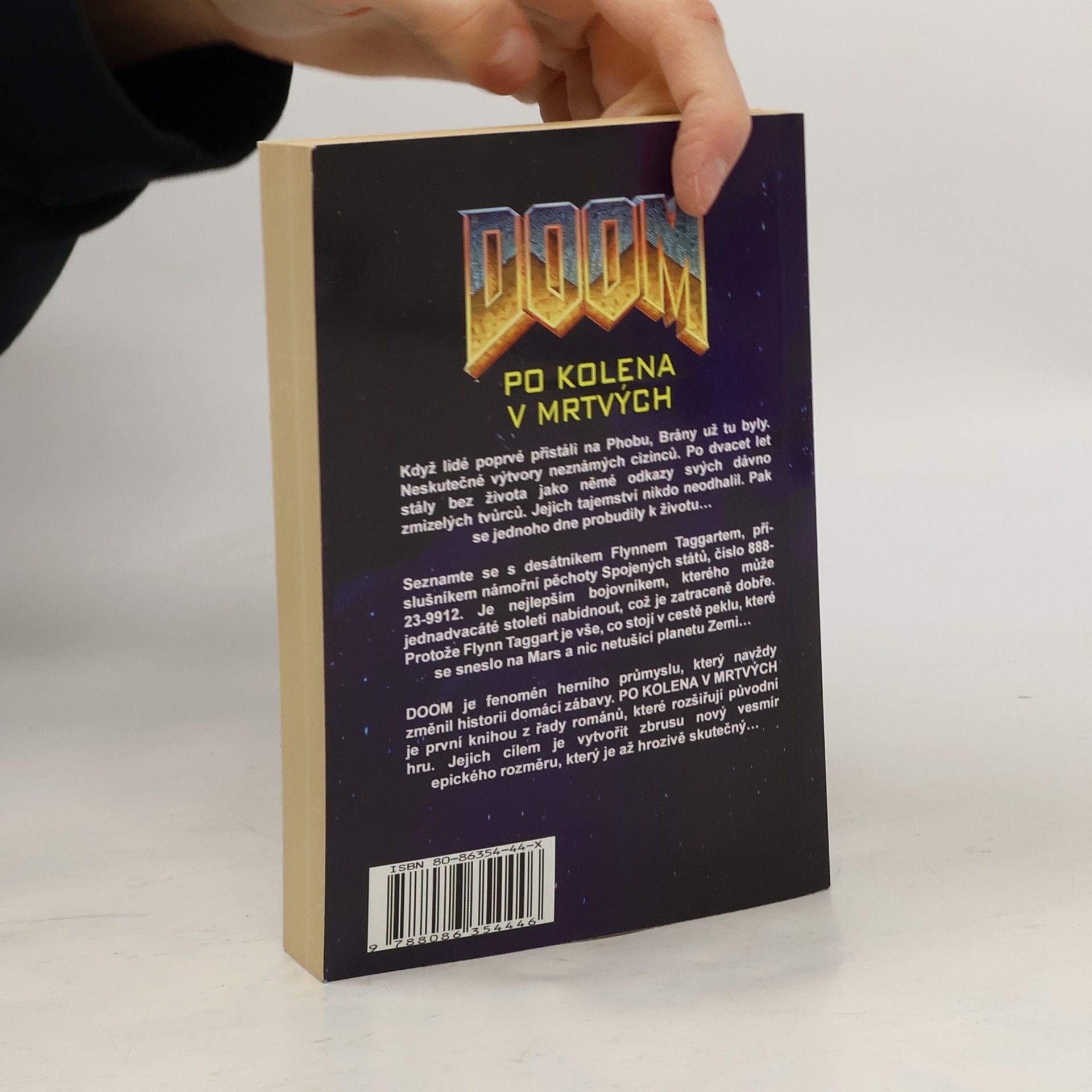 Když lidé poprvé přistáli na Phobu, Brány už tu byly. Neskutečné výtvory neznámých cizinců. Po dvacet let stály bez života jako němé odkazy svých dávno zmizelých tvůrců. Jejich tajemství nikdo neodhalil. Pak se jednoho dne probudily k životu… Seznamte se s desátníkem Flynnem Taggartem, příslušníkem námořní pěchoty Spojených států, číslo 888–23–9912. Je nejlepším bojovníkem, kterého může jednadvacáté století nabídnout, což je zatraceně dobře. Protože Flynn Taggart je vše, co stojí v cestě peklu, které se sneslo na Mars a nic netušící planetu Zemi… DOOM je fenomén herního průmyslu, který navždy změnil historii domácí zábavy. Po kolena v mrtvých je první knihou z řady románů, které rozšiřují původní hru. Jejich cílem je vytvořit zbrusu nový vesmír epického rozměru, který je až hrozivě skutečný…