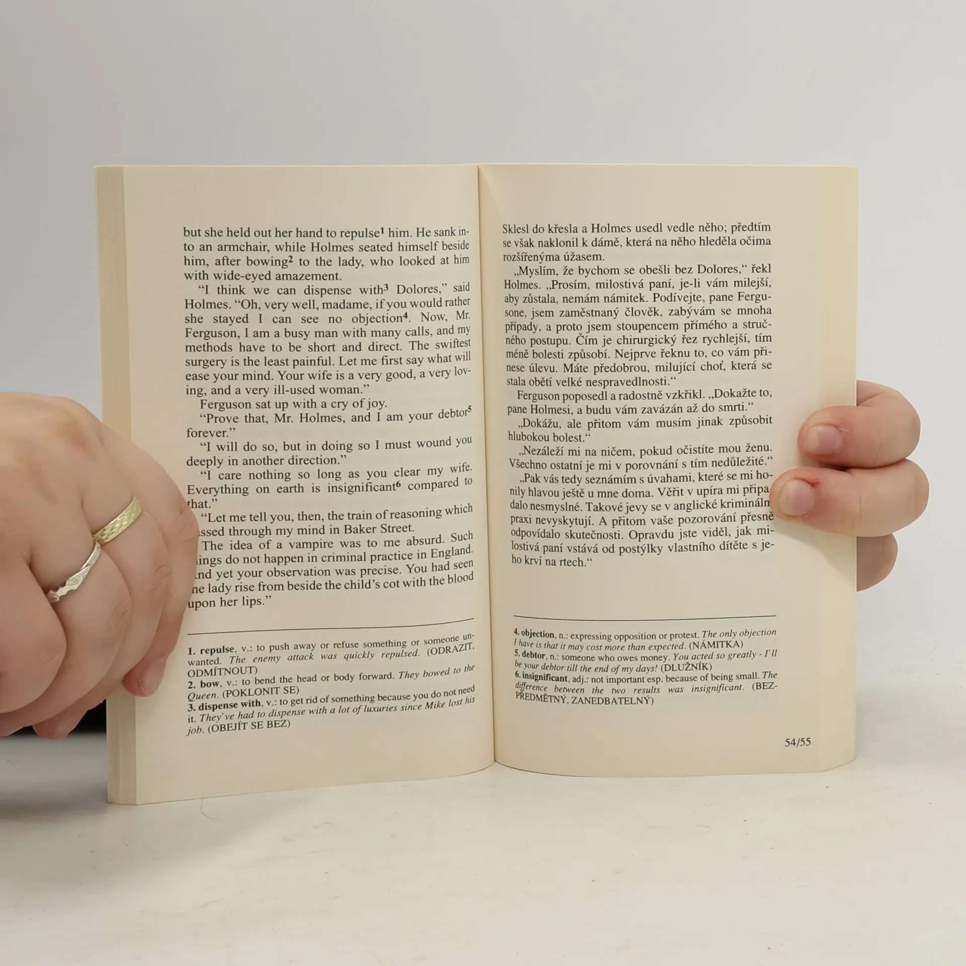 Dva slavné případy geniálního detektiva Sherlocka Holmese z pera Arthura Conana Doyla. Bilingvní česko-anglické vydání, nezkrácený text s komentářem