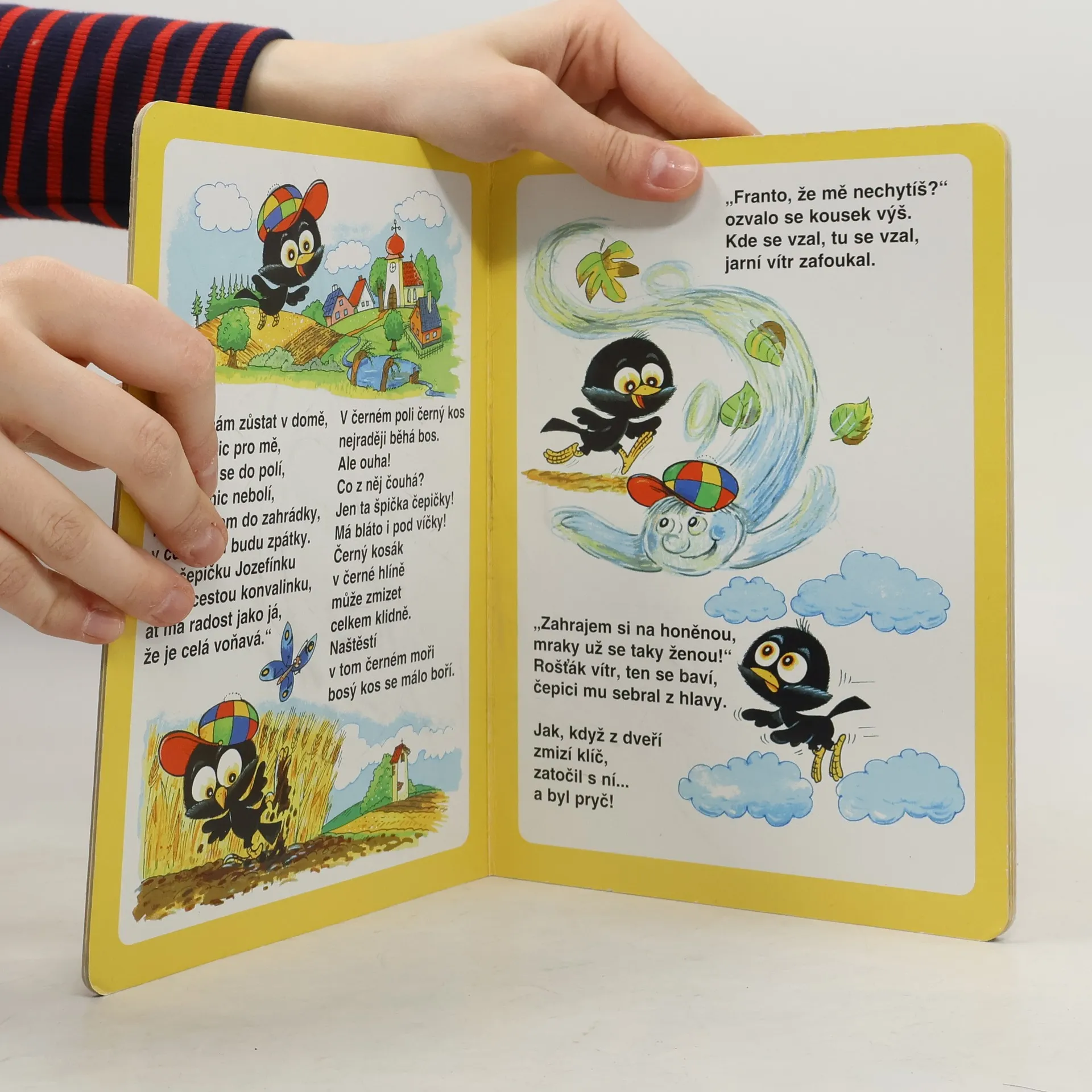 Veršované leporelo pro předškolní děti o tom, jak kos František hledal svou barevnou čepičku Jozefínu, kterou mu odnesl vítr.