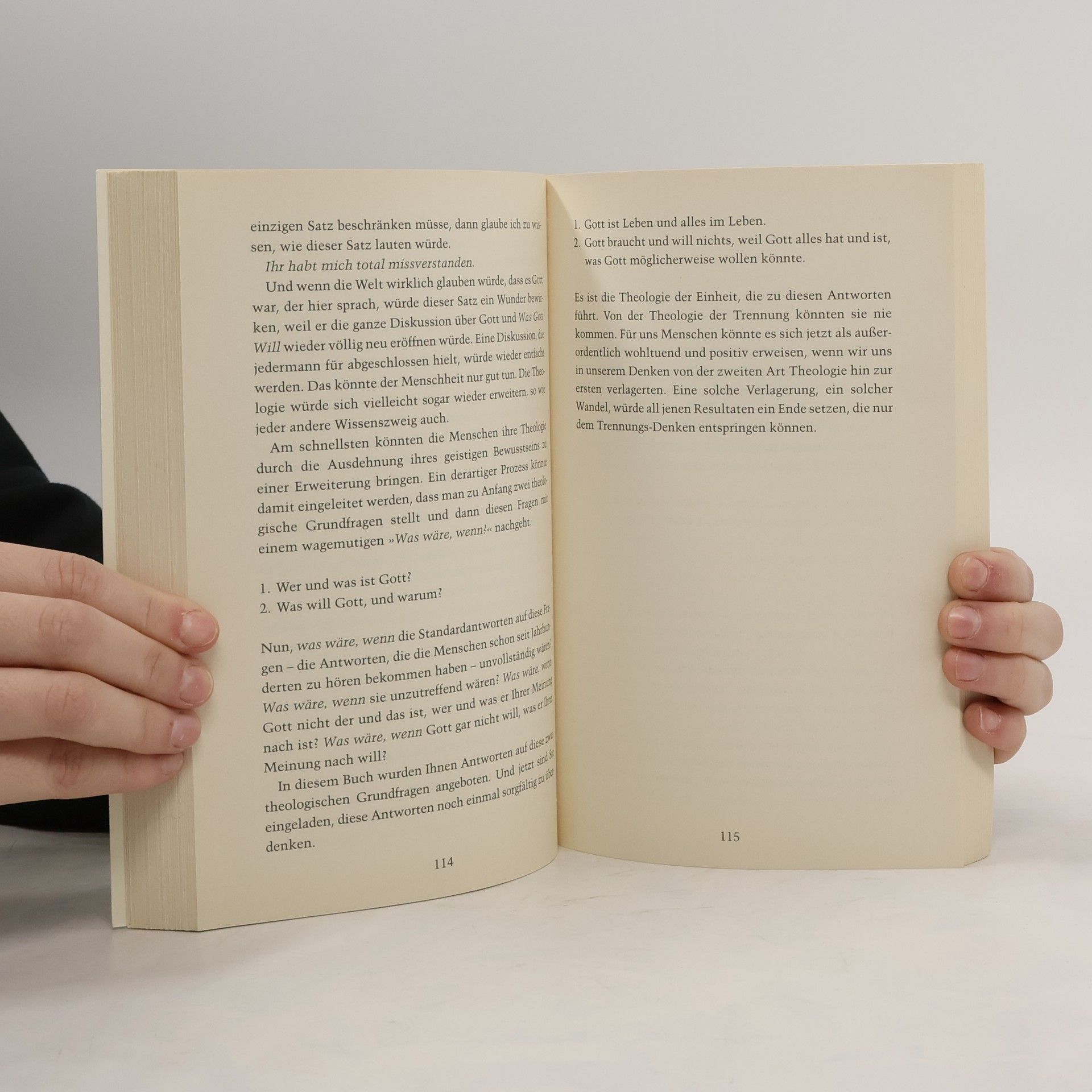 Was will Gott? Walschs Antwort auf diese gleichermaßen schwierige wie provokative Frage lautet: Gott will absolut nichts. Für die Menschen geht es aber entscheidend darum, die göttlichen Gesetzmäßigkeiten zu erkennen. Und hier bestehen laut Walsch gravierende Defizite; denn unsere Denkmodelle von der christlichen Theologie bis zur kapitalistischen Ökonomie haben zum erbarmungswürdigen Zustand des Planeten geführt. Dieses Buch ähnelt in Stil und Struktur einem Dialog-Buch, wobei der Autor nun das „Gespräch“ nicht mit Gott, sondern mit seinen Mitmenschen führt, in flottem Umgangston, elegantem Rhythmus und raschem Tempo.