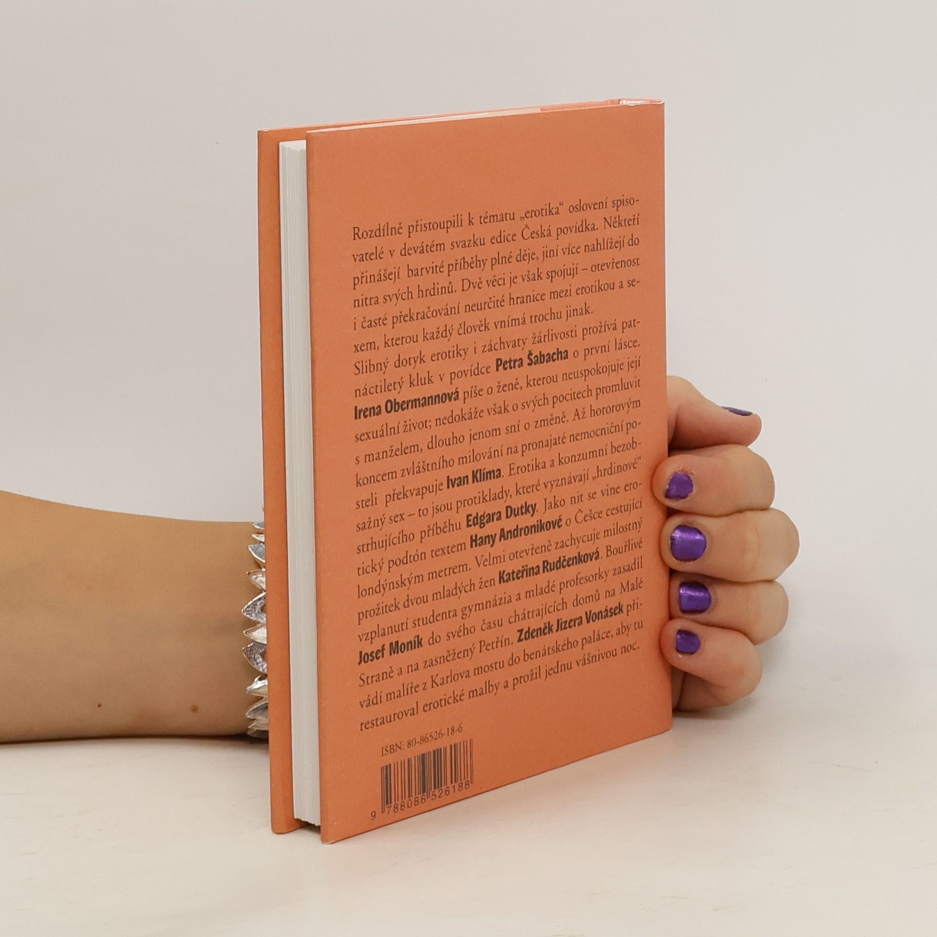 Rozdílně přistoupili k tématu „erotika" oslovení spisovatelé v devátém svazku edice Česká povídka. Někteří přinášejí barvité příběhy plné děj, jiné více nahlížejí do nitra svých hrdinů. Dvě věci je však spojují - otevřenost i časté překračování neurčité hranice mezi erotikou a sexem, kterou každý člověk vnímá trochu jinak. Slibný dotyk erotiky i záchvaty žárlivosti prožívá patnáctiletý kluk v povídce Petra Šabacha o první lásce. Irena Obermannová píše o ženě, kterou neuspokojuje její sexuální život; nedokáže však o svých pocitech promluvit s manželem, dlouho jenom sní o změně. Až hororovým koncem zvláštního milování na pronajaté nemocniční posteli překvapuje Ivan Klíma. Erotika a konzumní bezobsažný sex - to jsou protiklady, které vyznávají „hrdinové strhujícího příběhu Edgara Dutky. Jako nit se vine erotický podtón textem Hany Andronikové o Češce cestující londýnským metrem. Velmi otevřeně zachycuje milostný prožitek dvou mladých žen Kateřina Rudčenková. Bouřlivé vzplanutí studenta gymnázia a mladé profesorky zasadil Josef Moník do svého času chátrajících domů na Malé Straně a na zasněžený Petřín. Zdeněk Jizera Vonásek přivádí malíře z Karlova mostu do benátského paláce, aby tu restauroval erotické malby a prožil jednu vášnivou noc.... celý text