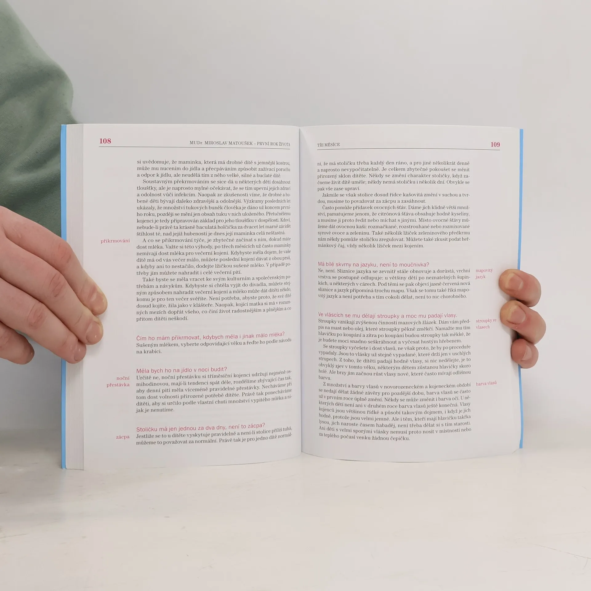 Na český knižní trh se dostala nová velmi praktická knížka od českého autora, která formou otázek matky a odpovědí dětského lékaře instruktivně seznamuje s péčí o kojence od prvních dnů až do jednoho roku, od zdánlivých banalit až po první pomoc a náhlých stavů malých dětí. Kniha Miroslava Matouška – „První rok života“ aneb průvodce inteligentní ženy po prvním roce jejího dítěte, se snaží jak novopečeným matkám tak i celému okolí jasně a přehledně přiblížit, co se s miminkem odehrává, jak se zachovat ve zdánlivě nových a překvapivých situacích i na co si během denních rituálů dát pozor. Text přehledně uspořádaný podle stáří novorozence a rozčleněn formou otázek a odpovědí vychází z téměř padesátileté praxe MUDr. Miroslava Matouška a MUDr. Hany Málkové. Praxe autorů tak zaručuje nejen informace relevantní v kontextu českých reálií i pediatrických postupů, ale i fakt, že metody v textu navrhované jen slepě nekopírují módní trendy, které přicházejí stejně rychle jako jsou vyvraceny.