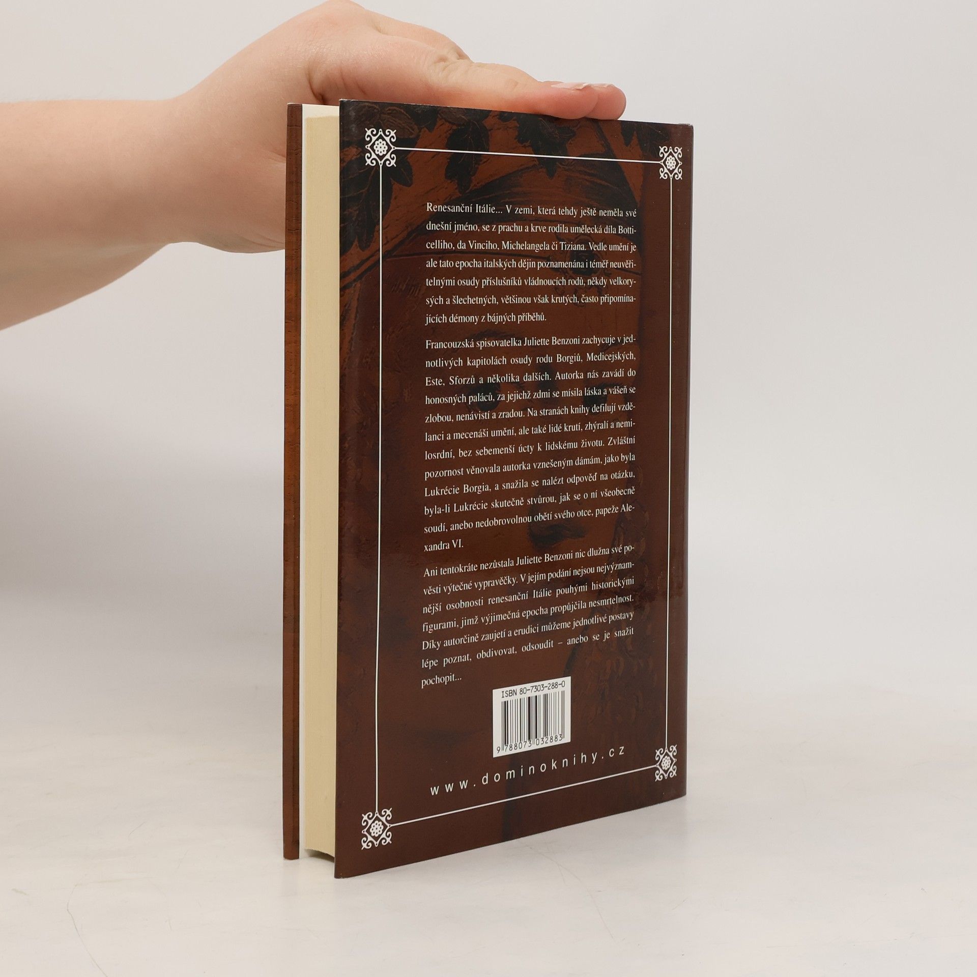 Pestrá mozaika osudů šlechticů vládnoucích v městských státech renesanční Itálie. Oblíbená francouzská spisovatelka zachycuje v jednotlivých kapitolách osudy rodu Borgiů, Medicejských, Este, Sforzů a dalších. Zvláštní pozornost věnuje vznešeným dámám. Díky autorčině erudici máme možnost jednotlivé historické postavy poznat jako živé lidi se všemi jejich ctnostmi i nectnostmi.