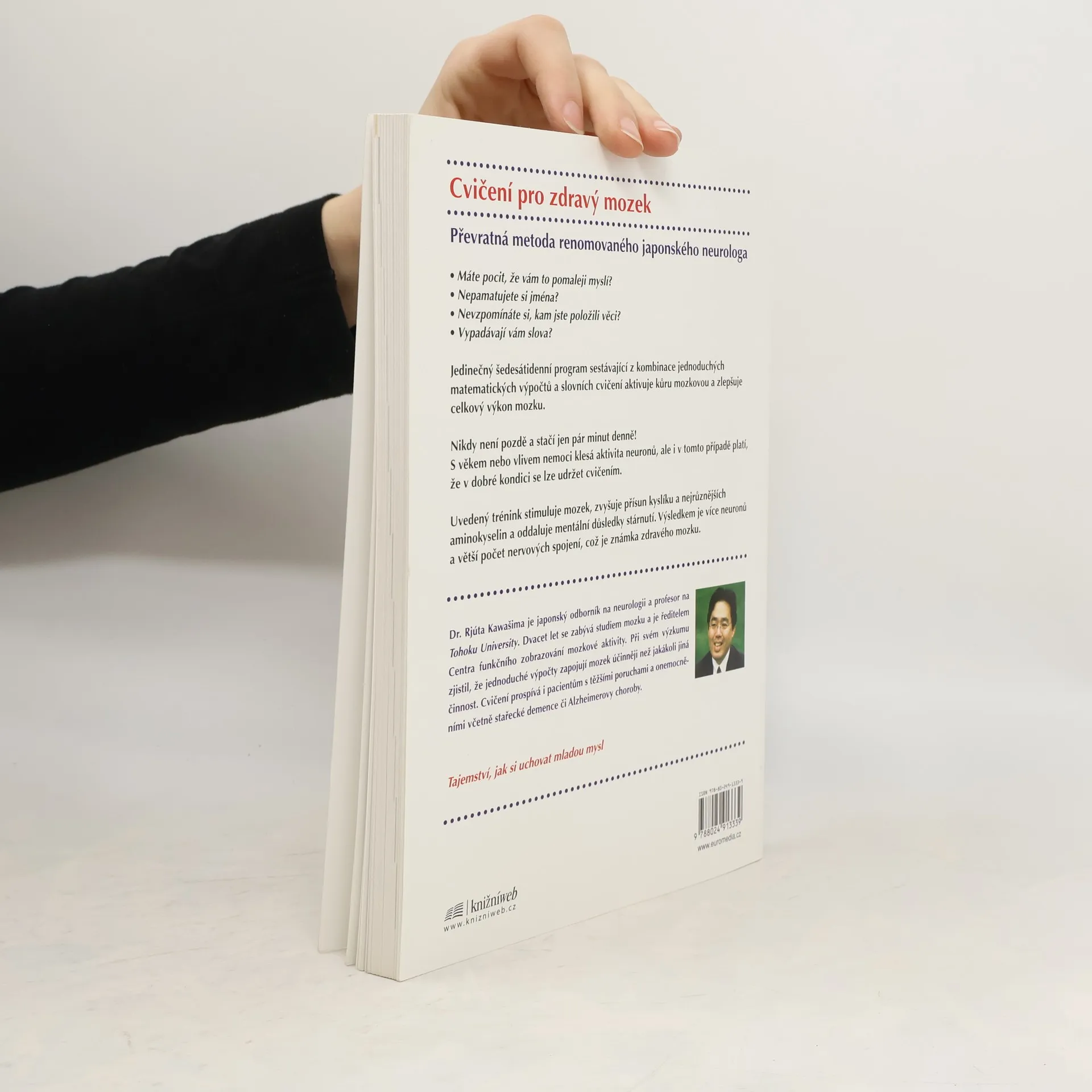 Podtitul: zlepšení za 60 dnů Cvičení pro zdravý mozek Převratná metoda renomovaného japonského neurologa Máte pocit, že vám to pomaleji myslí? Nepamatujete si jména? Nevzpomínáte si, kam jste položili věci? Vypadávají vám slova Jedinečný šedesátidenní program sestávající z kombinace jednoduchých matematických výpočtů a slovních cvičení aktivuje kůru mozkovou a zlepšuje celkový výkon mozku. Nikdy není pozdě a stačí jen pár minut denně! S věkem nebo vlivem nemoci klesá aktivita neuronů, ale i v tomto případě platí, že v dobré kondici se lze udržet cvičením. Uvedený trénink stimuluje mozek, zvyšuje přísun kyslíku a nejrůznějších aminokyselin a oddaluje mentální důsledky stárnutí. Výsledkem je více neuronů a větší počet nervových spojení, což je známka zdravého mozku. Autor je japonský odborník na neurologii a profesor na Tohoku University. Dvacet let se zabývá studiem mozkových aktivit a je ředitelem Centra funkčního zobrazování mozkové aktivity. Při svém výzkumu zjistil, že jednoduché výpočty zapojují mozek účinněji než jakákoli jiná aktivita. Cvičení prospívá i pacientům s těžšími poruchami a onemocněními včetně stařecké demence či Alzheimerovy choroby. Japonský hit, jehož se prodaly miliony výtisků. Tajemství, jak si uchovat mladou mysl