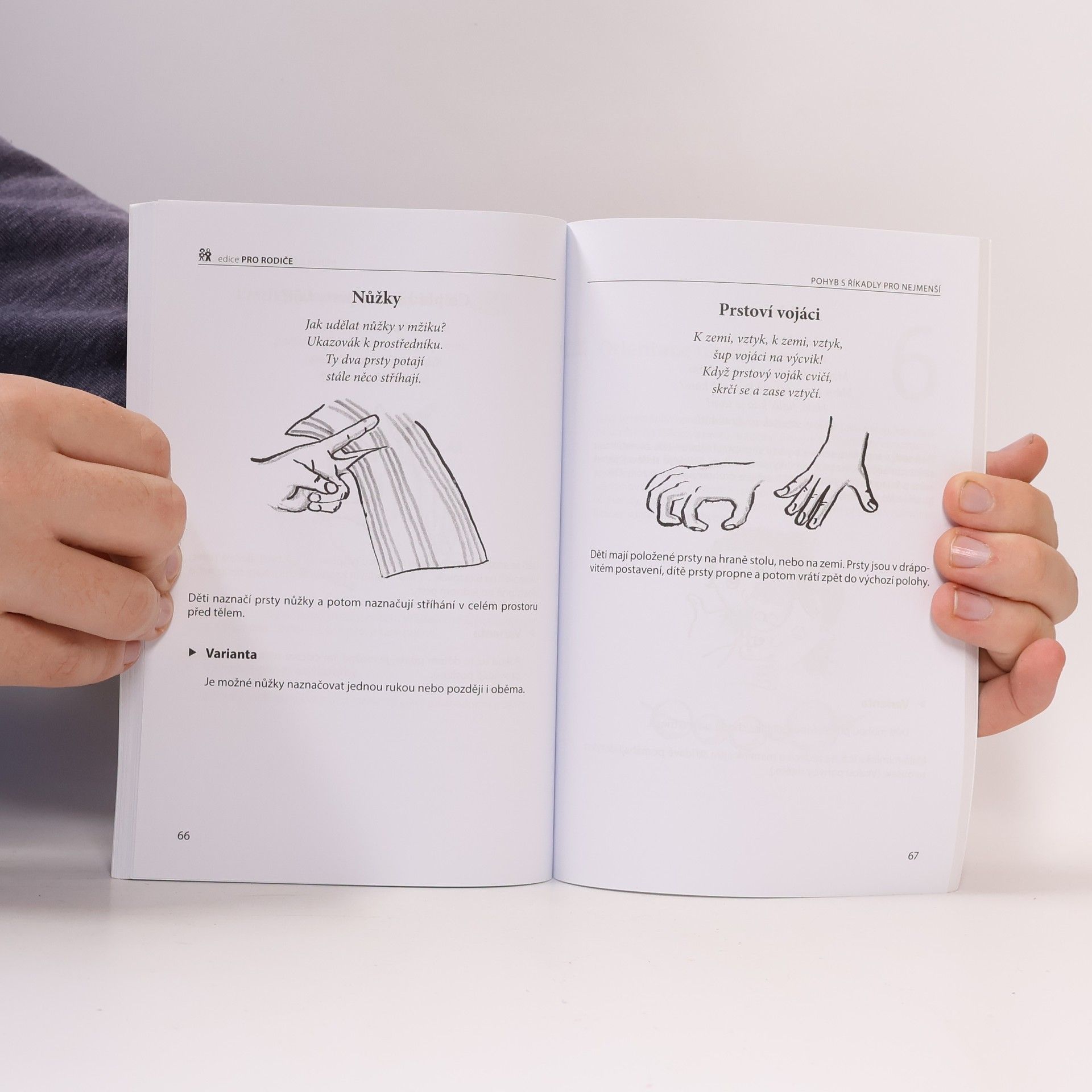 Již v prenatálním období můžeme u dětí pozorovat pohybové aktivity, které se po narození dále rozvíjejí. Přinášíme vám proto knihu plnou námětů, říkanek a praktických ukázek, jak vést své ratolesti zajímavou formou k pohybu již od útlého věku. Ptáte se, jaký mají říkanky vliv na rozvoj pohybových vlastností? Význam říkanek není pouze v tom, že je s nimi cvičení pro děti veselejší, ale i ve velkém vlivu na psychický vývoj dítěte. Děti se díky nim učí snáze mluvit a osvojí si rytmus řeči, který je tak potřebný pro získávání školních dovedností, zejména psaní a čtení. Doufáme, že se vám říkanky budou líbit a přejeme vám mnoho úspěchů při cvičení s vašimi dětmi.
