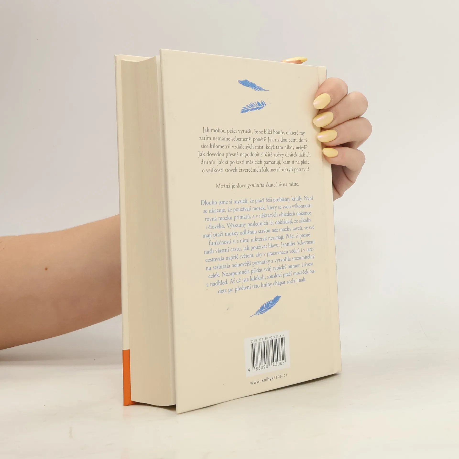 Jak mohou ptáci vytušit, že se blíží bouře, o které my zatím nemáme sebemenší ponětí? Jak najdou cestu do tisíce kilometrů vzdálených míst, když tam nikdy nebyli? Jak dovedou přesně napodobit složité zpěvy desítek dalších druhů? Jak si po šesti měsících pamatují, kam si na ploše o velikosti stovek čtverečních kilometrů ukryli potravu? Možná je slovo genialita skutečně na místě. Dlouho jsme si mysleli, že ptáci řeší problémy křídly. Nyní se ukazuje, že používají mozek, který se svou výkonností rovná mozku primátů, a v některých ohledech dokonce i člověka. Výzkumy posledních let dokládají, že ačkoliv mají ptačí mozky odlišnou stavbu než mozky savců, ve své funkčnosti si s nimi nikterak nezadají. Ptáci si prostě našli vlastní cestu, jak používat hlavu. Jennifer Ackerman cestovala napříč světem, aby v pracovnách vědců i v terénu sesbírala nejnovější poznatky a vytvořila srozumitelný celek. Nezapomněla přidat svůj typický humor, čtivost a nadhled. Ať už jste kdokoli, sousloví ptačí mozeček budete po přečtení této knihy chápat zcela jinak.