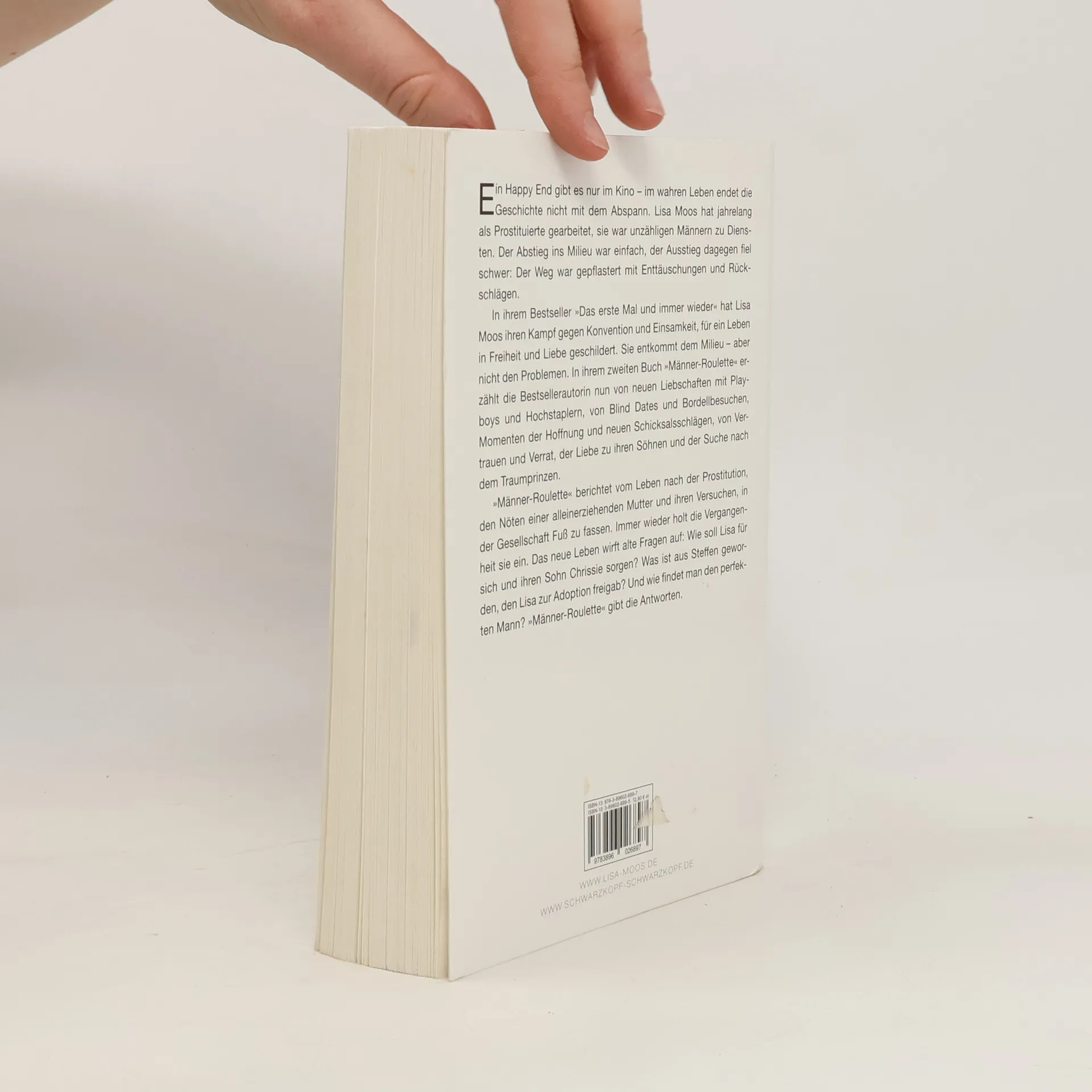 In »Das erste Mal und immer wieder« erzählt Lisa Moos offen von ihren Erfahrungen als Prostituierte, von den Höhen und Tiefen des Rotlichtmilieus und der käuflichen Liebe. Sie hat Leidenschaft, Perversion, Erniedrigung sowie Freundschaft, Hoffnung und Liebe erlebt. Auf der Suche nach der großen Liebe möchte sie diese Welt hinter sich lassen, doch der Weg zu einem bürgerlichen Leben gestaltet sich schwierig. »Männer-Roulette« setzt die fesselnde Autobiografie fort und beleuchtet das Zerbrechen ihrer Hoffnungen auf eine neue Beziehung sowie den Überlebenskampf in einer Gesellschaft, die keinen Makel duldet und jeden Fehltritt bestraft. Trost findet Lisa bei einem attraktiven Geschäftsmann, der sich als Betrüger entpuppt. Es folgen zahlreiche kurze, leidenschaftliche Affären, die allesamt scheitern. Finanzielle Sorgen belasten sie zusätzlich. Kann sie den gesellschaftlichen Erwartungen gerecht werden, und will sie das überhaupt? Immer wieder stößt sie auf Hindernisse, die ein bürgerliches Leben erschweren, und mehrmals droht sie, in ihr altes Milieu zurückzufallen. Das aufregende Leben im Rotlicht erscheint oft vertrauter als der graue Alltag. Lisa beginnt, ihre Wünsche zu hinterfragen. Als ehemalige Prostituierte hat sie eigene Vorstellungen von Glück und setzt unkonventionelle Mittel ein, um ihre Ziele zu erreichen. Mit Lebenslust schildert sie ihre Suche nach Liebe und Erfüllung.
