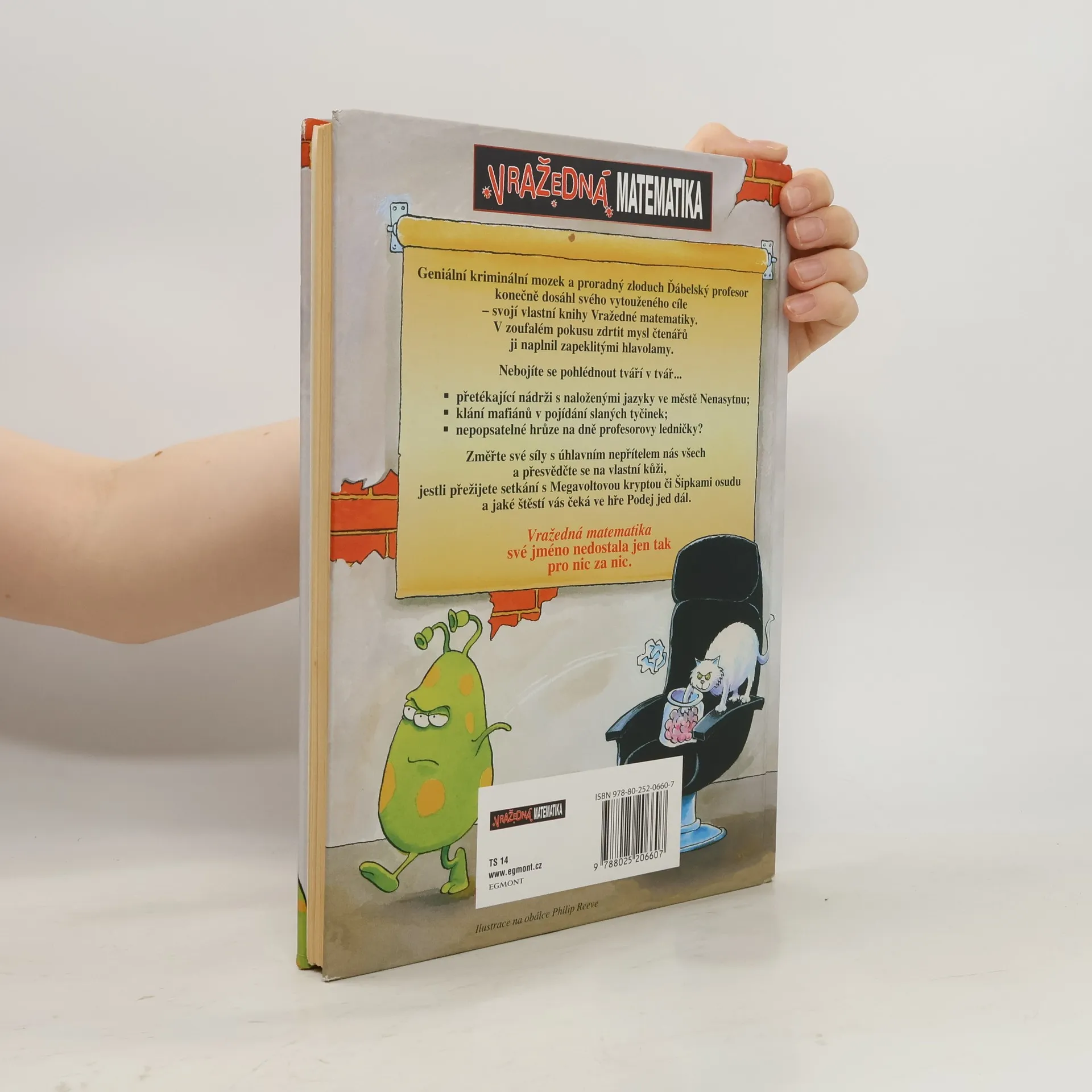Geniální kriminální mozek a proradný zloduch Ďábelský profesor konečně dosáhl svého vytouženého cíle – své vlastní knihy Vražedné matematiky. V troufalém pokusu zdrtit mysl čtenářů naplnil ji zapeklitými hlavolamy. Setkáte se v ní s přetékající nádrží s naloženými jazyky ve městě Nenasytnu, budete svědky klání mafiánů za úsvitu v pojídání slaných tyčinek a možná vás zachvátí i nepopsatelná hrůza z toho, co se skrývá na dně profesorovy ledničky? Změřte své síly s úhlavním nepřítelem nás všech a přesvědčte se na vlastní kůži, jestli přežijete setkání s Megavoltovou kryptou či Šipkami osudu a jaké štěstí vás čeká ve hře Podej jed dál. Vražedná matematika své jméno nedostala jen tak pro nic za nic.