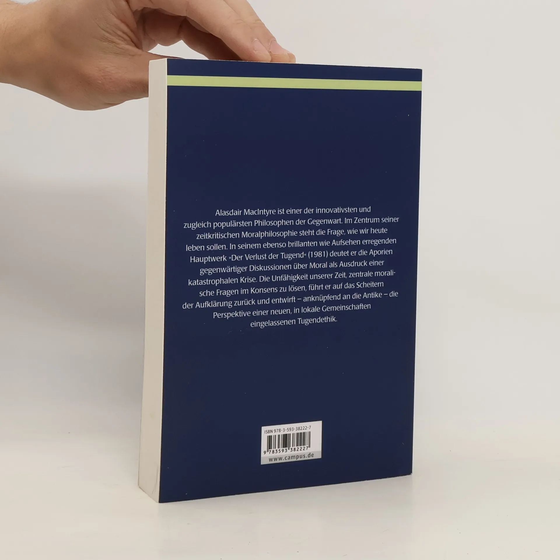 Alasdair MacIntyre ist einer der innovativsten und zugleich populärsten Philosophen der Gegenwart. Im Zentrum seiner zeitkritischen Moralphilosophie steht die Frage, wie wir heute leben sollen. In seinem ebenso brillanten wie Aufsehen erregenden Hauptwerk Verlust der Tugen« (1981) deutet er die Aporien gegenwärtiger Diskussionen über Moral als Ausdruck einer katastrophalen Krise. Die Unfähigkeit unserer Zeit, zentrale moralische Fragen (wie Abtreibung oder Krieg) im Konsens zu lösen, führt er auf das Scheitern der Aufklärung zurück und entwirft – anknüpfend an die Antike – die Perspektive einer neuen, in lokale Gemeinschaften eingelassenen Tugendethik.