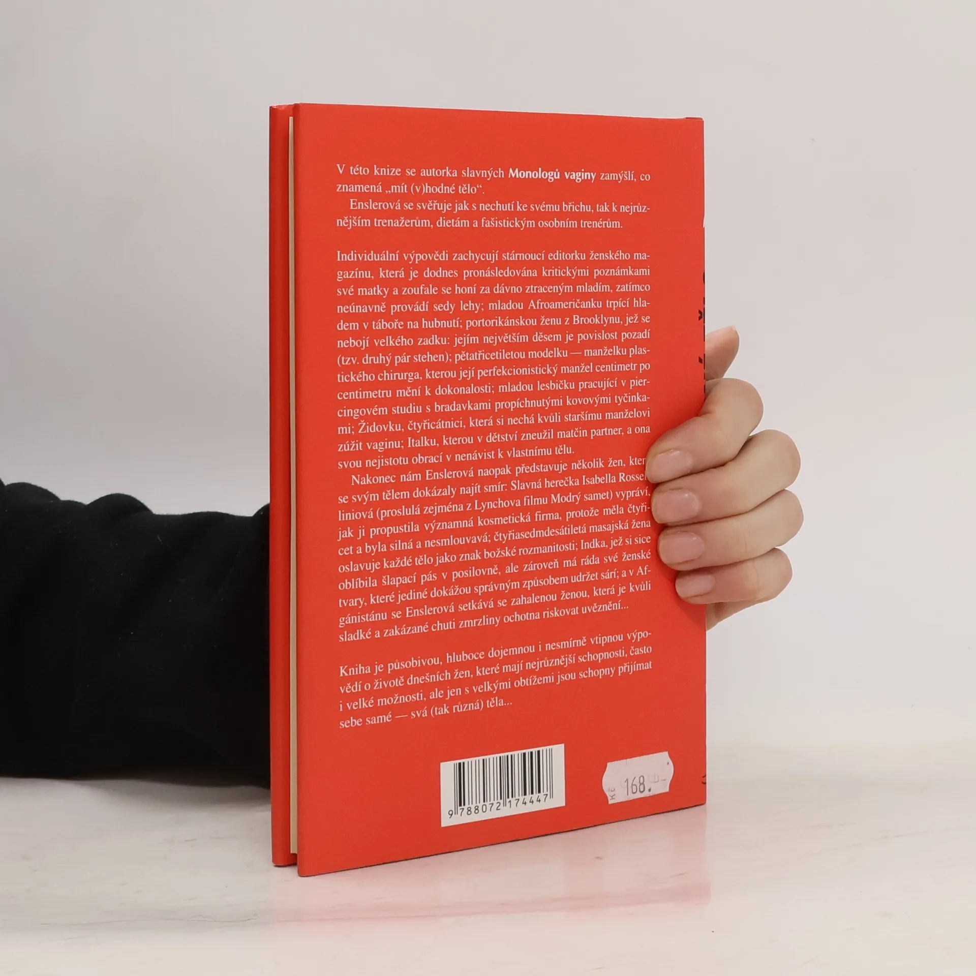 Autorka slavných Monologů vaginy se v této knize zamýšlí nad tím, co znamená „mít (v)hodné tělo“. Sdílí své pocity ohledně svého „více než čtyřicetiletého“ břicha a kritiky ze strany matky, zatímco se snaží vrátit do ztraceného mládí. Individuální příběhy zahrnují stárnoucí editorku ženského magazínu, mladou Afroameričanku trpící hladem v táboře na hubnutí, portorikánskou ženu z Brooklynu, která se nebojí svého těla, a modelku, kterou její perfekcionistický manžel neustále mění. Dále se objevuje mladá lesbička z piercingového studia, Židovka, která si kvůli manželovi zúžila vaginu, a Italka, jež se potýká s traumatem z dětství. Na závěr se autorka zaměřuje na ženy, které našly smír se svým tělem: herečka Isabella Rossellini, která byla propuštěna kvůli svému věku a síle; masajská žena, oslavující rozmanitost; Indka, jež miluje své ženské tvary; a afghánská žena, která riskuje uvěznění kvůli touze po zmrzlině. Kniha je hluboce dojemnou a vtipnou výpovědí o životě dnešních žen, které se snaží přijmout svá různorodá těla.