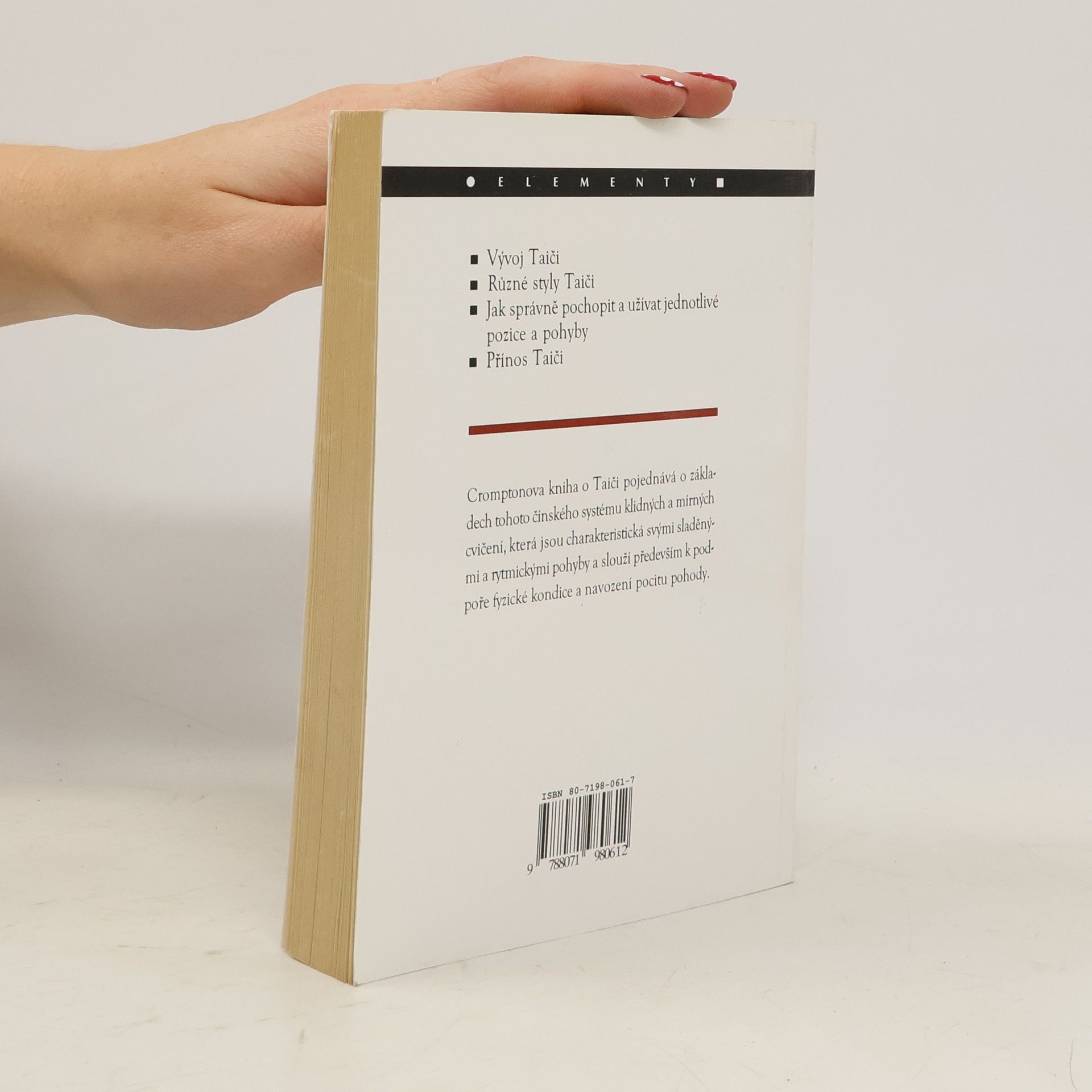 Tato kniha o Taiči pojednává o základech tohoto čínského systému klidných a mírných cvičení, které jsou charakteristické svými sladěnými a rytmickými pohyby. Jedná se o knihu bez přílohy, není-li na vyfocena.