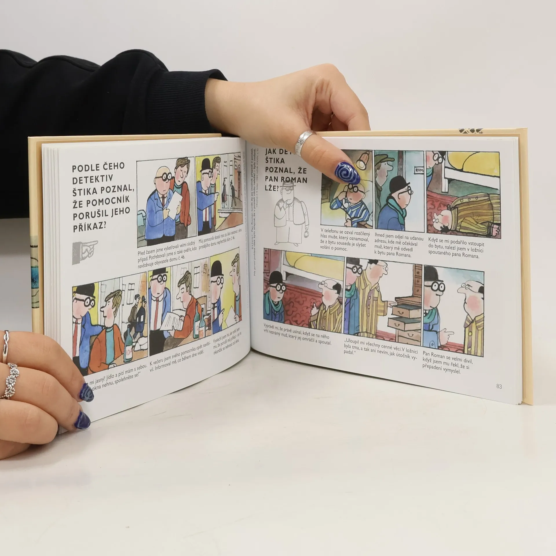 Otazníky detektiva Štiky patří mezi komiksy, které si oblíbilo hned několik generací čtenářů. Komiks o obtloustlém detektivovi, který řeší zapeklité případy, a úlohou čtenářů je odhalit jejich řešení, vycházel více než deset let v časopise Ohníček. Významný malíř Jiří Kalousek kreslil detektiva nejdřív černobíle, později i barevně. V naší knize je výběr z více než 350 komiksů, při výběru jsme se opírali především o dochované originály.