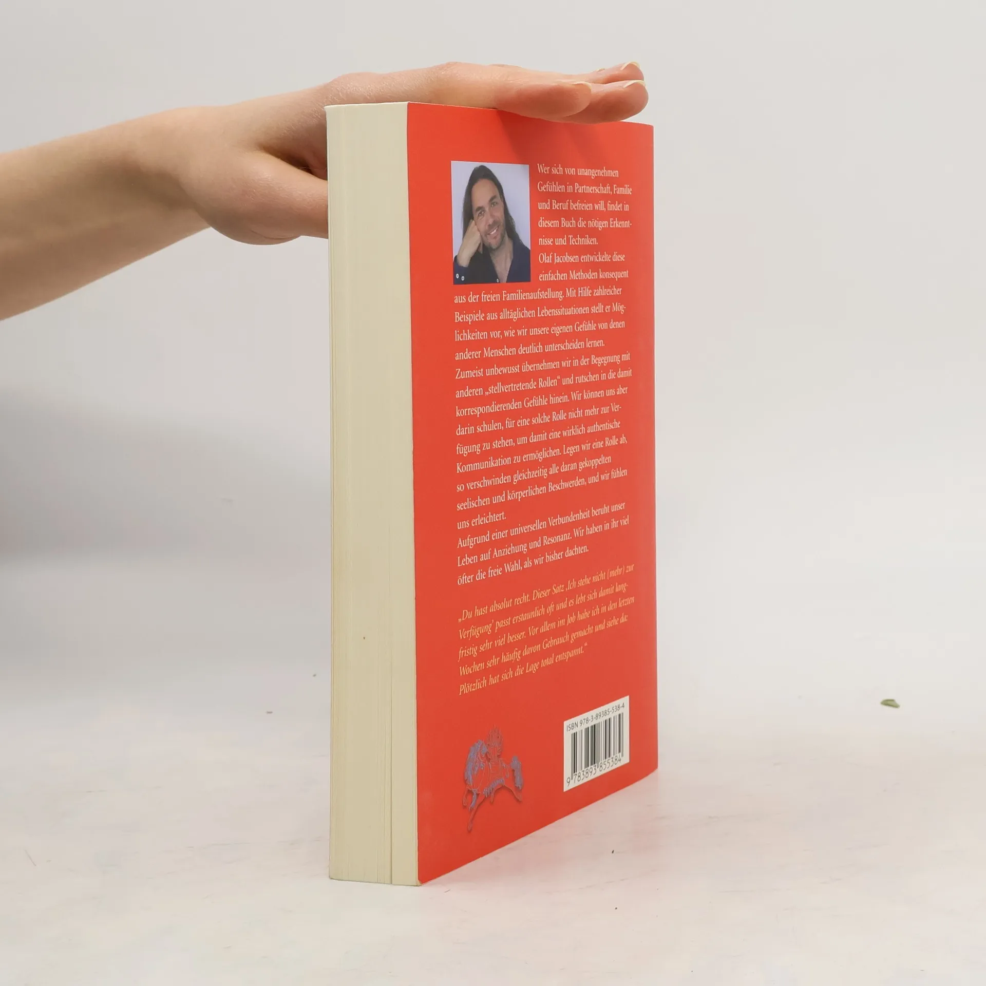 Wer sich von unangenehmen Gefühlen in Partnerschaft, Familie und Beruf befreien will, findet in diesem Buch die nötigen Erkenntnisse und Techniken. Olaf Jacobsen entwickelte diese einfachen Methoden konsequent aus der freien Familienaufstellung. Mit Hilfe zahlreicher Beispiele aus alltäglichen Lebenssituationen stellt er Möglichkeiten vor, wie wir unsere eigenen Gefühle von denen anderer Menschen deutlich unterscheiden lernen. Zumeist unbewusst übernehmen wir in der Begegnung mit anderen „stellvertretende Rollen“ und rutschen in die damit korrespondierenden Gefühle hinein. Wir können uns aber darin schulen, für eine solche Rolle nicht mehr zur Verfügung zu stehen, um damit eine wirklich authentische Kommunikation zu ermöglichen. Legen wir eine Rolle ab, so verschwinden gleichzeitig alle daran gekoppelten seelischen und körperlichen Beschwerden, und wir fühlen uns erleichtert. Aufgrund einer universellen Verbundenheit beruht unser Leben auf Anziehung und Resonanz. Wir haben in ihr viel öfter die freie Wahl, als wir bisher dachten. Kerstin aus Berlin: „Du hast absolut recht. Dieser Satz “Ich stehe nicht (mehr) zur Verfügung„ passt erstaunlich oft und es lebt sich damit langfristig sehr viel besser. Vor allem im Job habe ich in den letzten Wochen sehr häufig davon Gebrauch gemacht und siehe da: Plötzlich hat sich die Lage total entspannt.“