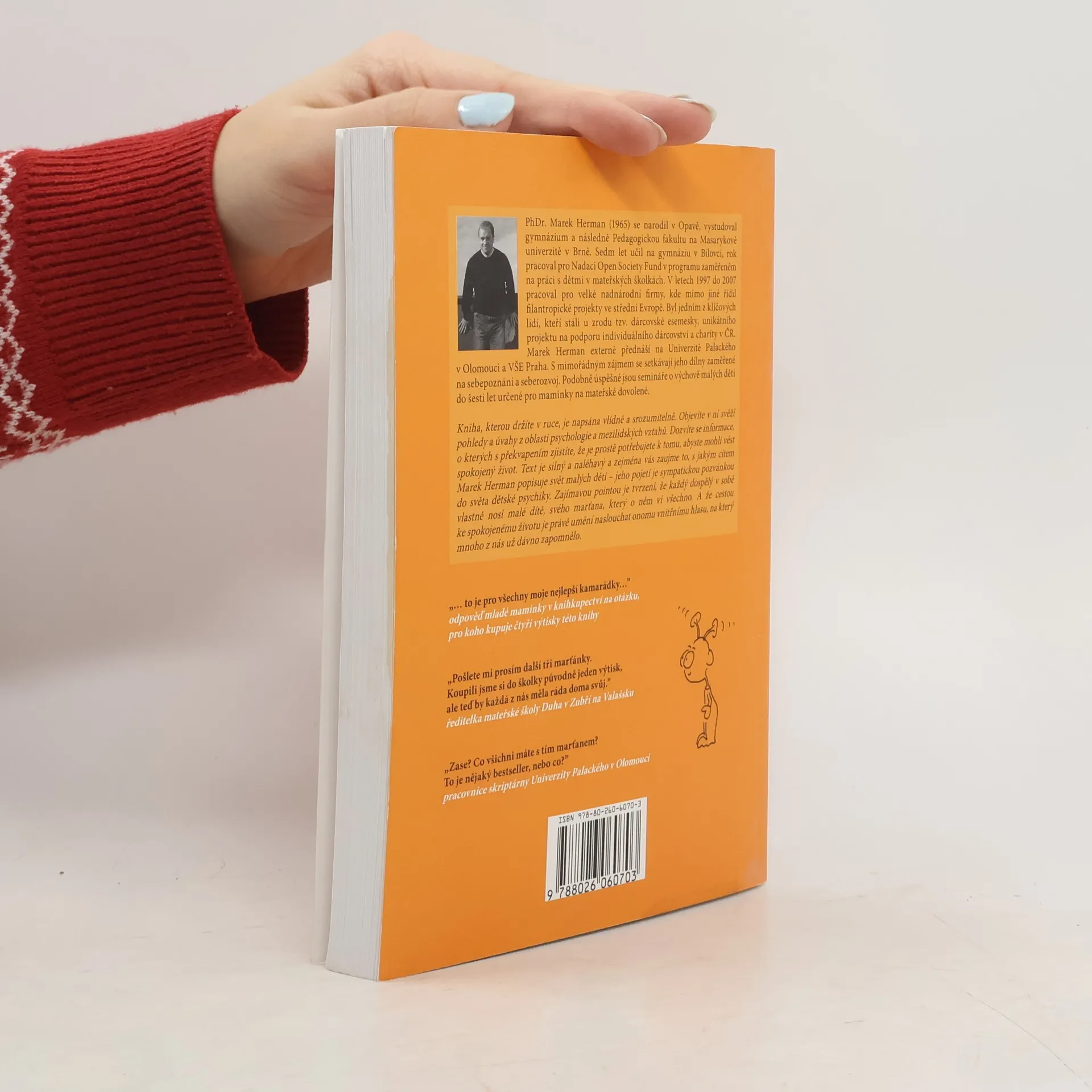 Kniha je cenná hlavně tím, že je napsána odborně, přitom naprosto srozumitelně, autor si s pomyslným čtenářem vlastně povídá. Objevíte v ní svěží pohledy a úvahy z oblasti sebepoznání, mezilidských vztahů a výchovy malých dětí. Dozvíte se informace, o kterých s překvapením zjistíte, že je prostě potřebujete k tomu, abyste mohli vést spokojený život. Text v knize je silný a místy až naléhavý a zejména vás zaujme to, s jakým citem Marek Herman popisuje svět malých dětí.