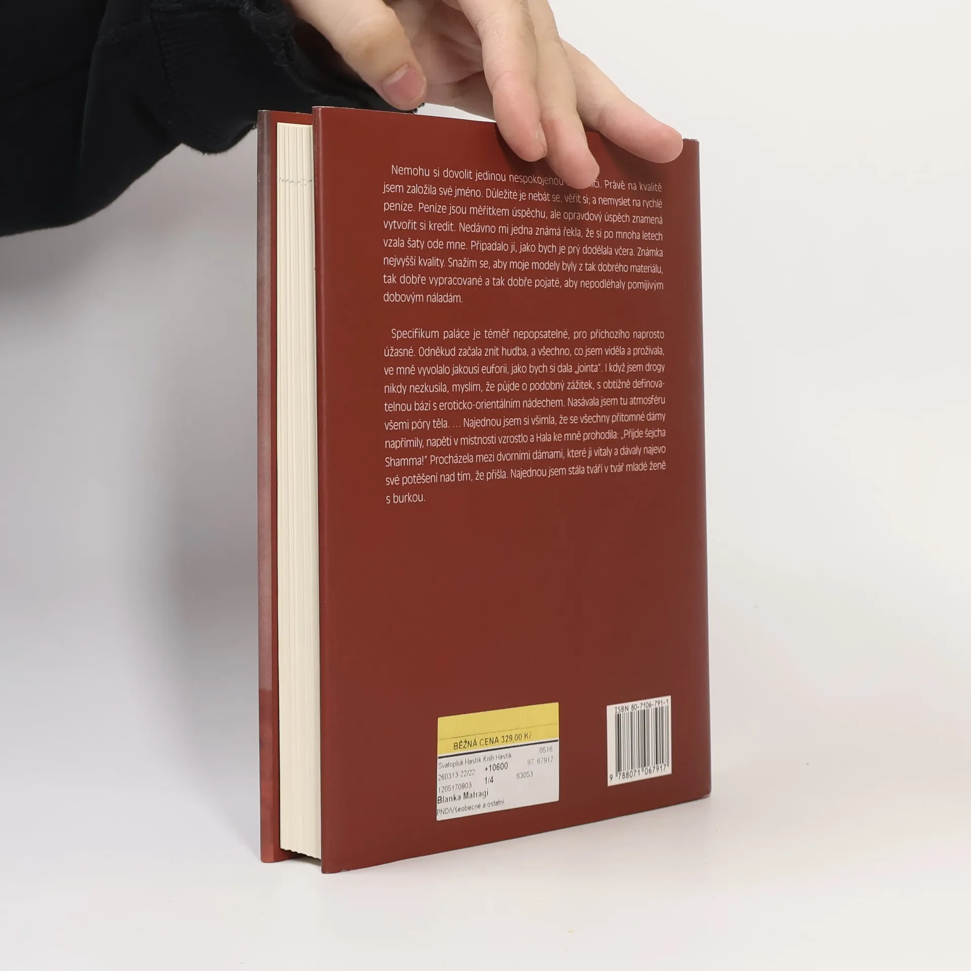 Třináct kapitol životního příběhu Blanky Matragi mění v rychlých střizích své "kulisy" : od rodné Světlé nad Sázavou, přes Vysokou školu umělecko-průmyslovou, až po roky v Libanonu, kam odešla za svým mužem Makramem. Autorka barvitě líčí drsná léta libanonské války, během níž v centru Bejrútu odvážně otevřela svůj salon haute couture, úspěch u zdejší zhýčkané klientely, počátky kontaktů s Perským zálivem i svůj vstup do prvního královského paláce.
