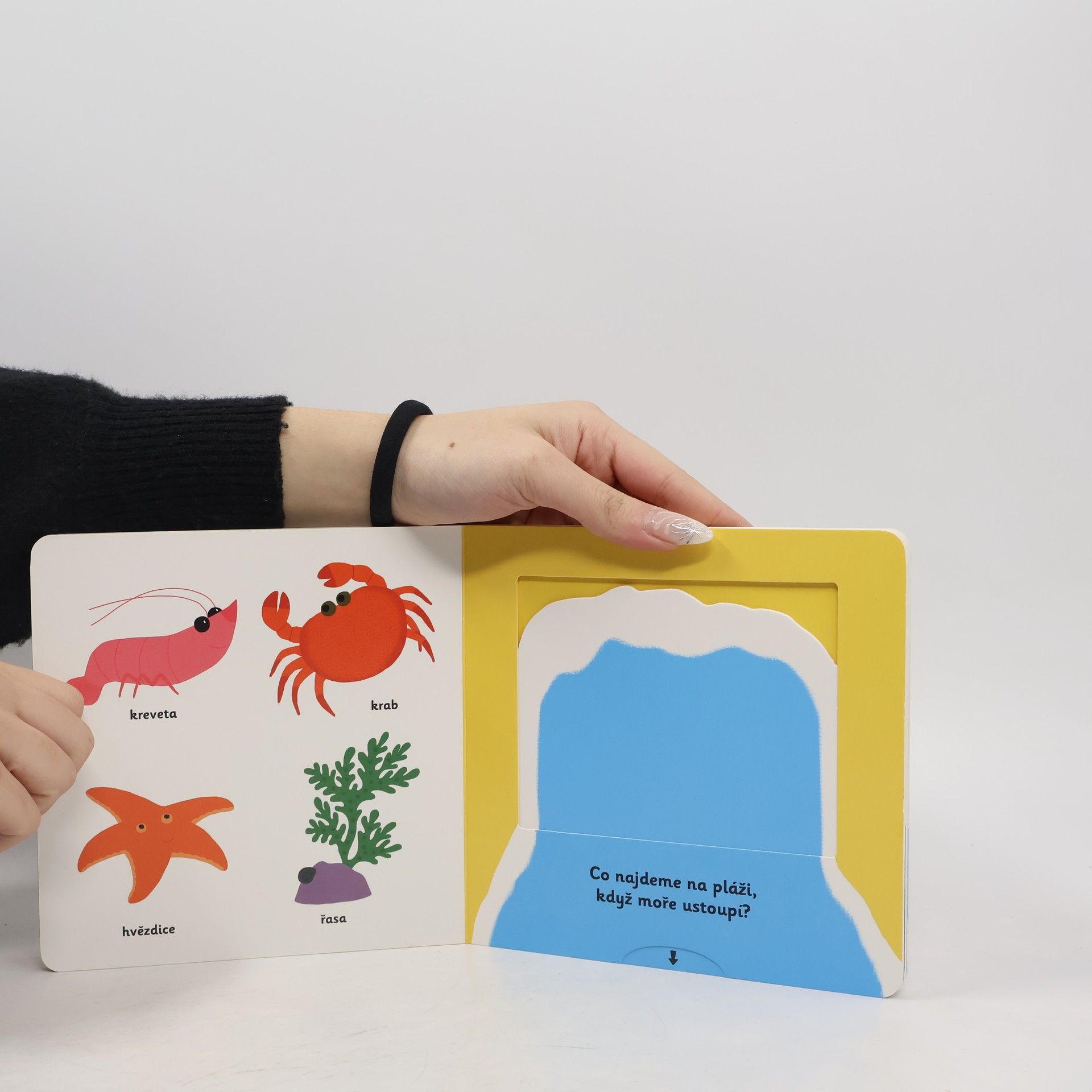 Pojďme na pláž a taky do moře mezi vlny! Co všechno si vezmeš s sebou? Plavky, kruh a taky lopatičku na písek! Knížka plná pestrých ilustrací je vhodná pro nejmenší děti, které si díky ní procvičí jemnou mototriku – obsahuje totiž velké množství nejrůznějších pohyblivých částí a okének, které obrázky oživují. Knížka s prvky Montessori.