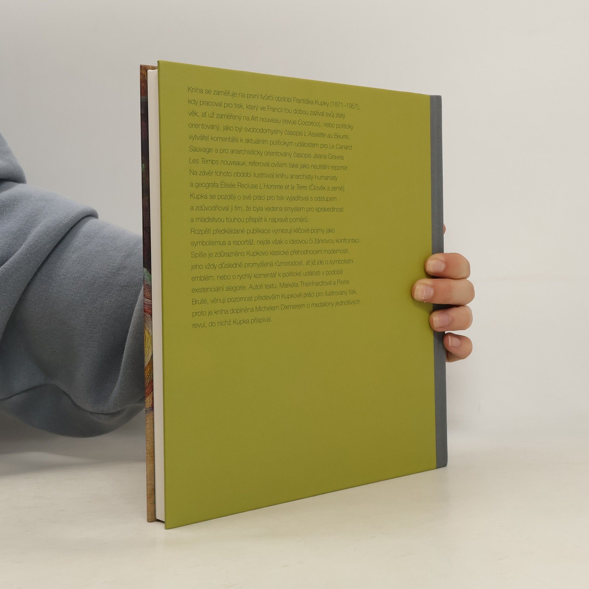 Kniha se zaměřuje na první tvůrčí období Františka Kupky (1871–1957), kdy pracoval pro tisk, který ve Francii tou dobou zažíval svůj zlatý věk, ať už zaměřený na Art nouveau (revue Cocorico), nebo politicky orientovaný, jako byl svobodomyslný časopis L?Assiette au Beurre, vytvářel komentáře k aktuálním politickým událostem pro Le Canard Sauvage a pro anarchisticky orientovaný časopis Jeana Gravea Les Temps nouveaux, referoval ovšem také jako neutrální reportér. Na závěr tohoto období ilustroval knihu anarchisty-humanisty a geografa Élisée Recluse L?Homme et la Terre (Člověk a země). Kupka se později o své práci pro tisk vyjadřoval s odstupem a zdůvodňoval ji tím, že byla vedena smyslem pro spravedlnost a mladistvou touhou přispět k nápravě poměrů. Rozpětí předkládané publikace vymezují klíčové pojmy jako symbolismus a reportáž, nejde však o ideovou či žánrovou konfrontaci. Spíše je zdůrazněno Kupkovo klasické přehodnocení modernosti, jeho vždy důsledně promyšlená různorodost, ať již jde o symbolistní emblém, nebo o rychlý komentář k politické události v podobě existenciální alegorie. Autoři textu, Markéta Theinhardtová a Pierre Brullé, věnují pozornost především Kupkově práci pro ilustrovaný tisk, proto je kniha doplněna Michelem Dixmierem o medailony jednotlivých revuí, do nichž Kupka přispíval.
