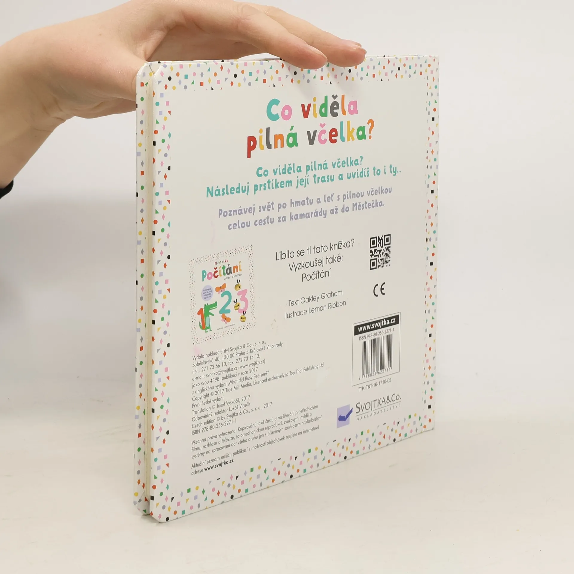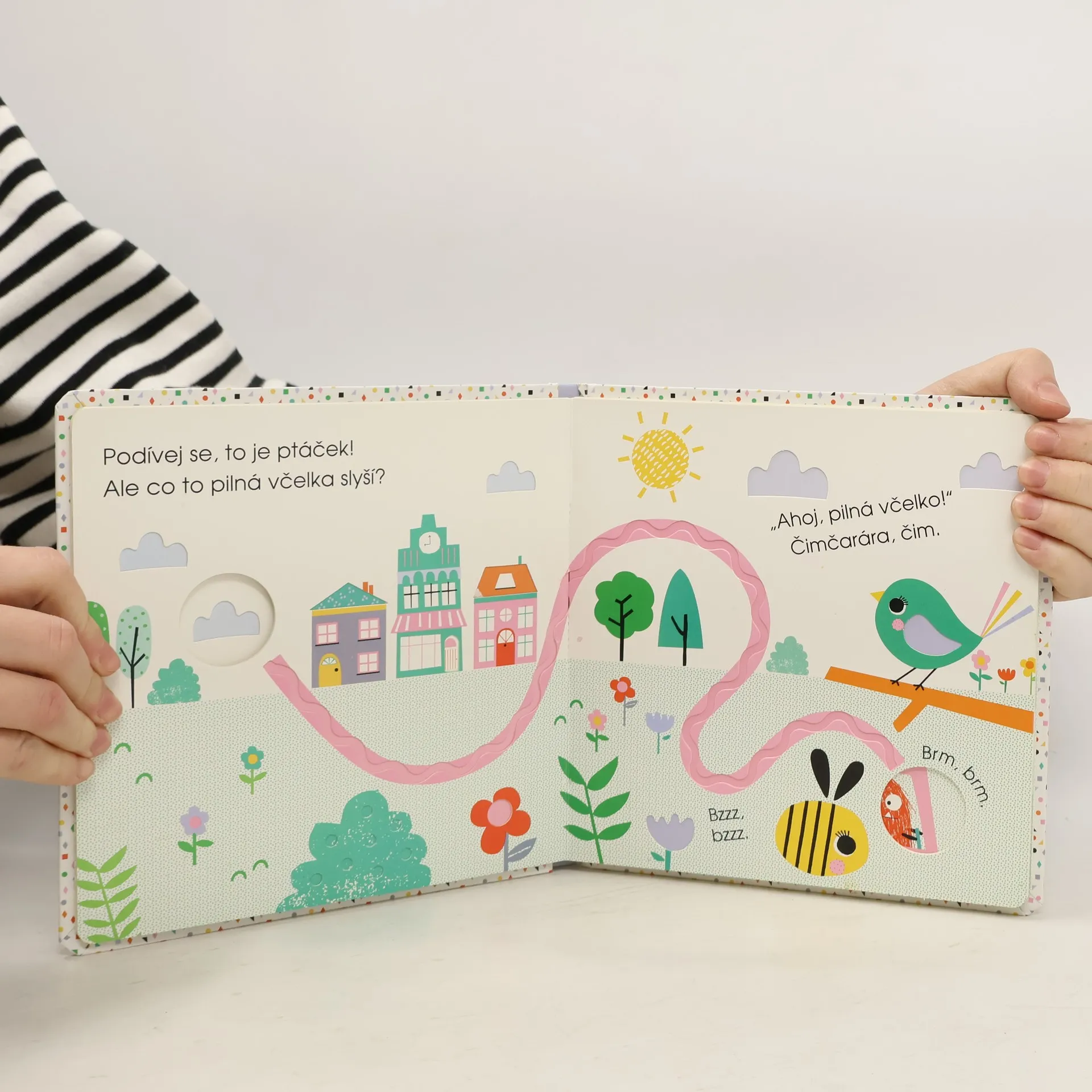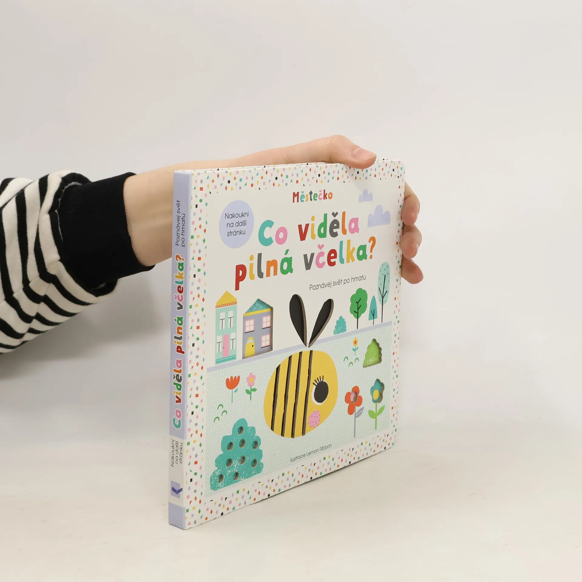 Co viděla pilná včelka? Následuj prstíkem její trasu a uvidíš to také. Na své cestě slyšela krásně zpívat ptáčka a pozdravila příšerku v autě. S pomocí motýlka hledala další kamarády. A nakonec je našla – s kočičkou a pandou si udělaly piknik! Kniha umožňuje nejmenším čtenářům poznávat svět po hmatu. Neotřelé ilustrace podporují fantazii dětí a vtahují je do prostředí Městečka, které je plné kamarádských zvířátek. Dotykové prvky v knize rozvíjejí smysly a jemnou motoriku, výřezy v podobě okének nechávají malé čtenáře nakouknout na následující stránku, takže se vždy mohou těšit, co přijde a koho dalšího na cestě se včelkou potkají.