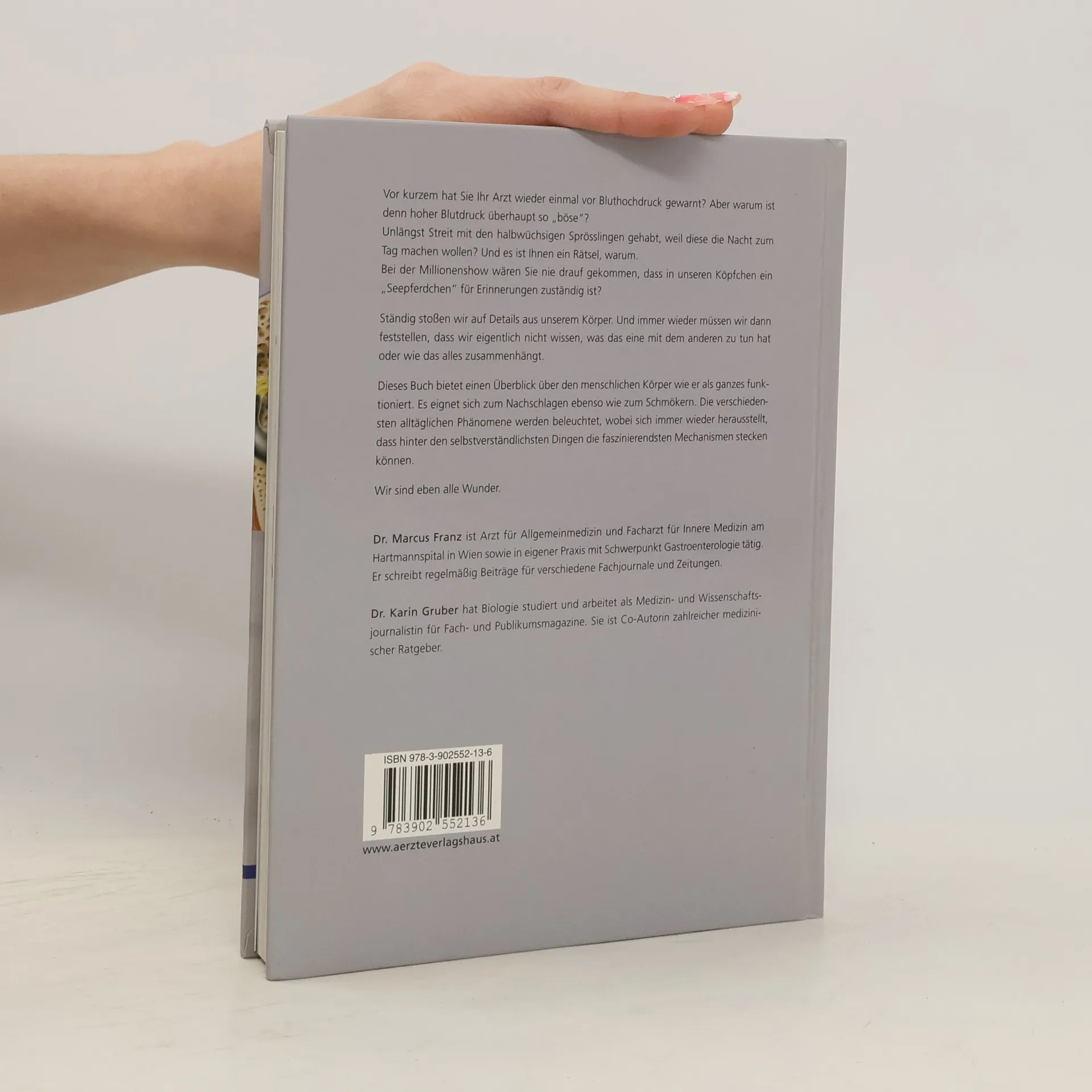 Reisen durch unseren Körper. Wie arbeitet unser Körper bzw. warum funktioniert er in einer ganz bestimmten Weise? Immer wieder gestellte Fragen, die auch immer neue Antworten bedingen, denn die Erforschung des „menschlichen Innenlebens“ ist noch längst nicht abgeschlossen. Dass die wissenschaftlich-aktuelle Darstellung der Abläufe in unserem Körper aber nicht fad von Kopf bis Fuß abgehandelt werden muss, beweist dieses Buch. Anhand von Alltagssituationen, wie sie jeder durchlebt, werden die Funktionen des Körpers spannend leicht nachvollziehbar erörtert, und zwar unter Berücksichtigung aller Unterschiede zwischen Frau und Mann – die viel größer sind, als die meisten glauben. Großformatige Fotos von Wachsmodellen aus dem weltberühmten Josephinum machen die Vermittlung der Körperinnenwelt auch optisch zu einem Erlebnis. Ein wissenschaftlich fundiertes Buch, durch seinen ungewöhnlichen Zugang leicht lesbar, in sehr ansprechender Gestaltung.