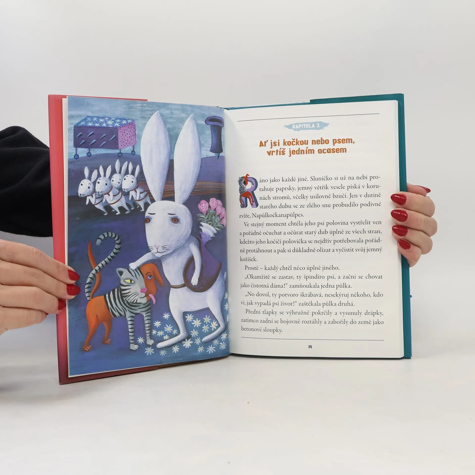 Kožíšek má napůl mourovatý, napůl hnědorezavý. Přední tlapky kočičí a zadní psí. Na zadečku dva ocásky a na hlavě jedno ucho vztyčené a druhé visící. Kdo je to? Přece Napůlkočkanapůlpes - netradiční hrdina pohádky, která pobaví děti i dospělé. Vydejte se s Napůlkočkounapůlpsem a zaječicí Ramlou na cestu za kouzelníkem Abrakadrnožkou a zažijte jelení svatbu nebo útěk před vlky. Zvládnete rozluštit hádanku Sfingy? Potkáte i permoníky a létající klobouky a mnoho dalších tvorů. Naučí se kočka se psem respektu a spolupráci? Vrátí se jim původní podoba? Začtěte se a zjistíte sami.