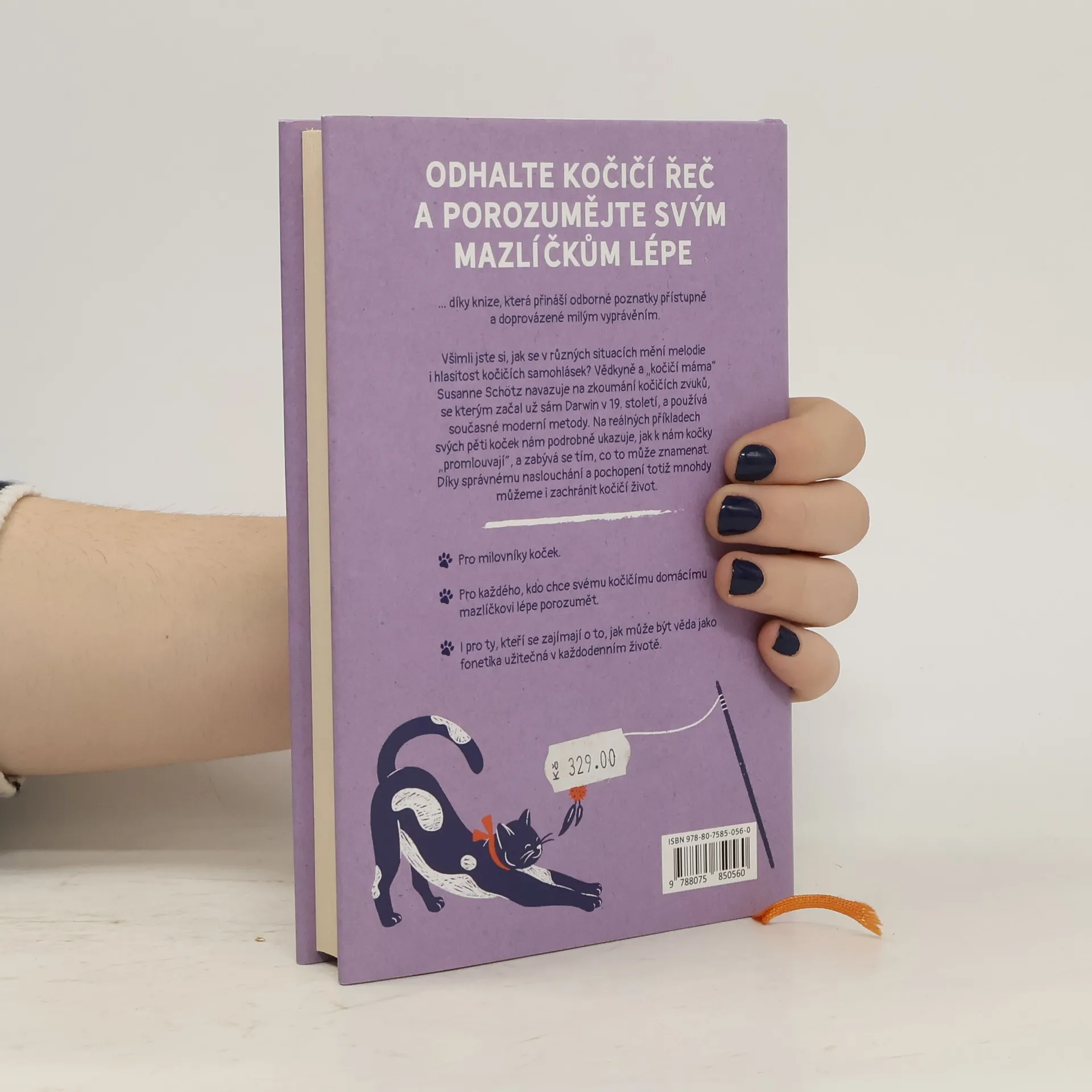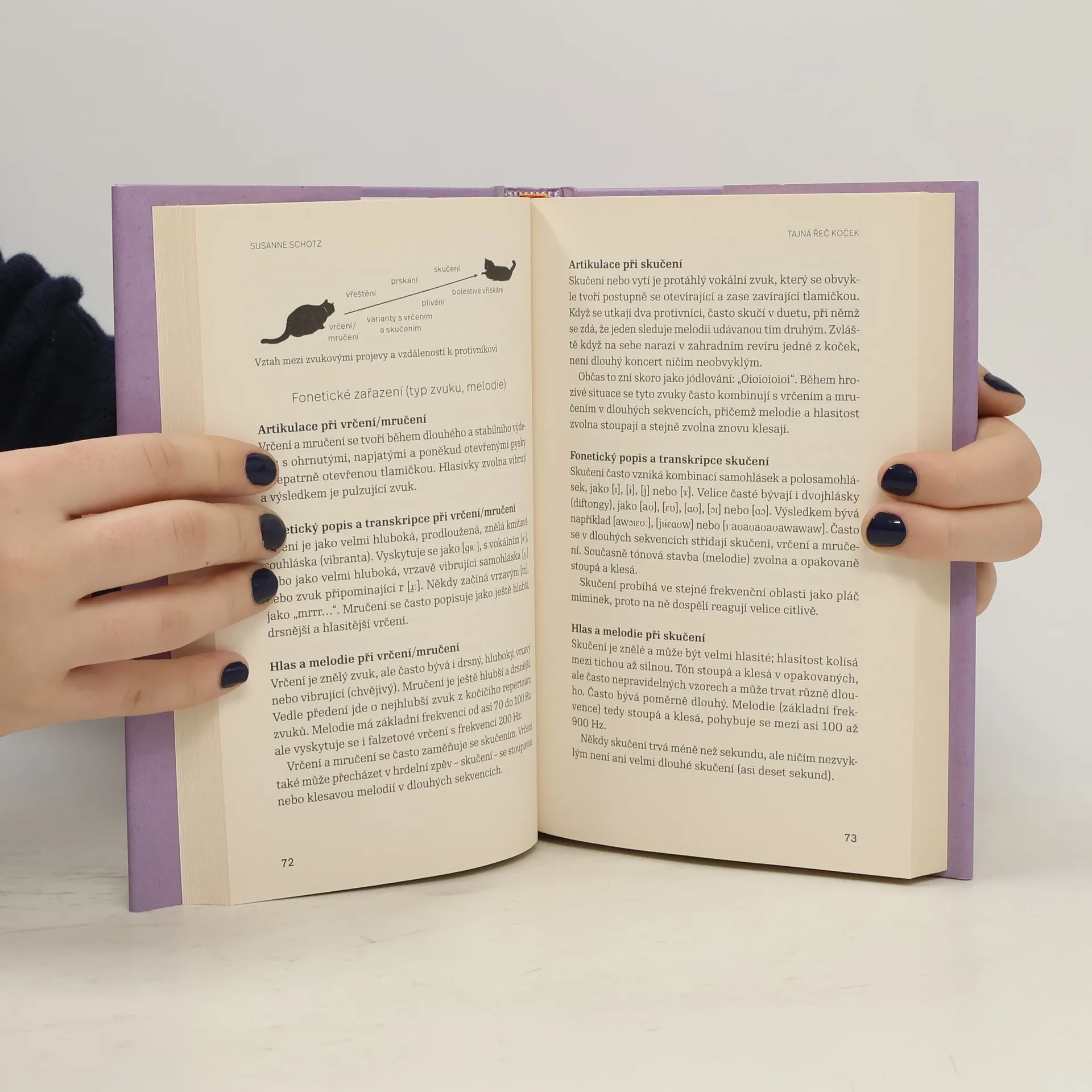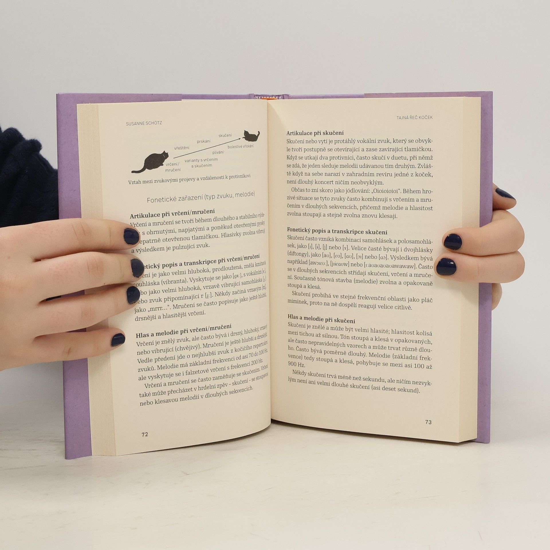 Nelámali jste si už někdy hlavu nad tím, co vám chce vaše kočka vlastně říct? Susanne Schötz se této záhadě snaží přijít na kloub pomocí foneticko-lingvistických metod. Jako hrdá majitelka pěti koček analyzovala celou paletu jejich zvukových projevů a zkoumala, co mohou v různých situacích znamenat. O své poznatky se nyní dělí se čtenáři. Kromě rychlokurzu kočičí fonetiky nabízí jejich milovníkům i praktické tipy, které mohou využít při péči o vlastní kočku. Po přečtení knihy je mohou čekat překvapivá zjištění. Nebo mohou svému miláčkovi lépe porozumět. Každopádně se však jejich vzájemný vztah zlepší.