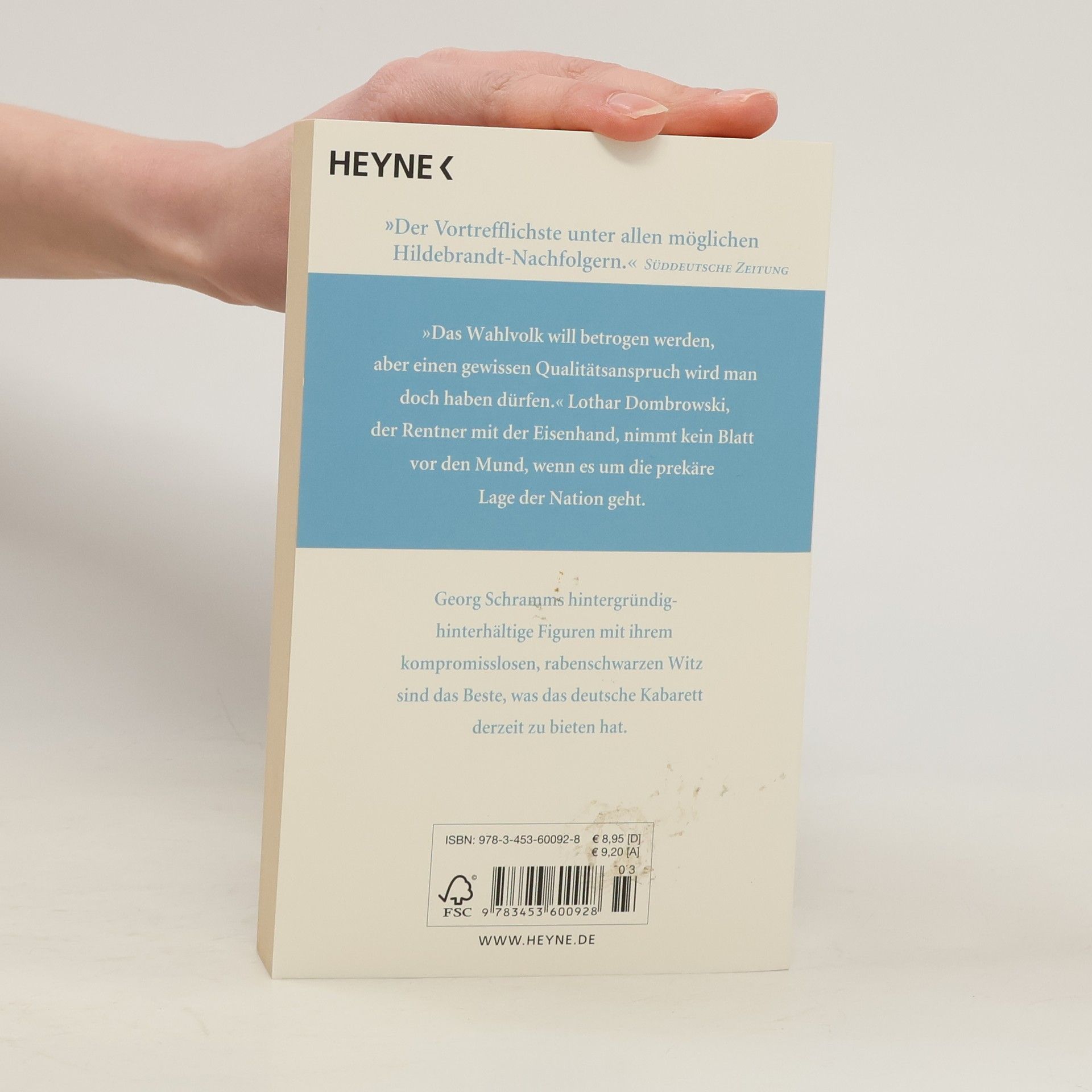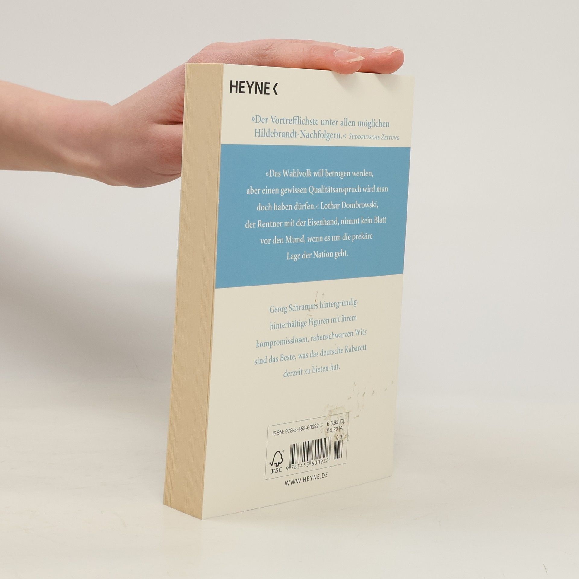 »Das Wahlvolk will betrogen werden, aber einen gewissen Qualitätsanspruch wird man doch haben dürfen.« Lothar Dombrowski, der Rentner mit der Eisenhand, nimmt kein Blatt vor den Mund, wenn es um die prekäre Lage der Nation geht – und Georg Schramms hintergründig-hinterhältige Figuren mit ihrem kompromisslosen, rabenschwarzen Witz sind das Beste, was das deutsche Kabarett derzeit zu bieten hat.