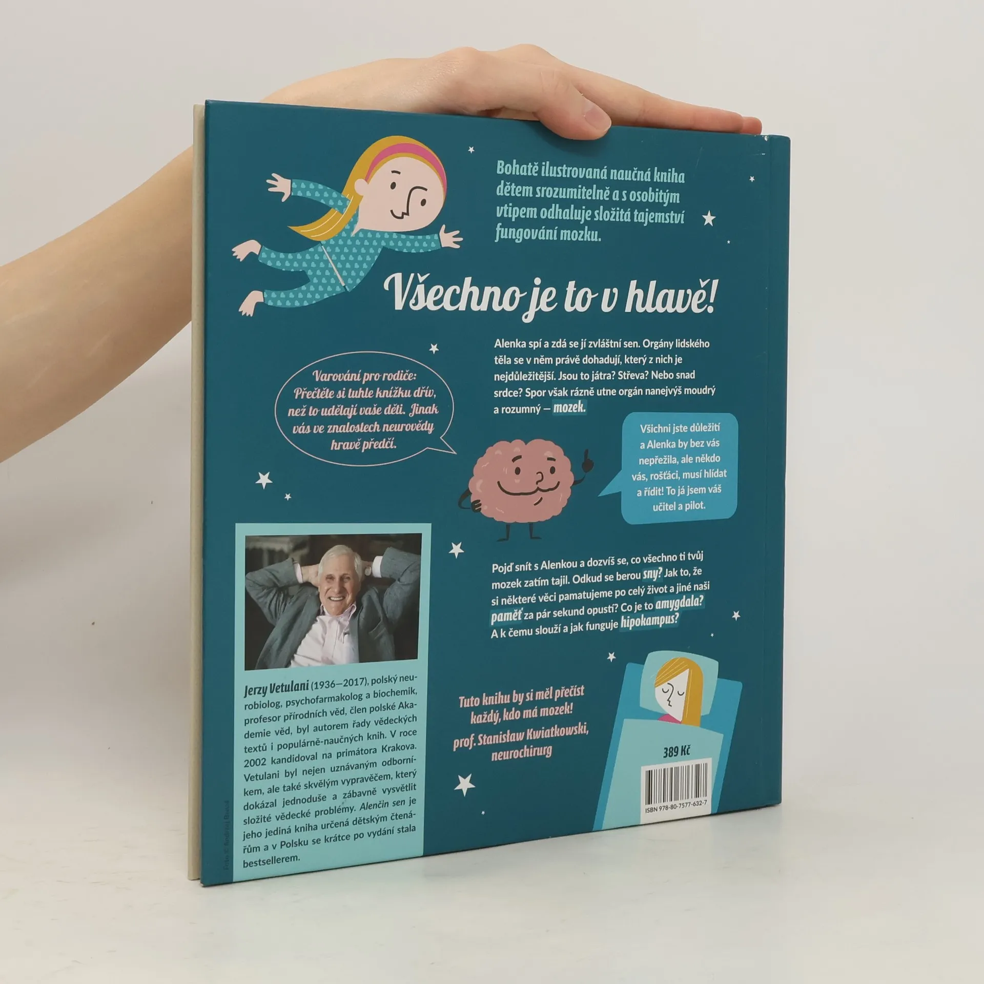 Když Alenka spí, probouzejí se neurony. Popravdě řečeno, ony nikdy nespí, nanejvýš si někdy potřebují trochu odpočinout. Dnes v noci připravil mozek Alence neobyčejný sen, ve kterém jí bude vyprávět o tom, jak řídí celé tělo. Pojď snít s Alenkou a objevíš tolik úžasných věcí, až se ti bude tajit dech. Zábavná, bohatě ilustrovaná naučná kniha odhaluje dětem tajemství fungování mozku. Přináší spoustu informací, a přesto čtenáře nezahltí. Je názorná, srozumitelně a neobyčejně poutavě napsaná. A navíc je vtipná, takže ji děti (a rozhodně nejen ony!) budou číst jako napínavý dobrodružný příběh. Autor knihy Jerzy Vetulani byl nejen světově uznávaným odborníkem, ale také skvělým vypravěčem, který dokázal jednoduše a zábavně vysvětlit složité vědecké problémy. Alenčin sen je jeho jediná kniha určená dětským čtenářům. Pro děti od šesti let.