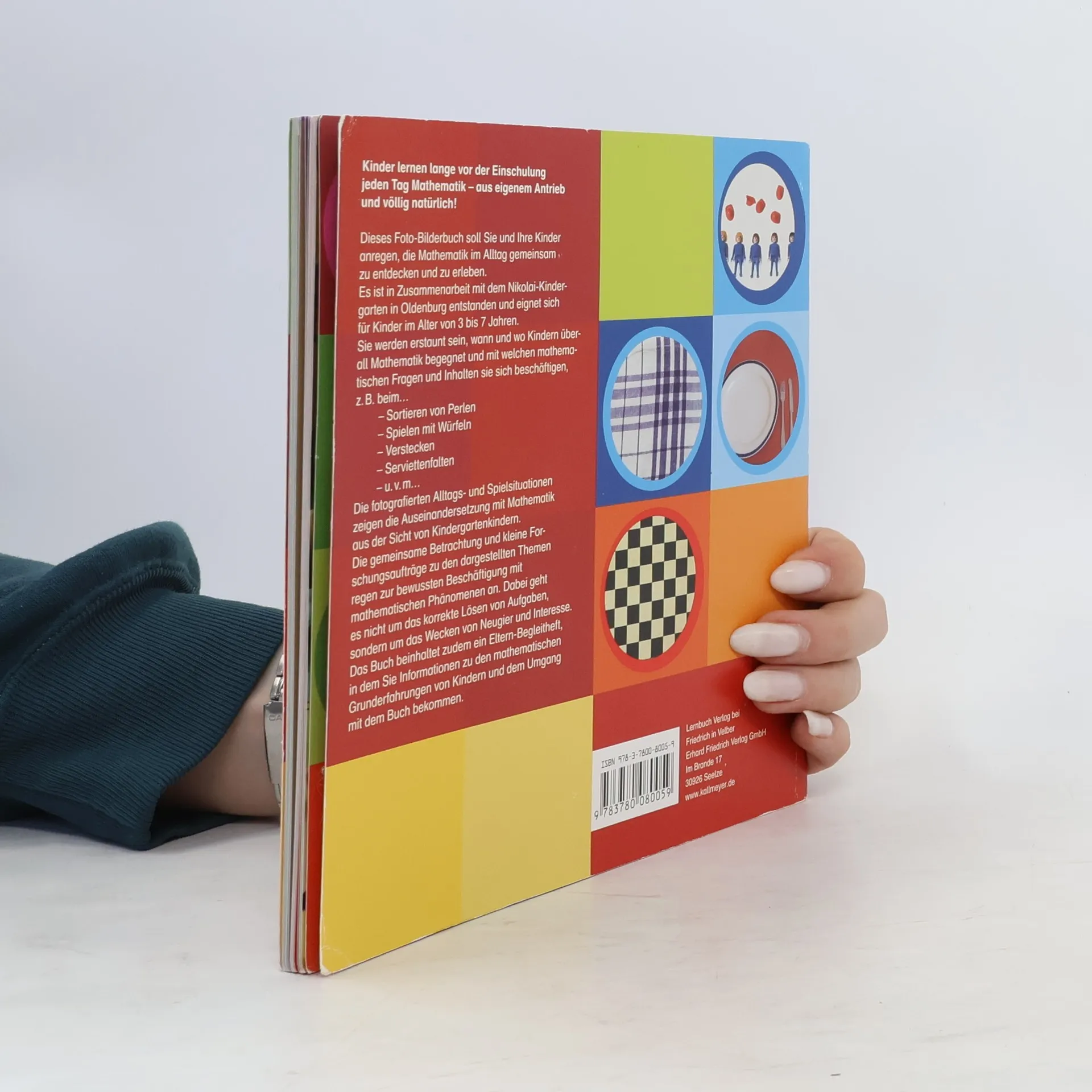 Für Kinder ist (Mathematik-)Lernen etwas Selbstverständliches, manchmal Aufregendes und vor allem Schönes. Jeden Tag stellen sie sich und Erwachsenen Fragen, sind kreativ, erforschen ihre Umgebung und finden Lösungen zu Problemen. Das Foto-Bilderbuch Mit Kindern Mathematik erleben zeigt anhand vieler authentischer Fotos und Kommentare, wie Kindergartenkinder im Alltag z. B. Mustern und Körperformen, Längen und Zeit begegnen. Mit Kindern Mathematik erleben ist für drei- bis siebenjährige Kinder. Die gemeinsame Betrachtung mit Erwachsenen regt zur bewussten Beschäftigung mit mathematischen Phänomenen an. Dabei geht es nicht um das korrekte Lösen von Aufgaben, sondern um das Wecken von Neugier und Interesse. Kinder erkennen in den Bildern ihre eigenen Erfahrungen und Erlebnisse wieder; zahlreiche „Forschungsaufträge“ regen sie zu Erkundungen und Experimenten mit Zahlen, Formen, Größen und Daten an. Dabei setzen sie ihr vorhandenes Wissen ein und bauen es weiter aus. Das Buch beinhaltet zudem ein Eltern-Begleitheft, in dem Sie Informationen zu den mathematischen Grunderfahrungen von Kindern und Anregungen zum Umgang mit dem Buch bekommen.