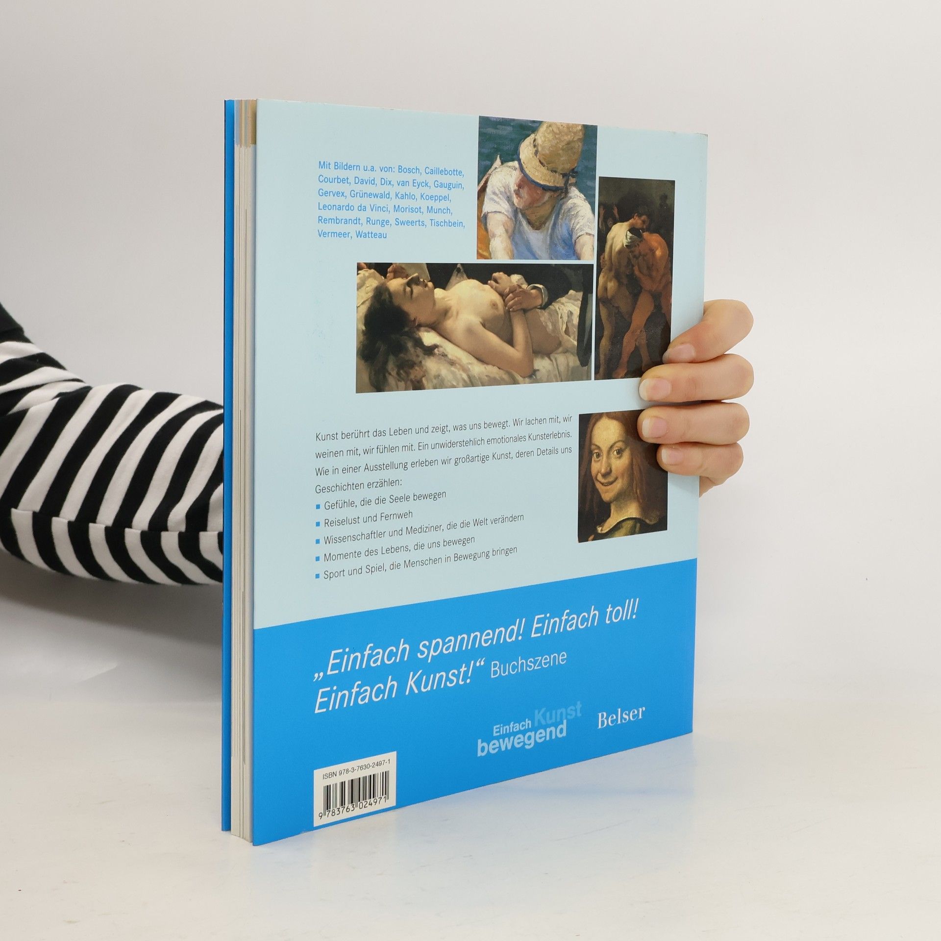 Sehen und erleben, was uns bewegt. Es ist so Einfach Kunst zu erleben. Wie in einer Ausstellung werden Bilder aus allen Epochen der Kunstgeschichte erfahrbar. Im neuen Band bewegend Einfach Kunst geht es um Themen, die Menschen bewegen oder in Bewegung bringen: Berühmte Gemälde erzählen, wie Gefühle die Seele bewegen, uns die Reiselust in die Ferne treibt, Wissenschaftler und Mediziner die Welt verändern und Sport seit der Antike die Menschen in Bewegung gebracht hat. Themen, die bewegen oder in Bewegung bringen: Höher, schneller, weiter – den Körper bewegen Geheimnis der Gefühle – Was unsere Seele bewegt Nix wie weg – Reiselust und Fernweh Gaukler, Heiler und Gelehrte – Menschen, die die Welt bewegten Im Rhythmus des Lebens – große und kleine bewegende Momente Mit Bildern u. a. von: Böcklin, Bosch, Brueghel, Courbet, Dix, van Eyck, Feininger, Gauguin, Grünewald, Holbein, Morisot, Munch, Rembrandt, Runge, Tischbein, Vermeer, Watteau