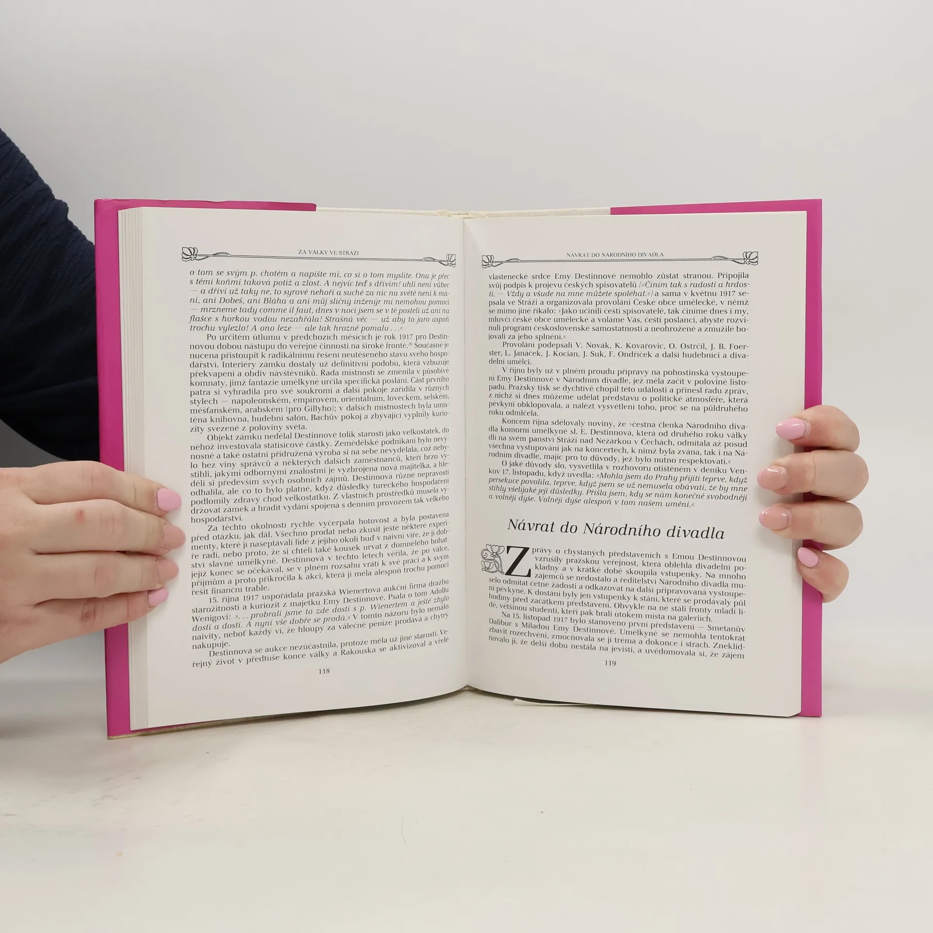 Kniha je zajímavá tím, že autor věnoval skutečně mnoho pozornosti početné korespondenci pěvkyně, z níž v knize často cituje, uvádí také svědectví současníků či úryvky z dobového tisku a dalších písemností z pražských a mimopražských archivů. Jaká byla, když se narodila… „O svém narození Destinnová ráda vyprávěla se sarkastickým humorem jí vlastním. Narodila se v hodině, kdy šel kolem jejich domu v Kateřinské ulici ‚proti blázinci‘ pohřební průvod; přišla na svět škaredá jako vrána s černým porostem na špičaté hlavě, s pytlíčky pod očima, až se jí její krásná matka zhrozila…“ Těžké začátky – pokus získat angažmá v Národním divadle: „Vstoupila tehdy s otcem do budovy divadla a byla tam očekávána třemi pány – ředitelem Šubertem, kapelníkem Adolfem Čechem, který zasedl ke klavíru, a druhým kapelníkem Mořicem Angrem. Nezpívala na jevišti za doprovodu orchestru, jak očekávala, nýbrž ve sborovém sále v nejvyšším patře budovy. Na otázku, co přednese, odpověděla: Carmen, neboť byla přesvědčena, že touto rolí ohromí triumvirát rozhodčích. Byla to tehdy její nejoblíbenější divadelní postava a v nejednom směru se s ní i v životě ztotožňovala: nosila v uších velké kruhy jako Carmen, ve stejném stylu se oblékala a upravovala svůj účes. Když dozněla Habanera, vyžádal si kapelník Čech další ukázku a Ema zazpívala árii z druhého jednání téže opery. To už řediteli Šubertovi stačilo k tomu, aby pronesl soud: ‚Slečno, zdá se mi, že se při zpívání rozčilujete. Doporučuji vám, abyste brala sprchy.‘ Rána dopadla tvrdě, že sotva bylo možno očekávat krutější ortel. O zpěvu ani slovo, jen urážka, jakých se pak Kittlové v jejích začátcích dostalo ještě několik.“ Ema Destinnová o Straussově Salome: „18. října [1906] Ta Salome bude mou zkázou! Uvidíte to. Už začínám bláznit. Všude jen to šílenství bez cíle, beztělé, jen stále ten motiv horečné touhy: ‚Lass mich Deinen Mund küssen, Jochanaan‘. K zoufání! A těžká je ta partie, strašlivě těžká… 28. října Mluvíte o Salome. Hrůza! Vlasy se mi při ní ježí, snad strachem nebo studem… Ta hudba Richarda Strausse je šílenství anebo chcete-li horečkou, otravou opiem; hašiš, belladonna, sny morfinisty. Narážím po každé zkoušce ½ hodiny čelem o zeď nebo klavír, to mne zas vrátí světu. 31. října Já jsem věru víc než zapřažena, teď každý den dvě hodiny Salome, až mne z toho duše brní a mozek vysýchá. Pravíte, že slč. Schubert je Bavarií, co pak teď já? Jsem také pro Salome příliš tlustá, ale nejde to všecko… hlas mít a figuru, hlas ujde, avšak ostatní… 14. listopadu Včera jsem uviděla figurínu pro Salome mně intendantem určenou, dejž nebe, abych ten ‚dojem‘ dobře zažila! Něco děsného. Dlouhá košile z fialového crepe de chine, skoro ke krku, vlečka, dlouhé rukávy! Začla jsem zuřit a řekla, že nepůjdu takto ven. […] Nu, Vy mne znáte. Řekla jsem, že neprosadím-li svůj vlastní kostým, že toho vůbec nechám! Ať si zpívá Salome v noční košili kdo chce! 12. prosince Dnes se nade mnou dala má hospodyně Anděla do pláče, vypadám prý tak bídně a hubeně, že je to až hrozné. Věřím jí: Salome nepřispívá nikterak k zachování duševní rovnováhy…“ Amerika, Toscanini: „Zítra přistaneme v Městě Smutku. Nic mne tam netáhne, mám úzkost před Titánem Skokaninim, jak na mne vyvalí oči, když uvidí, že z Fanciully nic, ale nic neumím… 23. listopadu Jsem špatně při hlase a večer je Gioconda, opera mně nanejvýš protivná. Noscanini je pln žluče a choval se včera jako úplný blázen – všemu rozumí lépe a s Puccinim se i o tempa hádá – vjedou si určitě do vlasů… se mnou zachází jako se školačkou a nejraději by snad na mne vzal rákosku. Puccini je opravdu trpělivý a nechá si přede všemi vykládat od toho pána rozumy. Zítra – o můj svátek – si asi znovu ‚zaprubujeme‘. To budu opuštěná a smutná, ale Maestro Vztekanini mi asi vrazí pěknou zkoušku a při té nebudu mít na stesk čas… 25. listopadu Včera jsme zkoušeli až do 12 v noci a T. dostával různé záchvaty vzteku. Konečně jsem prohlásila, že mě ani nenapadne zkoušet dál, že už nemohu. Divím se, že mi nenapráskal!“
