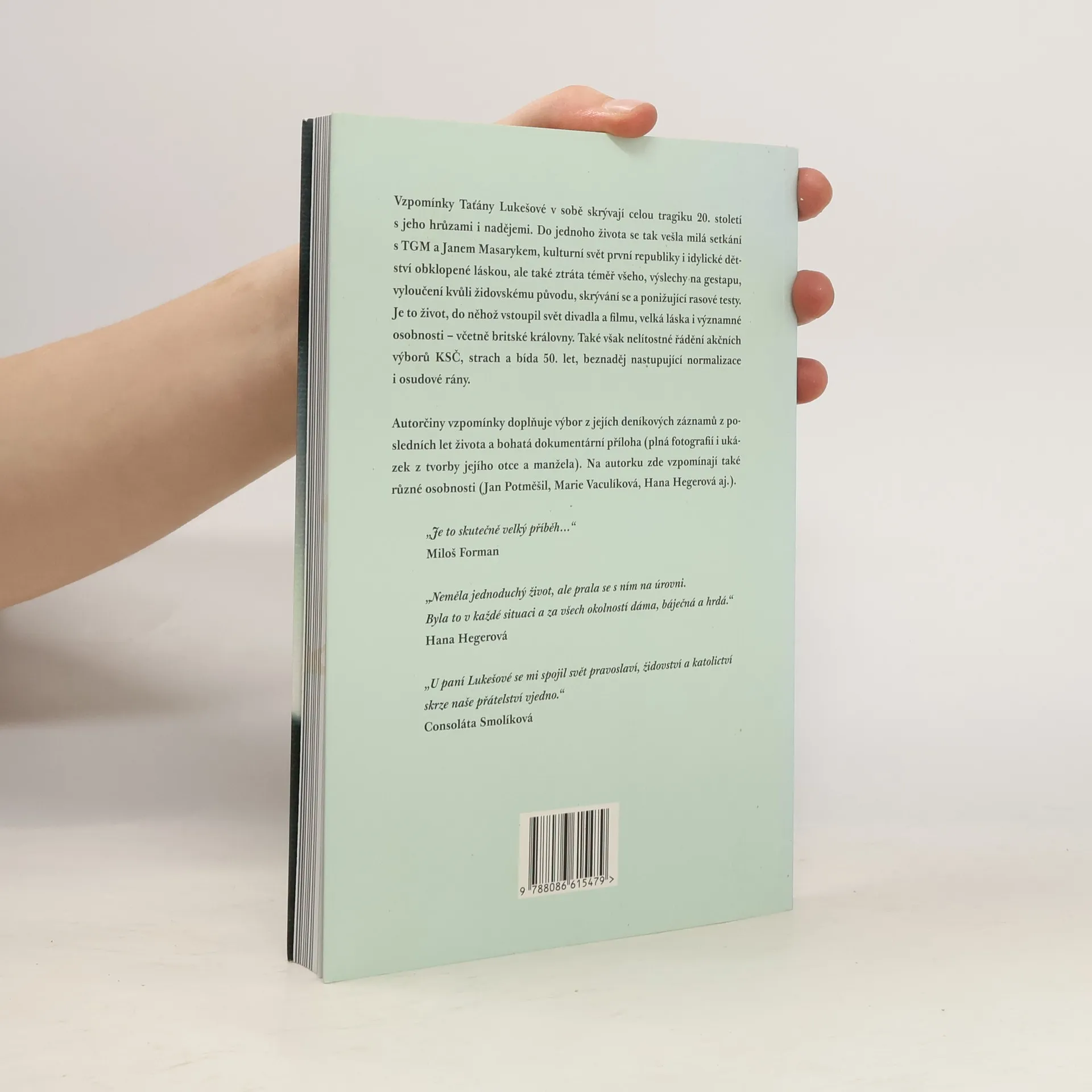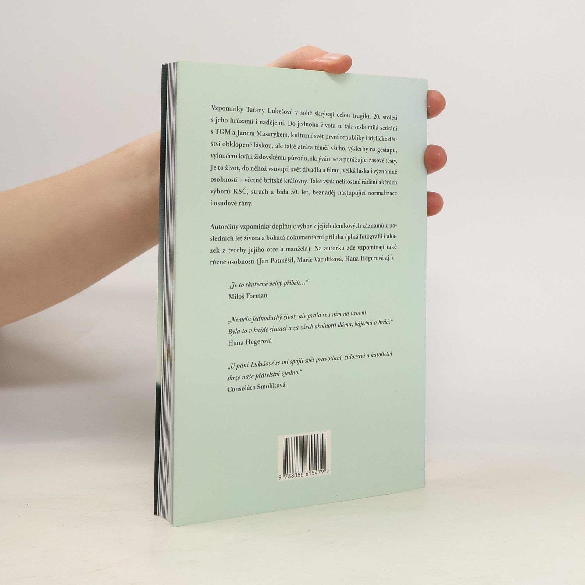 Vzpomínky Taťány Lukešové v sobě skrývají celou tragiku 20. století s jeho hrůzami i nadějemi. Do jednoho života se tak vešla milá setkání s TGM a Janem Masarykem, kulturní svět první republiky i idylické dětství obklopené láskou, ale také ztráta téměř všeho, výslechy na gestapu, vyloučení kvůli židovskému původu, skrývání se a ponižující rasové testy. Je to život, do něhož vstoupil svět divadla a filmu, velká láska i významné osobnosti včetně britské královny. Ale také nelítostné řádění akčních výborů KSČ, strach a bída 50. let, beznaděj nastupující normalizace i osudové rány. Autorčiny vzpomínky doplňuje výbor z jejích deníkových záznamů z posledních let života a bohatá dokumentární příloha (plná fotografií i ukázek z tvorby jejího otce a manžela). Na autorku zde vzpomínají také různé osobnosti (Jan Potměšil, Marie Vaculíková, Hana Hegerová aj.).
