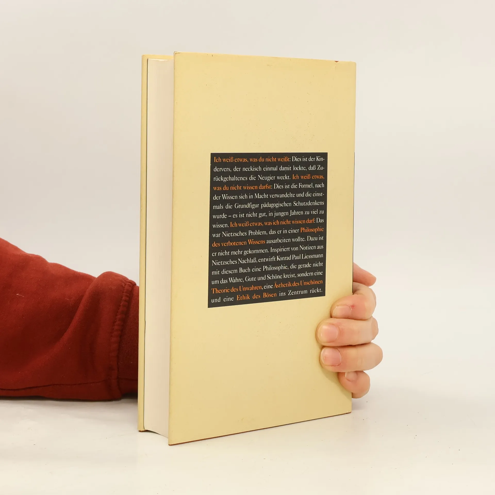 Die Lüge, das Hässliche und das Böse: Drei große Fragen, denen die Philosophie gerne ausweicht. Inspiriert von Nietzsches Nachlass, bricht Konrad Paul Liessmann mit diesem Tabu und entwirft eine Philosophie dieses verbotenen Wissens. Die heutige Brisanz Nietzsches wird spürbar, wenn Liessmann die aktuellen Debatten über Wahrheit, Ästhetik und Moral an der Radikalität eines solchen Entwurfs misst. Die großen Ideologien und die Provokationen der künstlerischen Moderne, aber auch der Zwang zu politischer Korrektheit erscheinen in einem ganz neuen Licht.