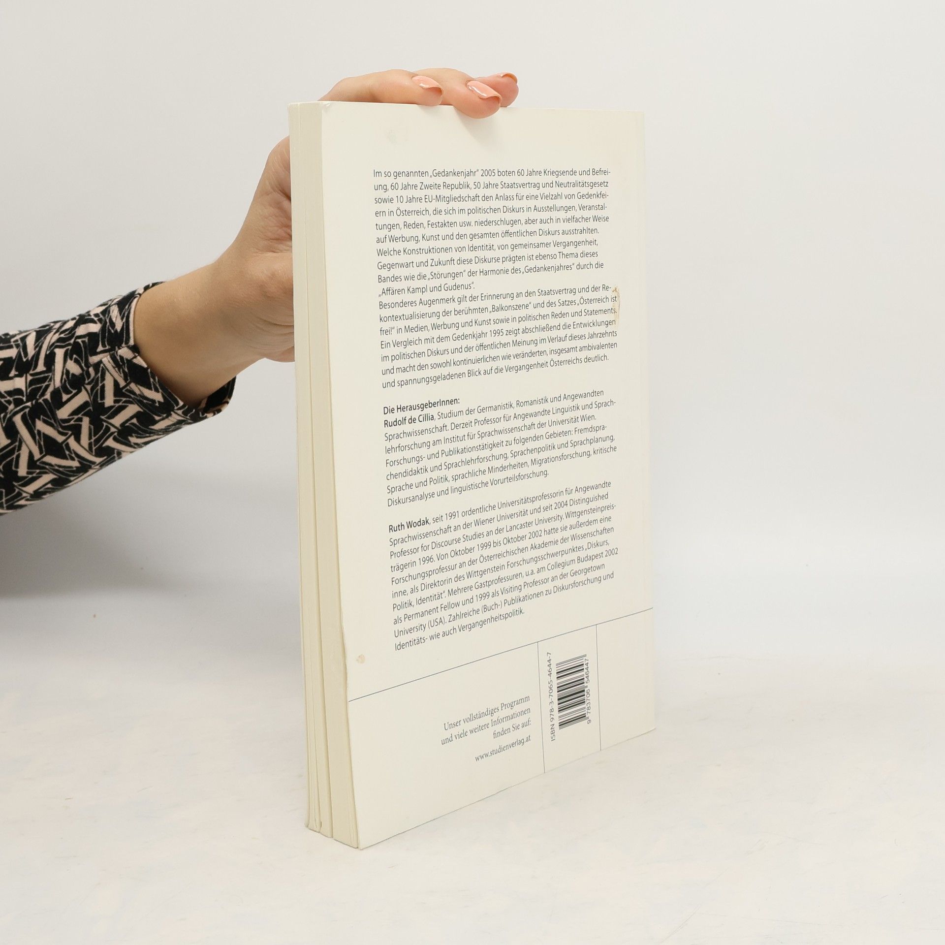 Im Jahr 2005, dem „Gedankenjahr“, wurden 60 Jahre Kriegsende und Befreiung, 60 Jahre Zweite Republik, 50 Jahre Staatsvertrag und Neutralitätsgesetz sowie 10 Jahre EU-Mitgliedschaft in Österreich mit zahlreichen Gedenkfeiern gewürdigt. Diese Anlässe prägten den politischen Diskurs durch Ausstellungen, Veranstaltungen, Reden und Festakte und beeinflussten auch Werbung, Kunst und den öffentlichen Diskurs. Der Band untersucht die Konstruktionen von Identität sowie die gemeinsame Vergangenheit, Gegenwart und Zukunft, die in diesen Diskursen sichtbar werden. Zudem wird auf die „Störungen“ durch die „Affären Kampl und Gudenus“ eingegangen. Ein besonderes Augenmerk liegt auf der Erinnerung an den Staatsvertrag und der Rekontextualisierung der berühmten „Balkonszene“ und des Satzes „Österreich ist frei!“ in verschiedenen Medien und politischen Äußerungen. Ein Vergleich mit dem Gedenkjahr 1995 verdeutlicht die Entwicklungen im politischen Diskurs und der öffentlichen Meinung über das Jahrzehnt hinweg und zeigt den ambivalenten und spannungsgeladenen Blick auf die österreichische Vergangenheit. Die Herausgeber, Rudolf de Cillia und Ruth Wodak, sind Experten für Angewandte Linguistik und Diskursforschung mit umfangreicher Publikationstätigkeit in diesen Bereichen.