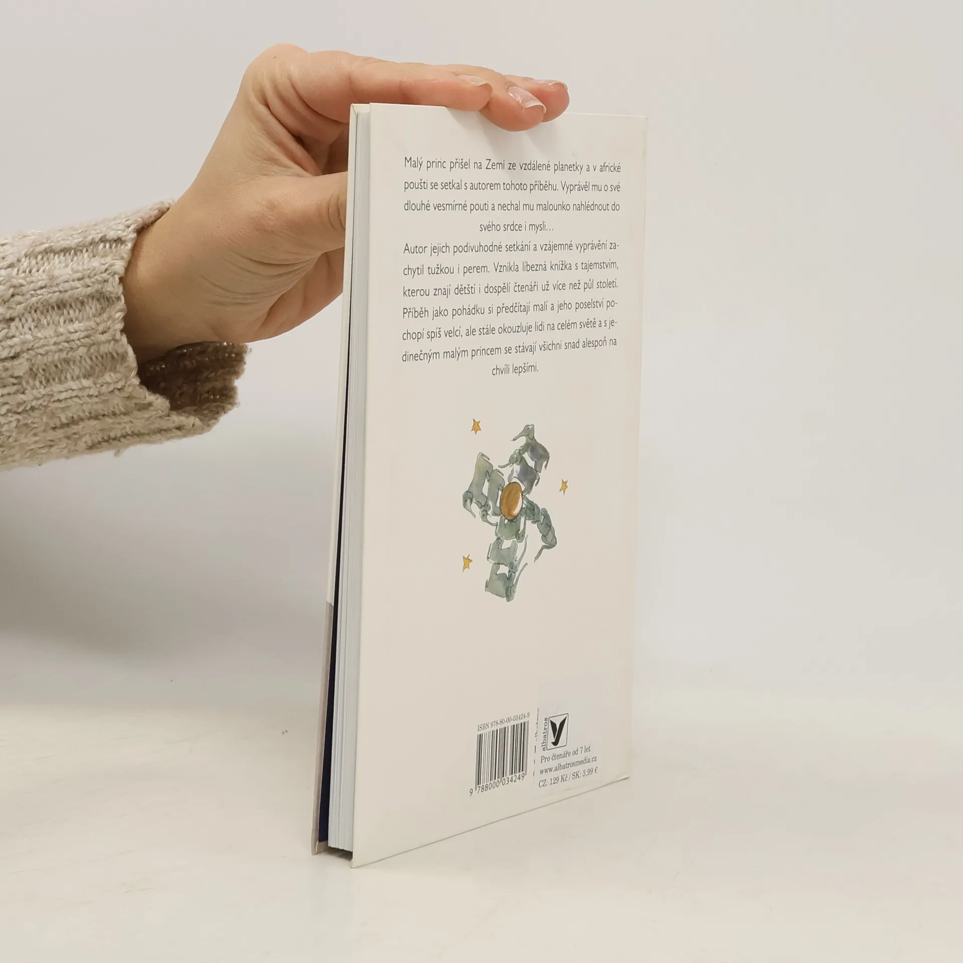 Není princ jako princ. Tenhle je skutečně jen jeden – Malý princ, jedno z nejslavnějších děl moderní světové literatury. S Malým princem se v africké poušti setkává opuštěný letec, autor této knížky. Zatímco se pokouší opravit havarovaný stroj, povídají si o všeličem. O tajemství podivuhodné pouti Malého prince, o dobru a zlu, o přátelství a kráse, o pravém štěstí, o odpovědnosti za ty, které máme rádi. A vůbec nezáleží na tom, odkud pocházíme: Malý princ pocházel z tak malinké planetky, že si to možná ani neumíme představit. Ale věděl, že je třeba chránit květinu, kterou vypěstoval, a že mu to přineslo větší radost než pijákovi plná láhev, podnikateli peníze a panovačnému králi nezměrná moc.
